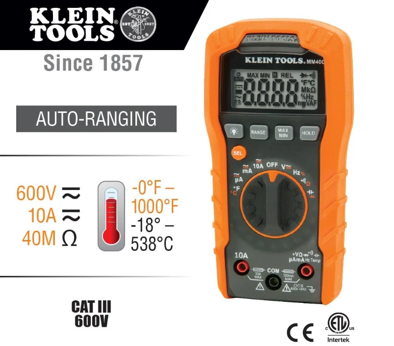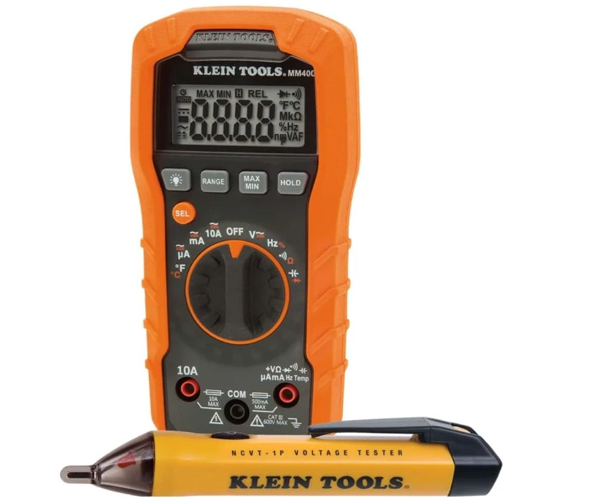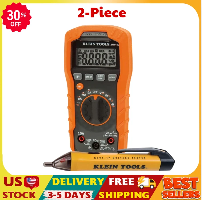 Klein Tools 80117 Multimeter Kit: Digital Multimeter, Voltage Tester Penlight (2-Piece) MULTIMETER FEATURES of the MM400 include measurement up to 600V AC/DC voltage, 10A AC/DC current and 40 MOhms resistance ELECTRICAL TESTER MEASURES temperature, capacitance, frequency, duty-cycle, and test diodes and continuity TRUSTED SAFE with a safety rating of CAT III 600V (Cat. No. MM400) NON-CONTACT VOLTAGE TESTER PEN detects voltage in cables, cords, circuit breakers, lighting fixtures, switches, non tamper-resistant outlets and wires (Cat. No. NCVT1P) BRIGHT GREEN HIGH INTENSITY LED on volt pen indicates the tester is powered on VISUAL AND AUDIBLE INDICATORS of voltage detection with a high intensity, bright red LED, and an audible tone When you receive your order and have any queries or concerns about the product, feel free to message us. We guarantee 100% resolution for you. Our commitment is to provide high-quality products and exceptional customer service, ensuring your trust and satisfaction.