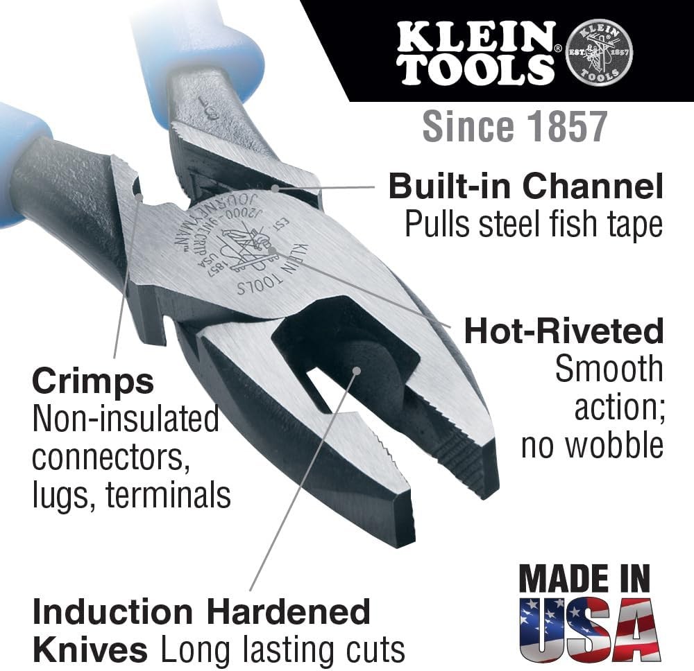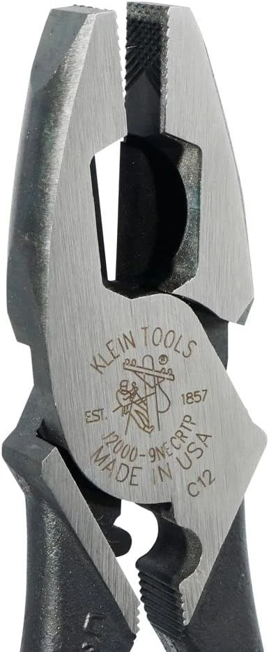 Klein Tools J2000-9NECRTP Side Cutter Linemans Pliers with 9-Inch, Blue/Black Product Details Brand: Klein Tools Material: Alloy Steel Product Dimensions: 10"L x 10"W Color: Blue/Black Handle Material: Alloy Steel Item Weight: 1.1 Pounds Specific Uses For Product: Crimping,Cutter,Gripping,Nails,Pulling Specification Met: ANSI B107.23 Grip Type: Power Cutting Width: 1.25 Inches Manufacturer: Klein Tools Part Number: J2000-9NECRTP Item Weight: 1.1 pounds Country of Origin: USA Item model number: J2000-9NECRTP Is Discontinued By Manufacturer: No Size: 9-Inch Style: Cuts / Crimps / FT Pulling Pattern: Tools Power Source: Hand Powered Item Package Quantity: 1 Included Components: Tools & Accessories Batteries Included?: No Batteries Required?: No Brand: Klein Tools Material: Alloy Steel Product Dimensions: 10"L x 10"W Color: Blue/Black Handle Material: Alloy Steel Item Weight: 1.1 Pounds Specific Uses For Product: Crimping,Cutter,Gripping,Nails,Pulling Specification Met: ANSI B107.23 Grip Type: Power Cutting Width: 1.25 Inches Pliers cut ACSR, screws, nails and most hardened wire High-leverage design. Rivet is closer to the cutting edge for 46-percent greater cutting and gripping power than other plier designs Built-in crimper works on non-insulated connectors, lugs and terminals Built-in channel pulls steel fish tape without damaging the tape Made in USA with Custom, US-made tool steel Hot-riveted joint ensures smooth action and no handle wobble and induction hardened cutting knives for long life Streamlined design with sure-gripping, cross-hatched knurled jaws Product Description These Klein Tools Lineman's Pliers are induction hardened and have a hot-riveted joint for smooth and powerful action without handle wobble. Their unique tempered handle design, with dual material Journeyman handles provide a better grip and absorbs the snap when cutting wire, screws, nails or ACSR. These side-cutting pliers also have cross-hatched knurled jaws, and built in channels for pulling fish tapes without damage. For more than 160 years, Klein Tools has manufactured premium-quality, professional-grade hand tools that deliver the performance, durability and precision needed to get the job done right. Our family of engineers, workers and craftsman continue to put six generations of expertise into every tool we create by using only the highest quality materials, superior workmanship, and keeping manufacturing as close to home as we can. Klein isn't just the name of our company, it's also our family name. And since we're an American company that's family-owned and family-run, you know you can count on us to be here tomorrow. Klein Tools doesn't just make great products, we make great products that stand up to the demands of the professionals who use them every day ... Since 1857. From the Manufacturer High-Leverage Side-Cutting Pliers-Connector Crimping and Fish Tape Pulling. The High-Leverage Side-Cutting Pliers-Connector Crimping and Fish Tape Pulling is the 2000 series that cuts ACSR, screws, nails and most hardened wire. The High-Leverage Side-Cutting Pliers-Connector Crimping and Fish Tape Pulling features the built-in crimper that works on non-insulated connectors, lugs, and terminals; the built-in channel that pulls steel fish tape without damaging the tape; and the innovative dual material Journeyman grips are more comfortable and last longer than other handles.