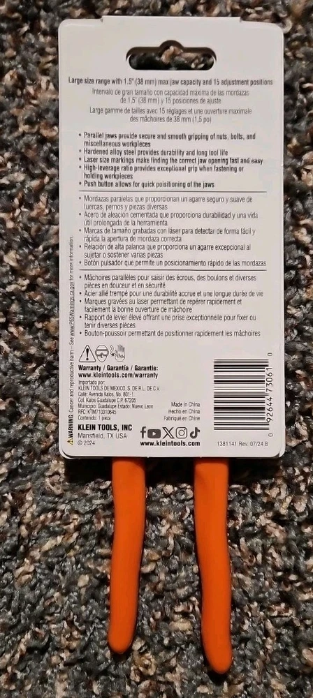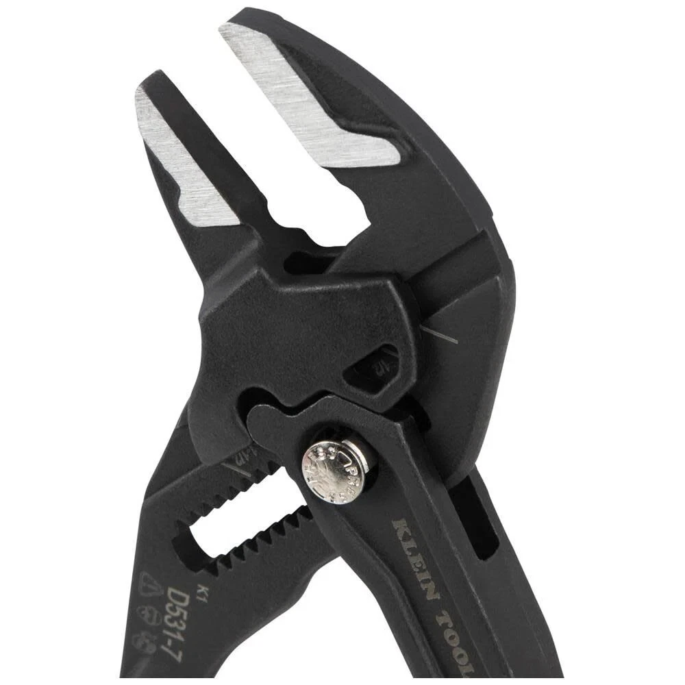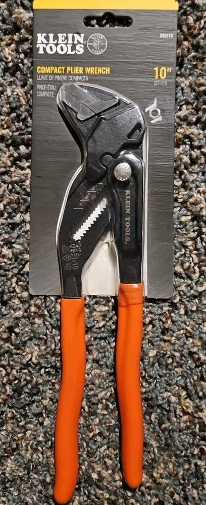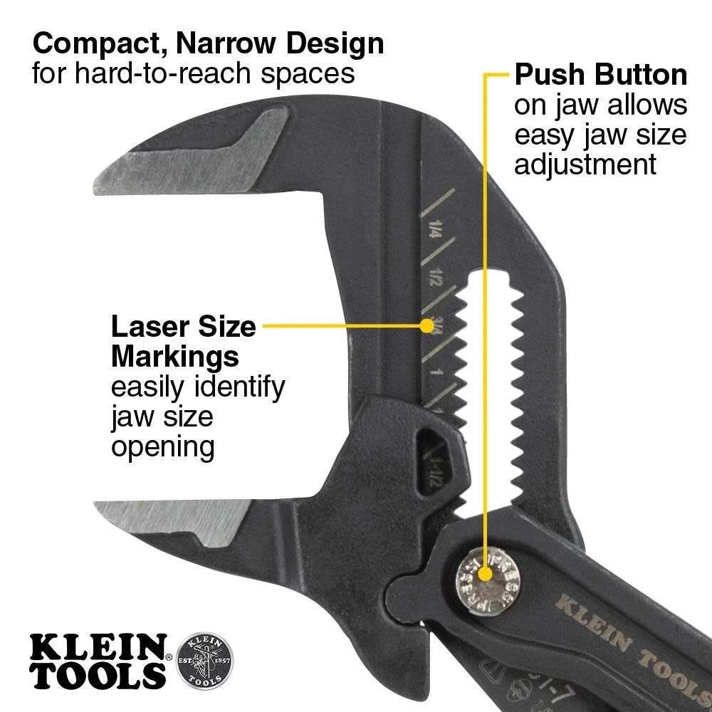 Klein Tools Compact Plier Wrench Set 7 inch D5317 and 10 inch D53110 *Compact Plier Wrenches feature parallel jaws for a secure, smooth grip on nuts, bolts, and workpieces, ensuring damage-free operation. *Jaw features smooth jaws for damage-free installation. *Quick-adjust button allows for quick and easy, one-handed adjustment of plier jaws. *Adjustable plier wrench features a high lever ratio, providing exceptional grip for holding or bending various workpieces. *Compact, narrow design for easy work in small or hard to reach spaces. *The 7-Inch Pliers (Cat. No. D5317) have a 1-1/2-Inch jaw opening with 15 positions, and the 10-Inch Pliers (Cat. No. D53110) have a 2-Inch jaw opening with 19 positions, ensuring maximum versatility. *Laser size markings make finding the correct jaw opening fast and easy.