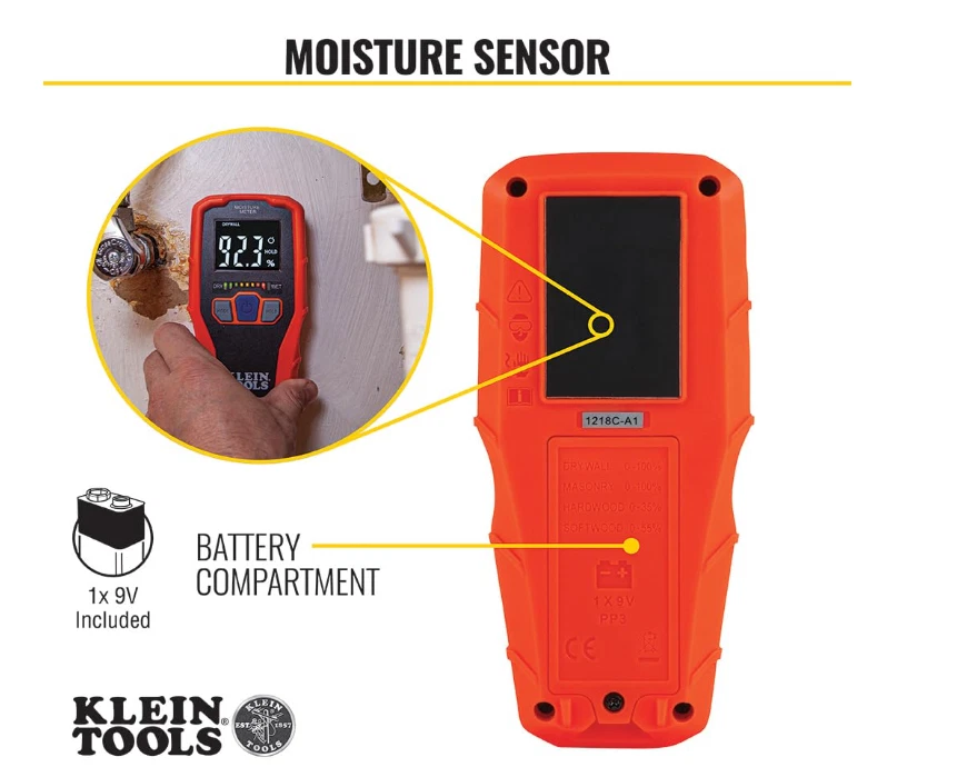 Klein Tools ET140 Pinless Moisture Meter - Detects 3/4"" Below Surface WATER LEAK DETECTOR detects relative moisture content from leaks and flooding PINLESS MOISTURE METER measures relative moisture content in building materials NONDESRUCTIVE DETECTION up to 3/4-Inch deep using Electromagnetic field (EMF) technology USE ON DRYWALL, MASONRY, HARDWOOD, AND SOFTWOOD; calibrated for these materials only REVERSE-CONTRAST DISPLAY for easy viewing of reading and nine LED bars to indicate moisture range FULL FEATURE TOOL includes hold, low battery, and auto-power off functions COMPLETE MOISTURE METER KIT includes meter with 2m drop protection, 9V battery, and instruction manual When you receive your order and have any queries or concerns about the product, feel free to message us. We guarantee 100% resolution for you. Our commitment is to provide high-quality products and exceptional customer service, ensuring your trust and satisfaction.