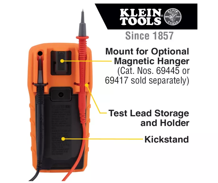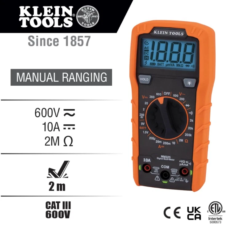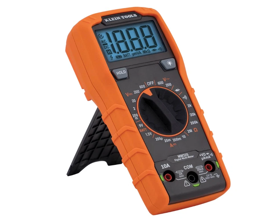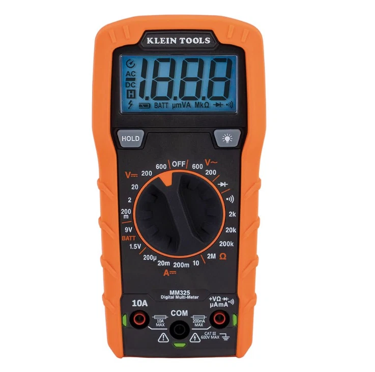 Klein Tools MM325 Multimeter: Digital 600V Voltage Tester for Batteries, Current, Resistance, Diodes VERSATILE FUNCTIONALITY: Measures AC/DC voltage up to 600V, 10A DC current, 2MΩ resistance; additional features include continuity, diode test and battery test LEAD-ALERT PROTECTION: LEDs on the meter illuminate to indicate proper test lead placement, enhancing accuracy and safety during measurements BACKLIT DISPLAY: LCD shows clear readings in low-light conditions for enhanced visibility BATTERY TEST: Battery test mode can be used for checking if batteries are working CONVENIENT FEATURES: Test lead holders on the back of the meter, kickstand and optional magnetic hanger (Cat. Nos. 69445 or 69417) for hands-free operation DURABLE CONSTRUCTION: Built to withstand a 6.6-Foot (2 m) drop, for use in basic and controlled electromagnetic environments such as residential, business and light-industrial locations When you receive your order and have any queries or concerns about the product, feel free to message us. We guarantee 100% resolution for you. Our commitment is to provide high-quality products and exceptional customer service, ensuring your trust and satisfaction.