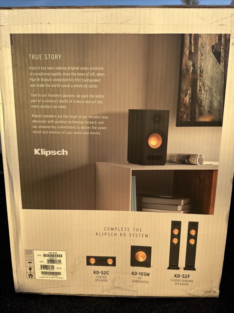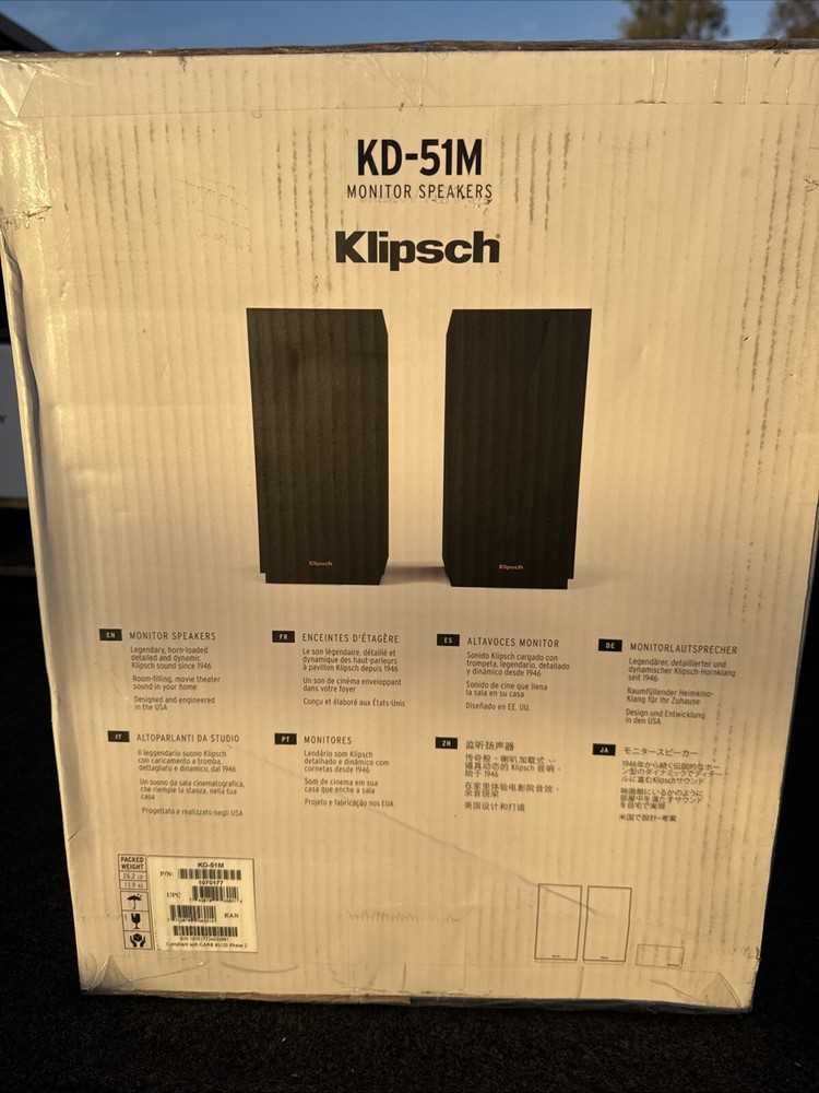 Klipsch KD-51M Passive 160W Bookshelf Monitor Speakers (Pair) Black- SEALED The Klipsch KD-51M Bookshelf Speaker Pair in Black is a set of passive monitor speakers with a high efficiency of 160W RMS power. Featuring a rectangular shape, wired connectivity, and low distortion, these speakers are designed for home audio use. With dimensions of 9.92" x 13.90" x 7.52" and weighing 12 lbs, this 2022 model from Klipsch offers powerful and clear sound reproduction. · · · SHIPPING · · · Get free shipping on your order! We ship via reliable carriers like UPS, FedEx, and USPS We ship to the continental US (excluding PO boxes and APO/FPO addresses) Orders are usually shipped within 3 days or less. Items valued at $50 or more are subject to signature request. High value/special items are recorded with images by their unique serial number. Tracking number is sent personally to each customer. · · · RETURNS · · · Returns are accepted within 7 days of purchase Items must be in original condition and packaging- NO EXCEPTIONS · · · PAYMENTS · · · We accept all payment methods through eBay's payment system Please pay promptly after winning an auction so we can ship your item faster · · · FEEDBACK · · · Customer satisfaction is a top priority for us. If you have any issues with your order, please let us know. We will make every effort to resolve any problems and ensure you are satisfied. · · · Contact US · · · We appreciate your business. If you have any questions, please message us through eBay and we will respond within 24 hours on weekdays. Feel free to browse our eBay store for other available items. Thank you again for choosing to shop with us! · · · Suggested Products · · · Bose Smart Soundbar 700: Premium Bluetooth w/ Alexa Voice Control Built-in Black $445.00 Sony HT-A5000 5.1.2ch Dolby Atmos Sound Bar- New - Free Shipping $390.00 12" Klipsch High-Performance Wireless Subwoofer R-120SWI ( 2023 model ) $200.00 Samsung HW-B73CD 5.1 Channel B-Series Soundbar w/Wireless Subwoofer $135.00 Sony HT-SC40 2.1 Channel Soundbar Wireless Subwoofer, Dolby Audio, Home Theater $99.00 Sony Network Speaker SA-NS300 New in Open Box $29.99 Add suggested items to your listings - Check it out on 3Dsellers.com eBay listing template by 3D sellers.com - Try for Free!