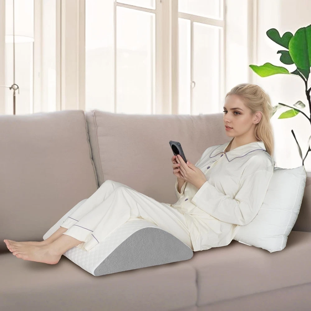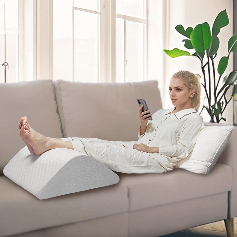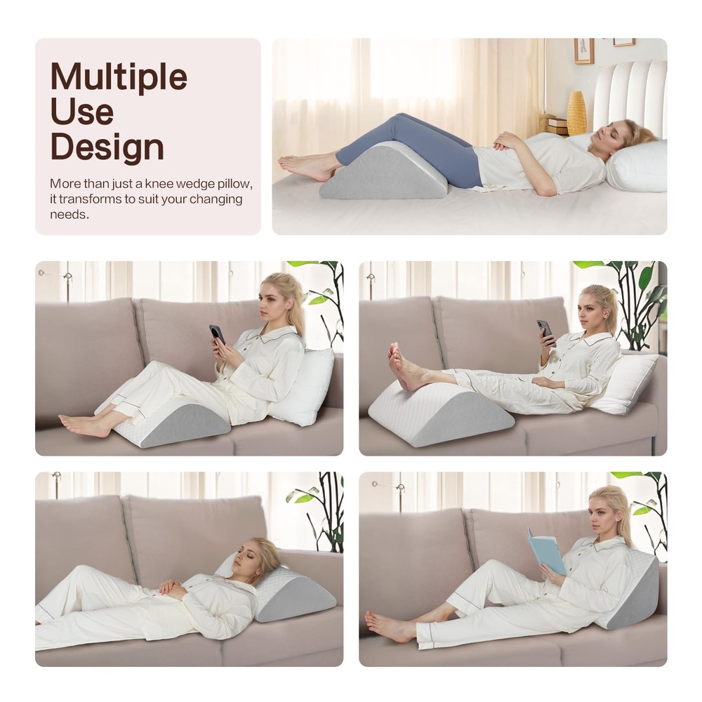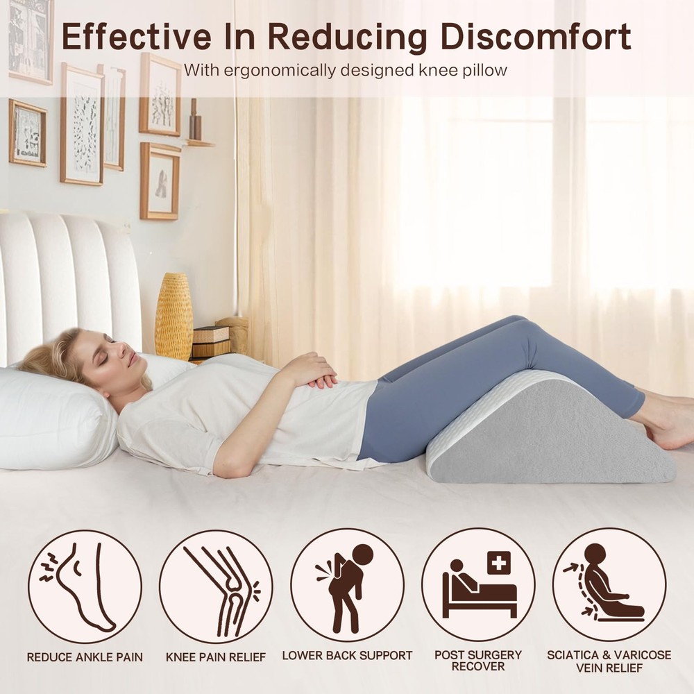 knee pillow for back sleeping Provides Support and Comfort:Made of CertiPUR-US certified foam, the right firmness is both properly supportive for the body and comfortable for sleeping. The knee wedge pillow conforms to the body, providing support for the head, back, feet, knees and ankles, relieving pain, promoting sleep and allowing the body to relax. Breathable and Washable Cover:The air-layer fabric knee pillow cover ensures good air circulation to keep you feeling cool and comfortable all night long. The zipper design is easy to wash, so you can easily keep your wedge pillow fresh and clean. The pillowcase is Oeko-Tex Standard 100 certified, skin-friendly and more comfortable to use. Multi-Use Design:Optimal support for the knees, hips and lower back can be provided by adjusting the angle and position of the leg elevating pillow placement to meet different needs. Triangle pillow can improve circulation by elevating the leg, reducing the risk of swelling and discomfort, and can also be used to relieve pain after surgery. Ergonomic Pillow:Our leg wedge pillows are ergonomically designed for a variety of different people, both men and women. Perfect for side sleepers, pregnant women and those recovering from surgery. The contoured shape of the leg elevation pillow conforms to the body to provide optimal support, evenly distributing weight and reducing pressure on the back. Versatility for Daily Use:Bolster pillow for legs can be widely used in daily life for a variety of scenarios. Whether you use it in bed, on the sofa, on the floor, or use it for sleeping, sitting, working, reading, you can always find a comfortable position for yourself with knee wedge pillow.Meet different needs and relieve fatigue and discomfort.