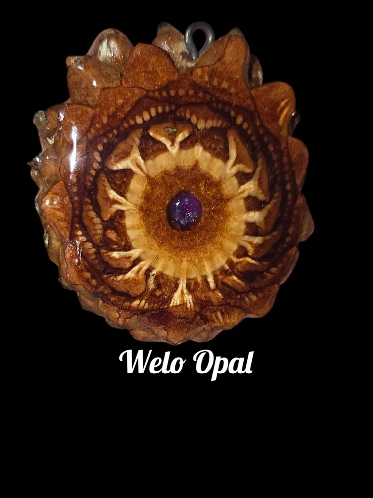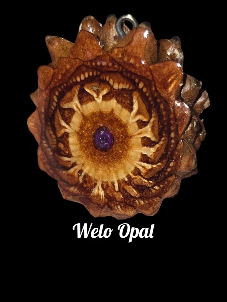 This unique pendant features a beautiful oval-shaped knobcone (THIRD EYE) design with a stunning fire opal. The pendant is handmade and reversible, with an adjustable cord chain that measures 22 inches in length. The charm-style pendant is perfect for any occasion, whether it's a special event like a wedding or graduation or an everyday accessory. The pendant is crafted from wood and stone materials, with a flush setting style that showcases the natural creation of the opal. The gemstone clarity grade is heavily included, with a fair cut grade. The pendant is nickel-free and comes with a lobster closure. This pendant is a perfect gift for any beauty or love-themed occasion, such as Mother's Day, Valentine's Day, or Birthday. Secondtimearound Pinecone Talismans represent a reclamation of the emblematic power and natural beauty of the Pinecone, the Pineal Gland, and the ancient historical heritage accompanying one of Mother Nature's most compelling organic symbols. Secondtimearound Necklaces and Talismans are made from the polished cross-section of a living pinecone, sustainably harvested in unique micro climates, and specially cut, dried, cured and encased in protective resin. They are elegant, natural, and unique and symbolize the evolution of collective consciousness while harnessing the potent spiritual energy of the Pineal Gland and of the Third Eye.