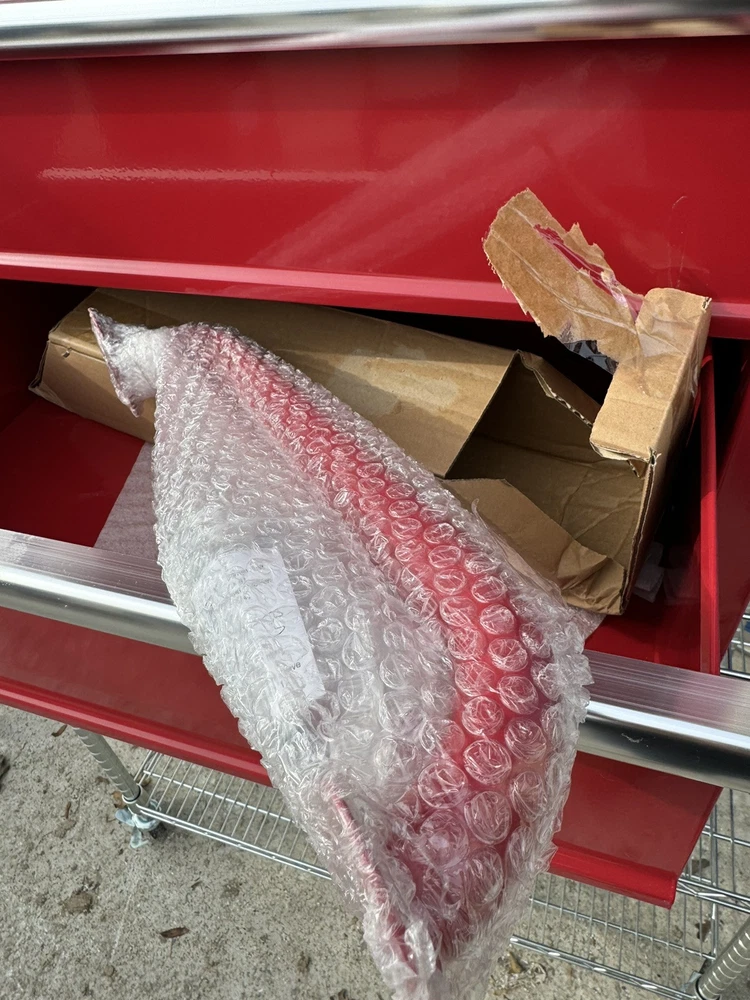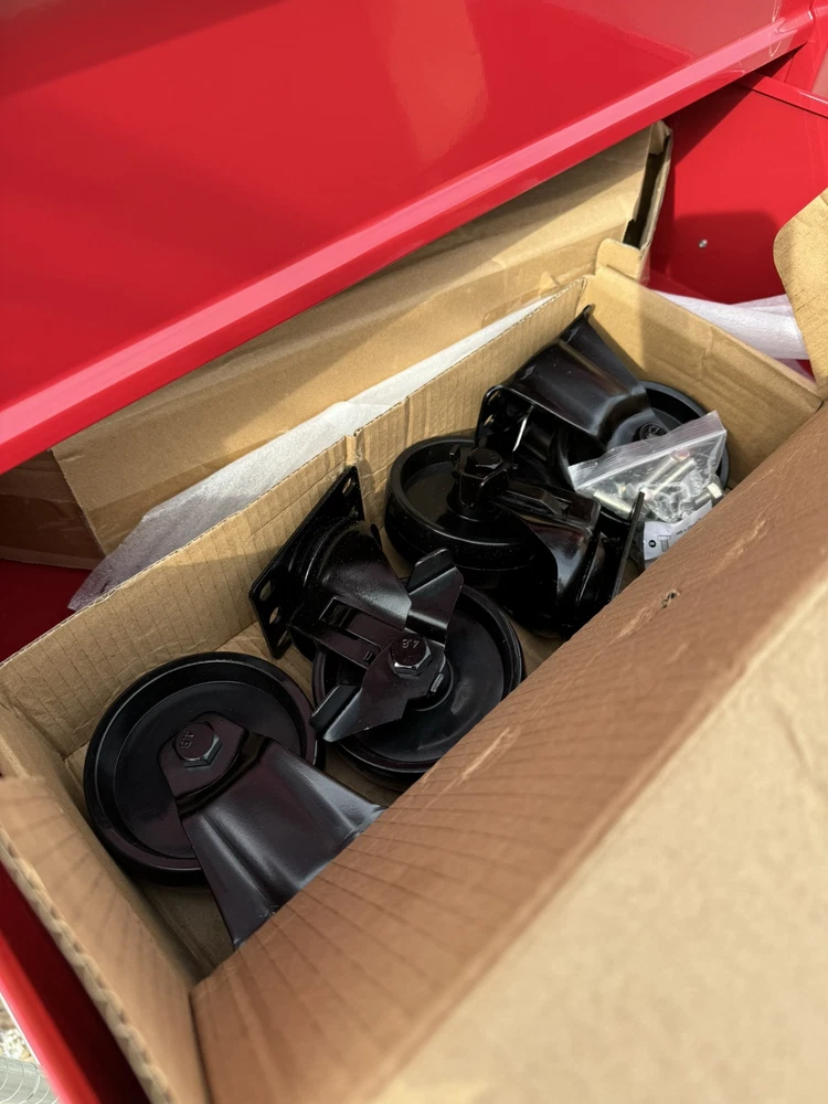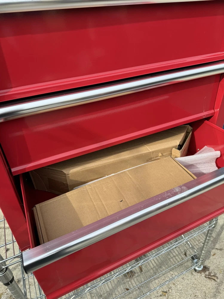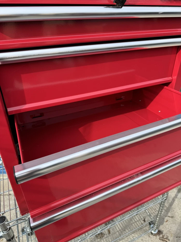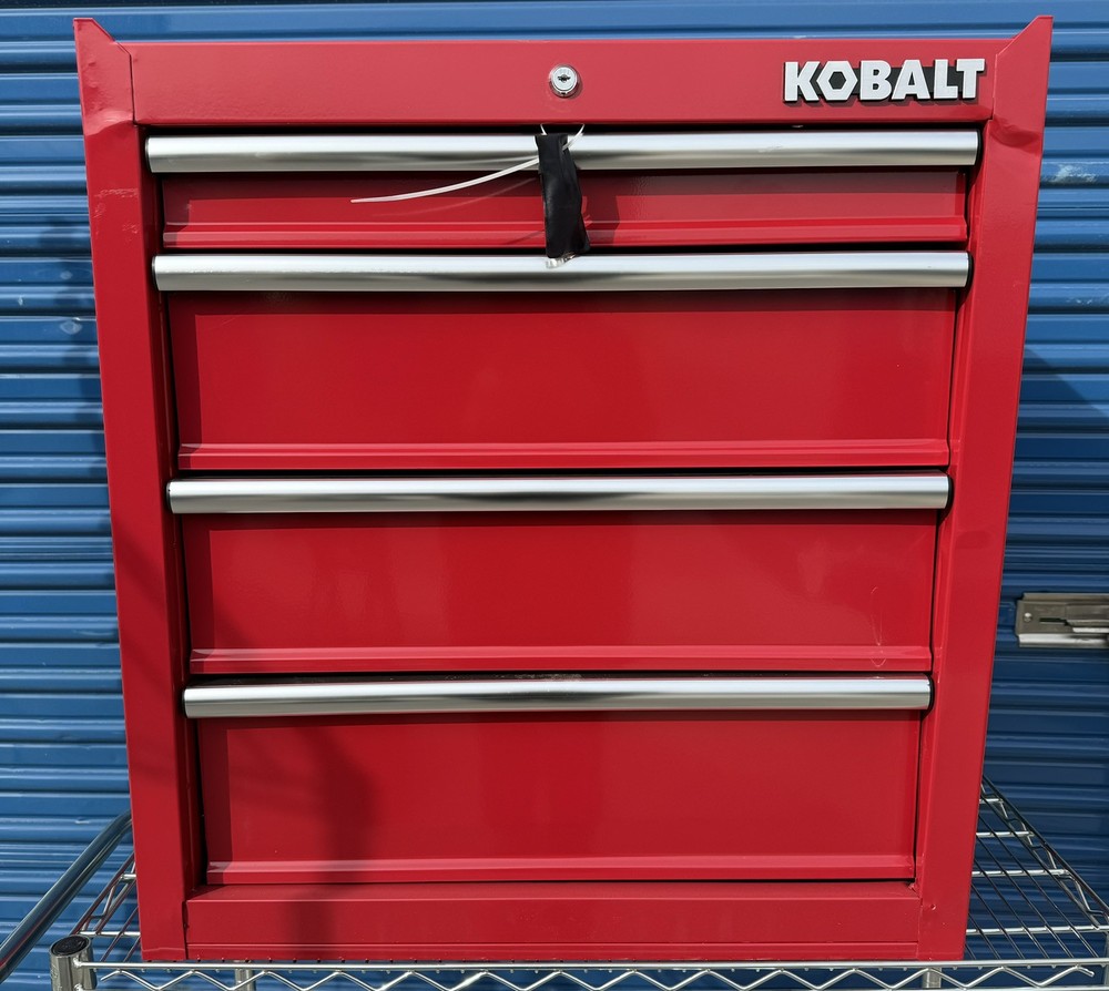 The Kobalt 26-In 4-Drawer Red Cabinet is great for storing and organizing all your tools and hardware. The unit is made from high grade all welded steel construction with a tough, rust-resistant powder coat finish. 4 Drawers are all full-extension and glide New conditions but has a dent while shipping in the lower right back side effortlessly on ball-bearing slides that can support up to 50 lbs. An ergonomic handle and 4 in. x 1.25 in. casters allow you to easily move your cabinet around your workspace. Total weight capacity of the unit is 600lbs. The cabinet has lock system for added security. Pair this cabinet with the Kobalt 26-In 4-Drawer Red Chest (item: 5215660, sold separately) to create the ultimate tool storage solution. • 50 pounds full extension drawers • 4 Different sized drawers for storing and organizing all your tools and hardware • All welded steel construction with a tough, rust-resistant powder coat finish • 4 in x 1.25in heavy-duty casters ( 2-fixed, 2-swivel with toe locks) can support up to 600 lbs • Red steel tubular side handle for easily moving the cabinet around workspace • Pre-cut drawer liners for better protect chest from scratching • Full width aluminum chromed trim drawer • Non-slip open weave top mat protects the surface of the rolling cabinet • Built-in keyed lock keep your tools and hardware safe •Depth (Inches) 18.1 • Drawer Weight Capacity (lbs.) 50 • Height (Inches). 33 • Height without Casters/Wheels (Inches) 28.5 • Item Weight Rating Heavy-duty - 401 to 600 lbs • Maximum Capacity (lbs.) 600 • Total Weight (lbs.). 83 • Assembly Required. Partial • Caster Type. Swivel • Drawer Slide Type. Ball-bearing • Durability. Heavy duty • Full-Extension Drawers. Yes • Liner Material. PVC • Liner(s) Included. Yes • Lock Type. Built-in lock • Locking. Casters/Wheels. Yes • Number of Casters/Wheels. 4 • Number of Deep Drawers 4 For local pick up in fort worth, TX