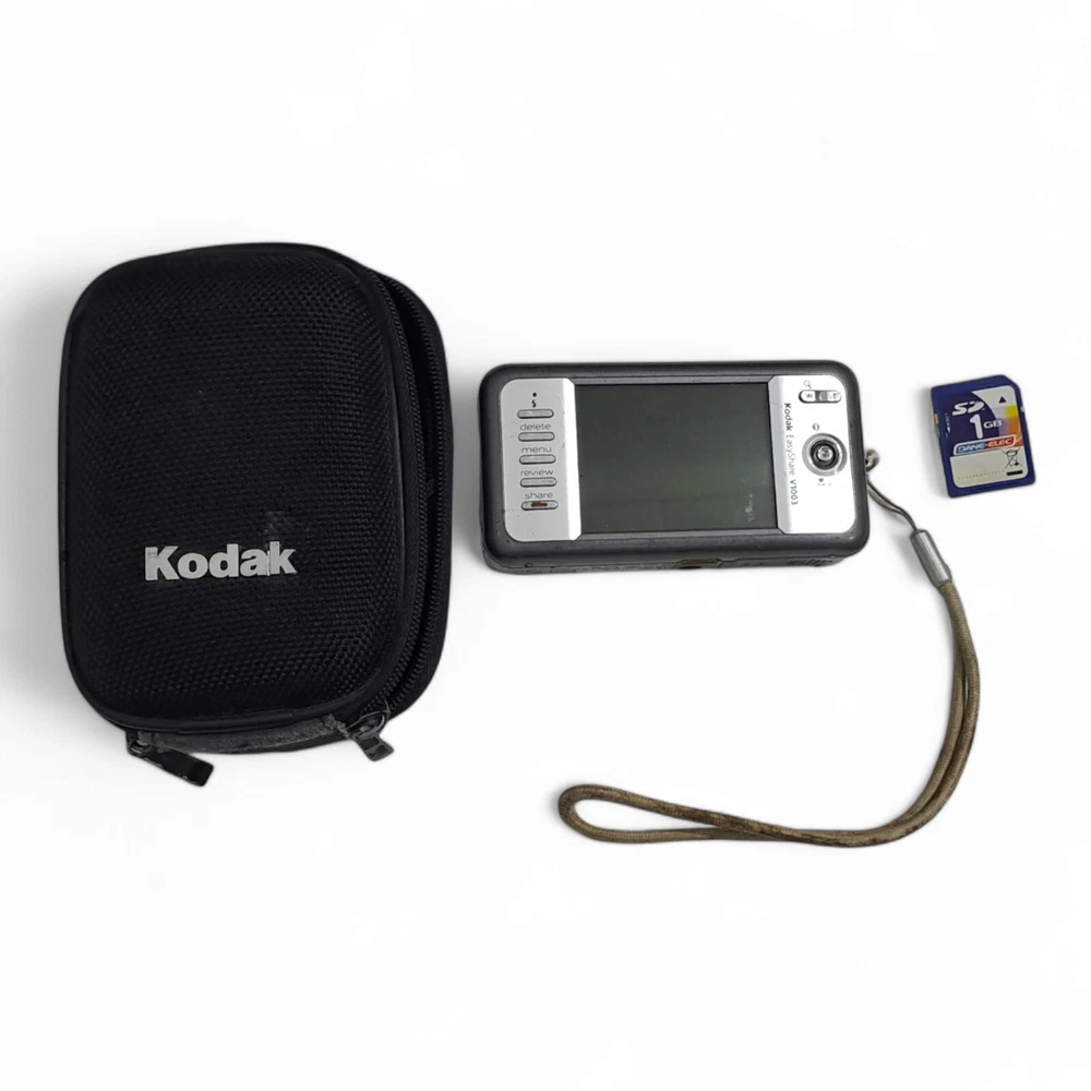 Kodak EasyShare V1003 Digital Camera in Gray. Enjoy its 10.0 MP maximum resolution and 3x optical zoom lens for crisp and clear images.has a 2.5-inch The camera is powered by a Lithium-Ion battery and can connect via USB. It comes with a 1GB SD card and battery no charger or case are included . The lens make some noises when you turn the camera on or when you shooting a video or trying to take a picture and noises can be heard when you see the video you recorded