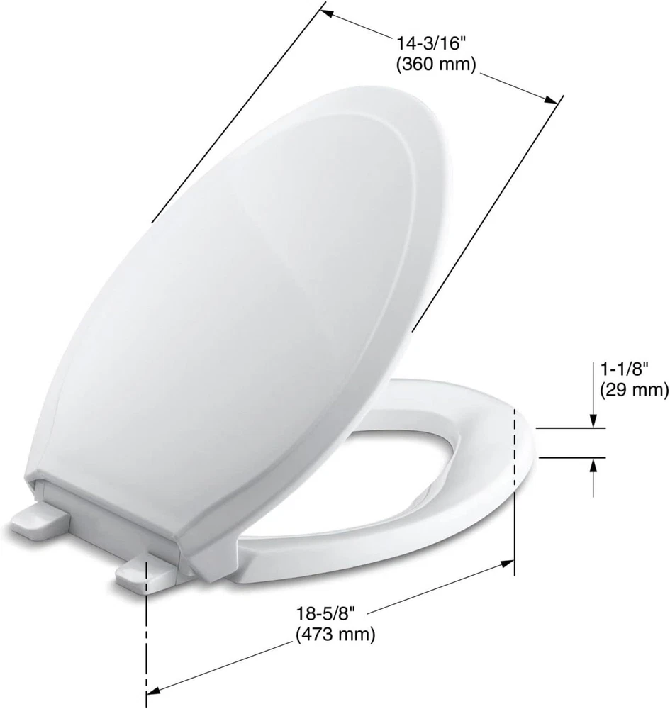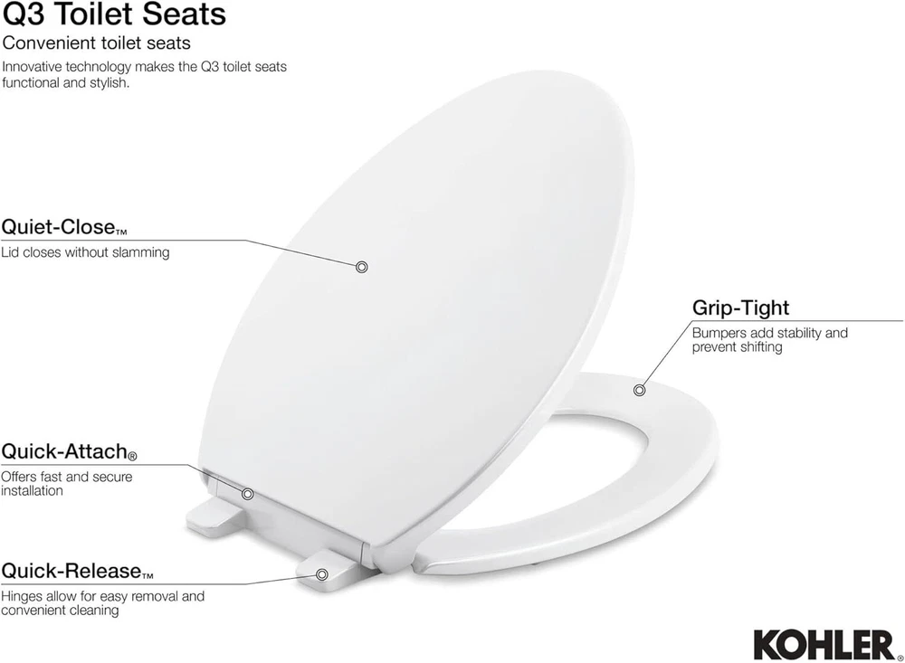 No Slam Elongated Toilet Seat: Rutledge Quiet Close Toilet Seat features a quiet-close lid that closes slowly and silently without slamming; the seat comes with a ReadyLatch hinge that provides a positive lock/unlock latch to securely hold seat in position, White Shift Prevention: Grip-tight bumpers prevent the toilet seat from shifting during use and add stability; it features a contoured, closed-front seat for added comfort and an eye-pleasing design to complement your bathroom decor Easy to Clean Kohler Toilet Seat: Quick release hinges allow for easy removal and convenient toilet cleaning; to clean, simply use a soft, dampened sponge or cloth; never use an abrasive material such as a brush or scouring pad Effortless Install: Quick-attach hardware for fast and secure installation, with color matched plastic hinges included Elongated Toilet Seat: Fits most elongated toilets; for non-residential application recommend using K-7671 or K-20110 Kohler toilet seats Material Plastic Style Non Ready Latch Shape Elongated Product Dimensions 14.56"L x 14.17"W Item Weight 5 Pounds Operation Mode Manual UPC 650531470904 827165719581 784497433540 Global Trade Identification Number 00650531470904 On Feb 7, 2025 at 01:05:09 PST, seller added the following information: