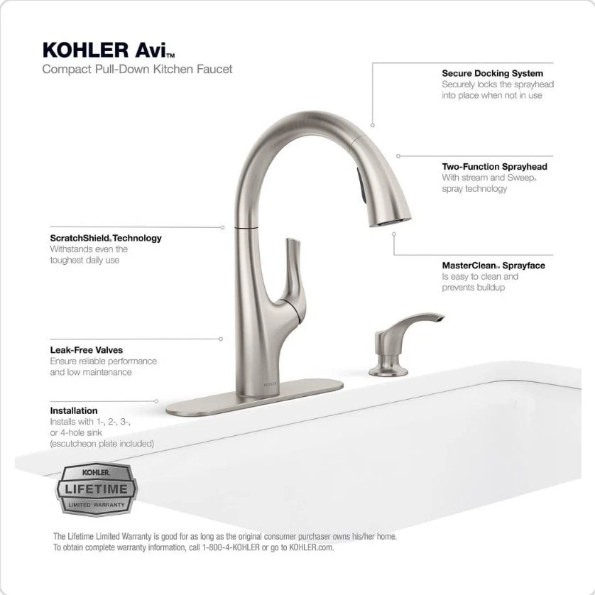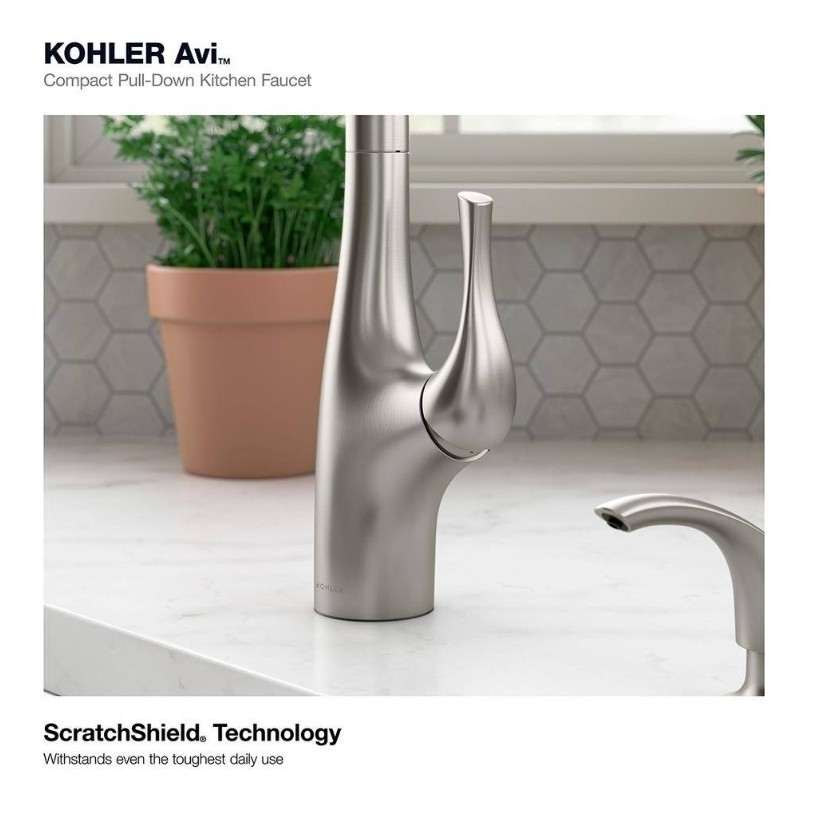 Upgrade your kitchen with the Kohler Avi R27141-SD-VS Single-Handle Pull-Out Kitchen Faucet in Vibrant Stainless. This modern faucet features a high-arc shape and a lever handle for easy use. The deck-mounted faucet is suitable for kitchen sinks and has one to four faucet holes. The Kohler Avi faucet comes with a soap dispenser and deckplate for a complete look. Made of metal, this faucet is durable and perfect for everyday use. The vibrant stainless finish adds a touch of elegance to your kitchen. Bring simplicity and functionality to your kitchen with the Kohler Avi R27141-SD-VS Single-Handle Pull-Out Kitchen Faucet.