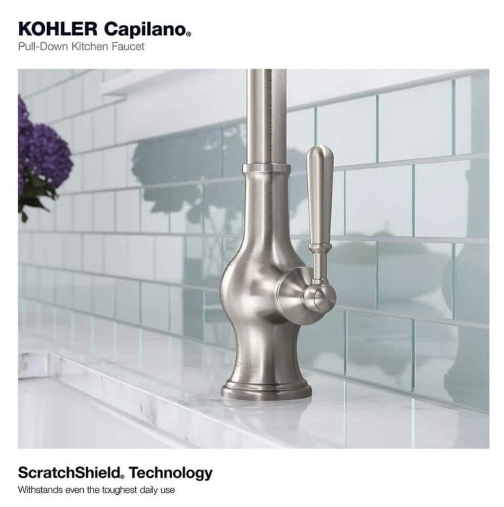 Upgrade your kitchen with the Kohler Capilano Pull-Down Kitchen Faucet with Boost Tech in Vibrant Stainless. This modern faucet is designed for residential use and features a high-arc shape, ceramic valve material, and a pull-down hose for easy use. The faucet is suitable for a kitchen sink and has a single-hole mounting type with a 3/8-inch connection size. The Kohler Capilano faucet comes with a soap dispenser and supply lines included, and has a spout swivel type of 180 degrees. It has a water conservation feature and a flow rate of 1.5 gallons per minute. The faucet is low lead compliant and has a sleek stainless steel finish. Boost your kitchen's functionality and style with the Kohler Capilano Pull-Down Kitchen Faucet.