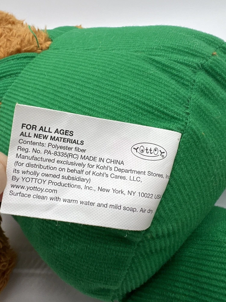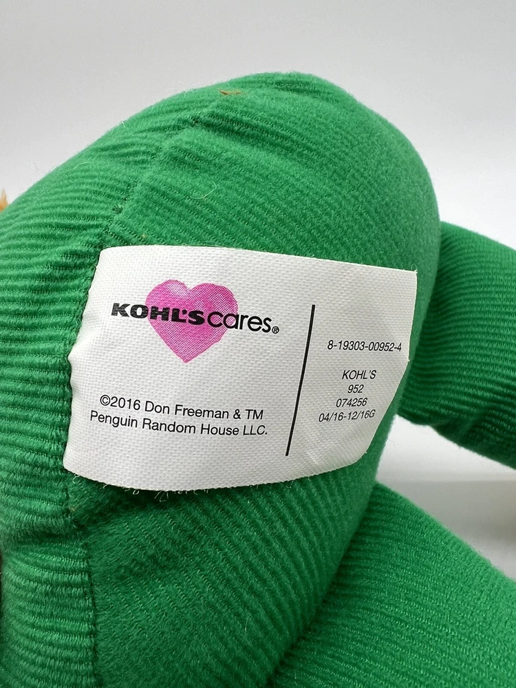 Occasion:AllLanguage:EnglishColor:GreenType:Beargtin13:819303009524Modified Item:NoAuthor:Don FreemanRecommended Age Range:1+Country/Region of Manufacture:ChinaBrand:Kohl's Cares for KidsSize:Medium (14-24 in)Year:2016UPC:819303009524Animal:BearAge Level:3-4 Years, 4-7Character Family:BearsTitle/Series:CorduroyFeatures:Retired, Washable