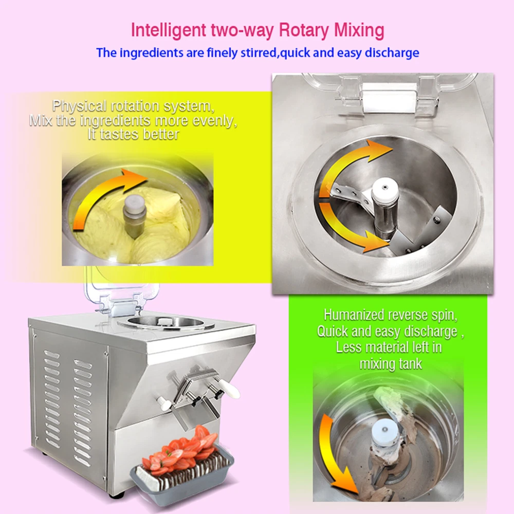 Kolice Commercial Gelato Hard Ice Cream Machine, Italian water ice machine. 110V 60HZ, power: 1000w, US plug. Touch control panel, timer control, smart temperature control, one-key automatically running, current overload protection, auto washing. Food grade stainless steel, dimensions :22.83''x20.28''x17.72''(58x51.5x45cm), net weight: 112 lbs(51kg), production capacity: 20L/ hour(5.5 gallon/hour), cylinder: 5.8L, 18-25 minutes per batch. New design model, transparent top cover, mixing process visible, easy to open and close, can add fresh fruits, nuts, jam, chocolate beans, etc from the top while running the process, two ways to get the ice cream- A: from dispenser automatically and B: from top by manual. Plywood case packing, high quality commercial compressor, already filled in full refrigerant before packing. ETL certificate Widely be used in ice cream shops, western restaurants,bars, cafes, milk-tea stores, restaurants, hotels, bakeries,food trucks, trailers and so on.