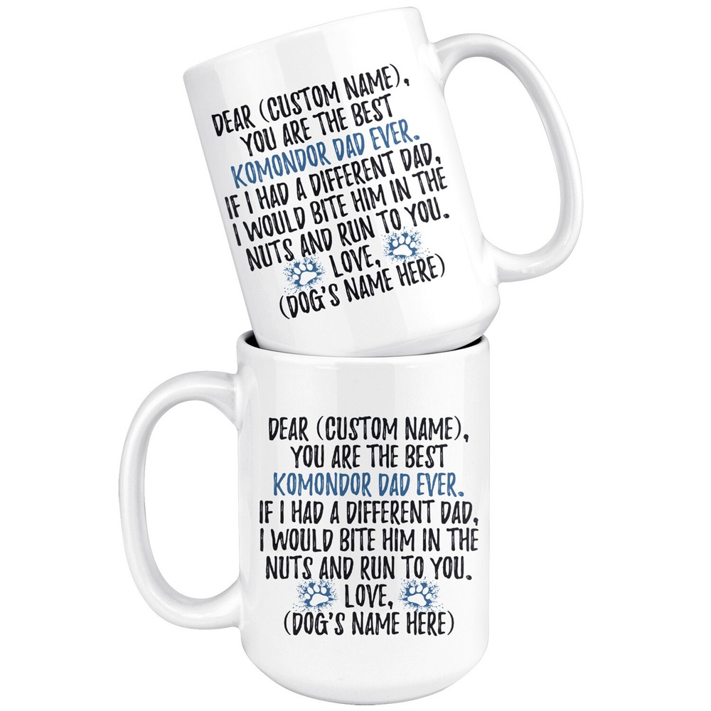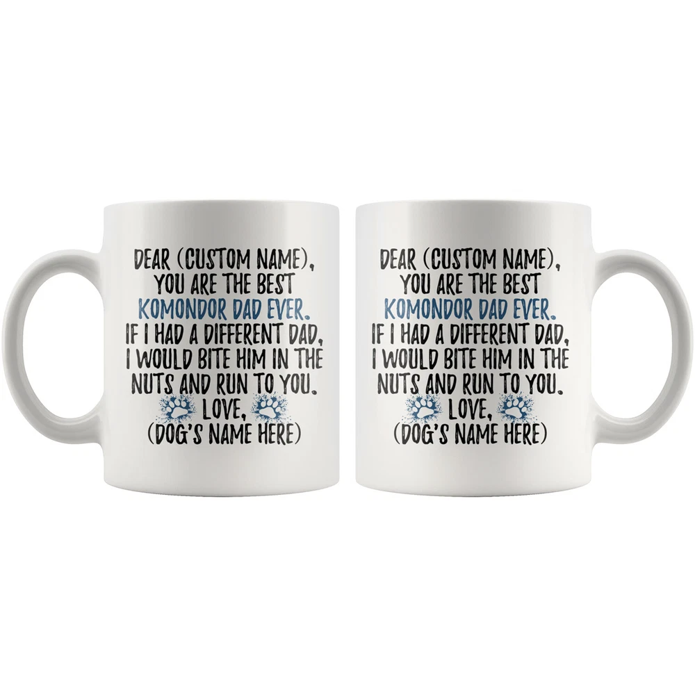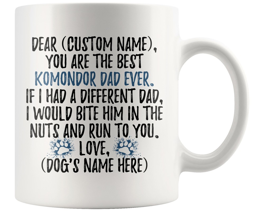personalized komondor dog mug, komondor coffee mug, komondor gifts, komondor dad gift, komondor dog gifts, komondor owner mug, i love komondor, custom komondor gift, komondor daddy mug, komondor coffee cup, fathers day gift This is the perfect Komondor coffee mug with content "DEAR 'CUSTOM NAME', YOU ARE THE BEST KOMONDOR DAD EVER. IF I HAD A DIFFERENT DAD, I WOULD BITE HIM IN THE NUTS AND RUN TO YOU. LOVE, 'DOG'S NAME HERE' ". PERFECT FUNNY GIFT FOR A KOMONDOR DAD! This special coffee cup can be a great gift for every Komondor dad. DISHWASHER AND MICROWAVE SAFE! This version of ceramic mug shows it's true colors with quality assurance to withstand heat in the microwave and put it in the dishwasher as many times as you like, the quality will not be Altered. THE MUG DESIGN IS PRINTED ON BOTH SIDES! No matter if you hold your teacup in your right or left hand, you and everyone else will be able to see this unique design. Looking at this cute coffee mug will put a smile on everyone's face! CUSTOM DAD'S NAME AND DOG'S NAME Please choose the mug size and put the dad's name and dog's name in the notes at the checkout. By not doing this, it will delay your order. Example: Dad's Name: Bill; Dog's name: Charlie We want you to be 100% satisfied, so please let us know if there is anything wrong with your order so we can fix it right away.