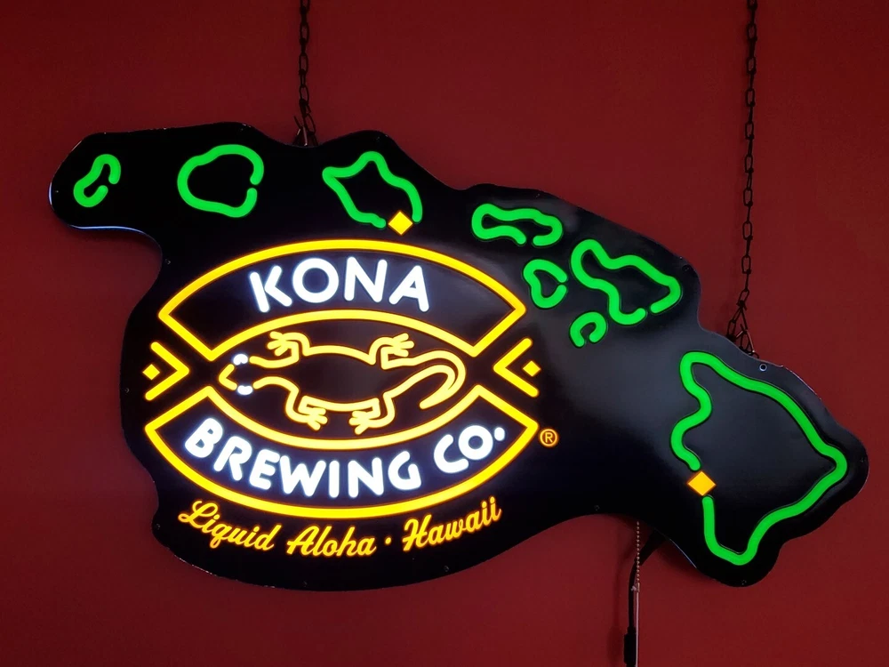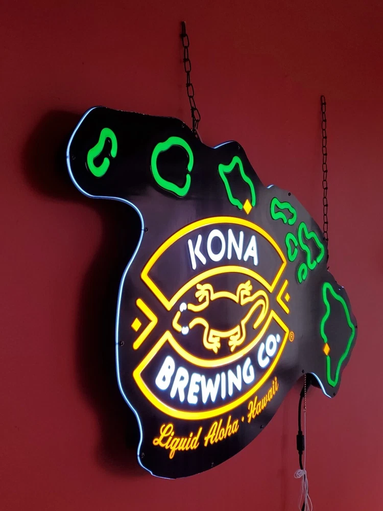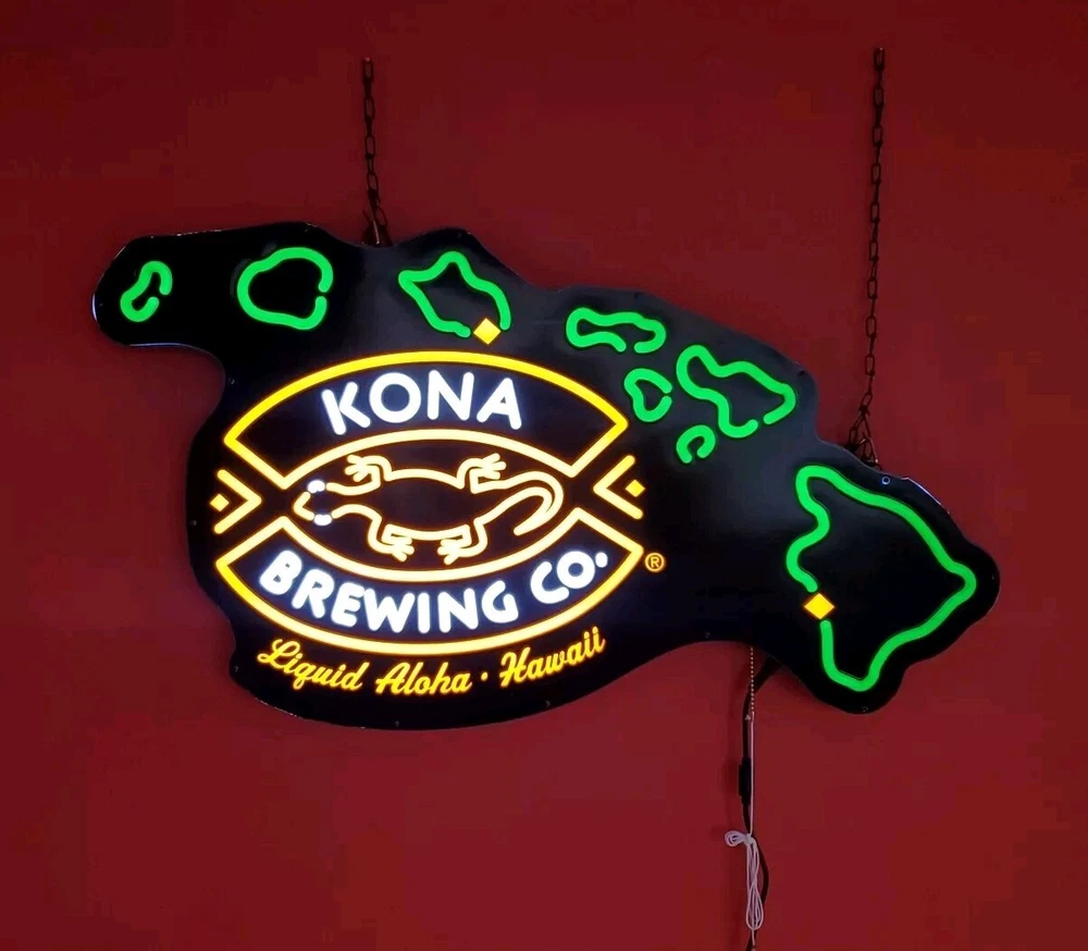 Kona Brewing Co. pull Switch Hanging Light Sign Beer Bar Pub Tavern Advertising Kona brewing Co. Led Bar sign Brand new in a open box comes with everything you need to hang it and power it Two long chains provided to give you plenty of hanging adjustment Also I found out by accident that it has a mode that makes the islands gradually come on and off while the main part of the sign stays on. I think you pull the cord twice for it to do that A very cool sign made by Neon Tech out of California For use in dry locations only I will entertain reasonable offers Thanks for looking Lot 102