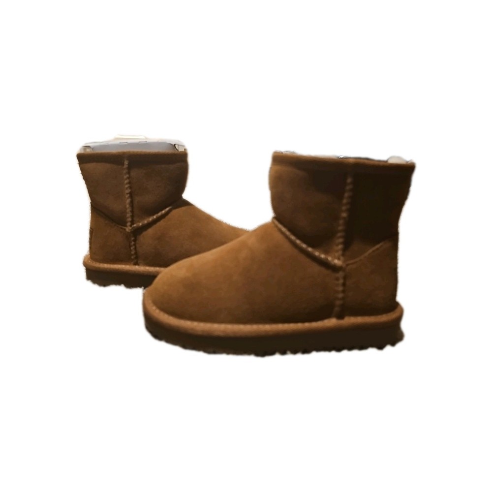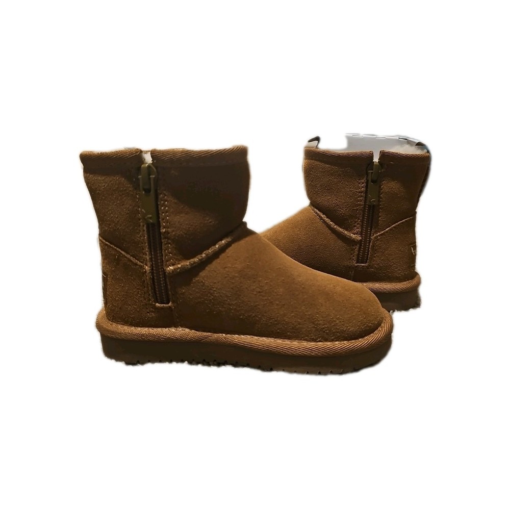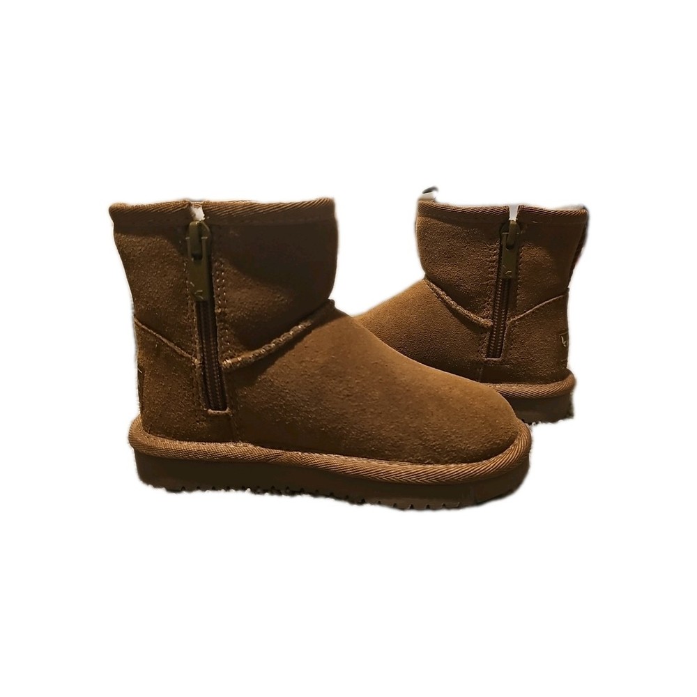 The Koolaburra by UGG T Koola Mini Boot in Chestnut is a stylish and comfortable option for toddler girls in size 8. These solid brown boots feature a round toe, flat heel, and rubber cleat, making them perfect for casual winter wear. The suede upper material and flat heel style provide both durability and support for walking activities. The signature UGG brand ensures quality and a trendy look, making these boots a great choice for any little girl on the go.