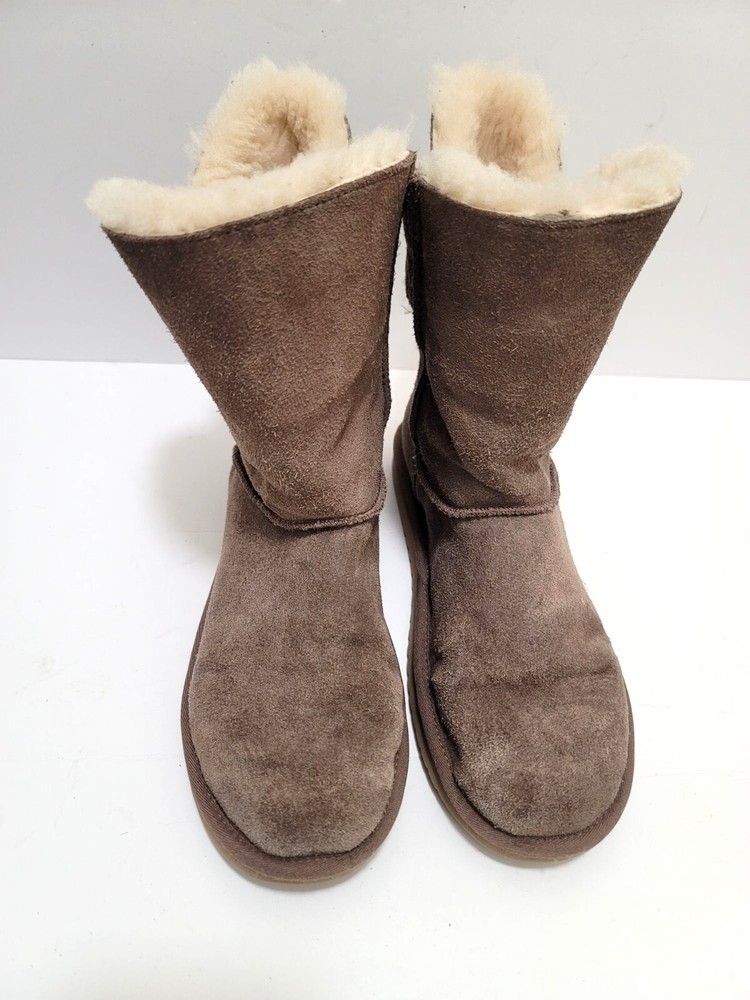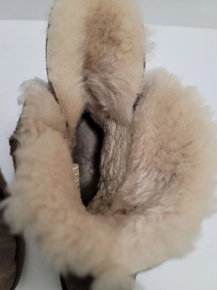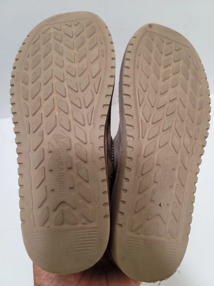These Koolaburra by UGG boots offer a luxurious feel with genuine shearling lining. Crafted from soft suede, they provide warmth and style for cooler seasons. Durable construction ensures long-lasting wear, while the neutral brown complements various outfits. Ideal for both casual and more polished looks. • Genuine suede upper • Shearling lining for warmth • Pull-on style • Round toe design • Durable rubber sole • Decorative buckle detail CONDITIONS use, good condition. some water stains. Light wear on soles and slight creases on the upper. see photos for flaws details.