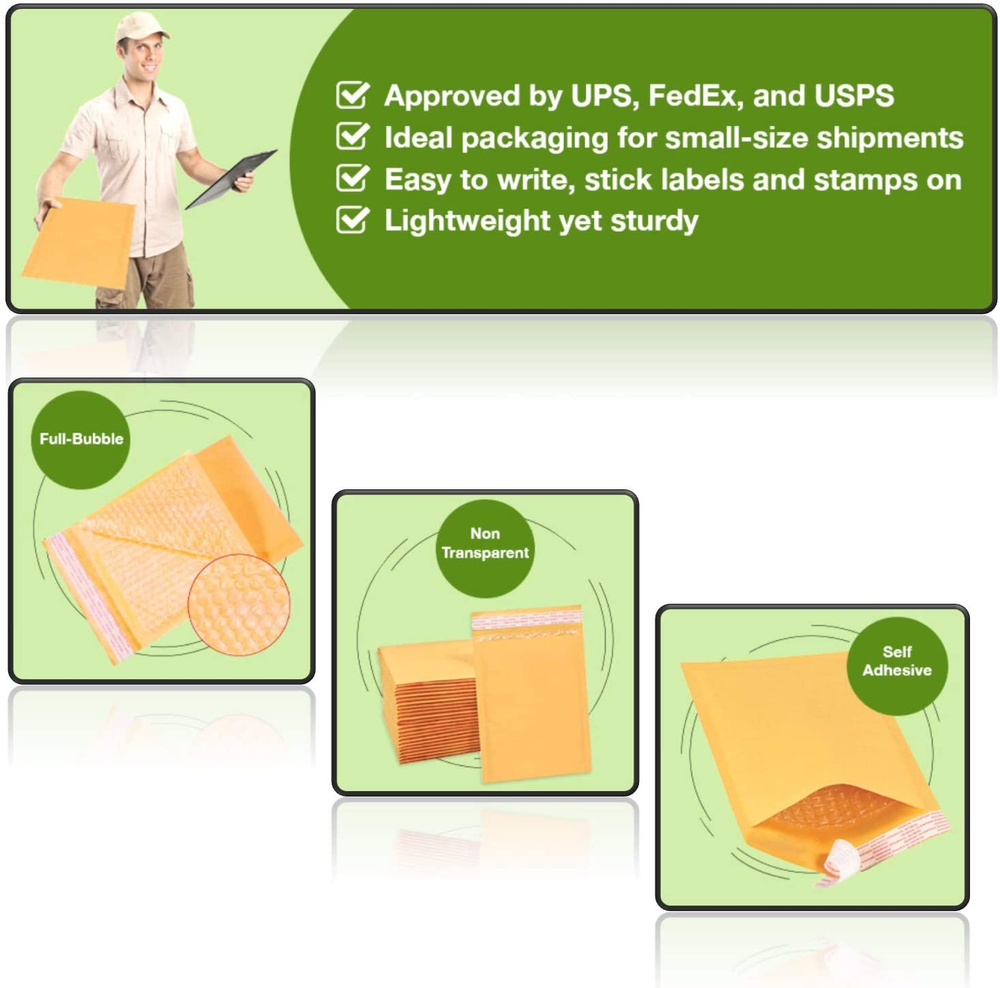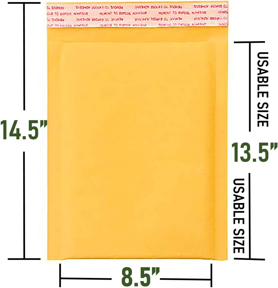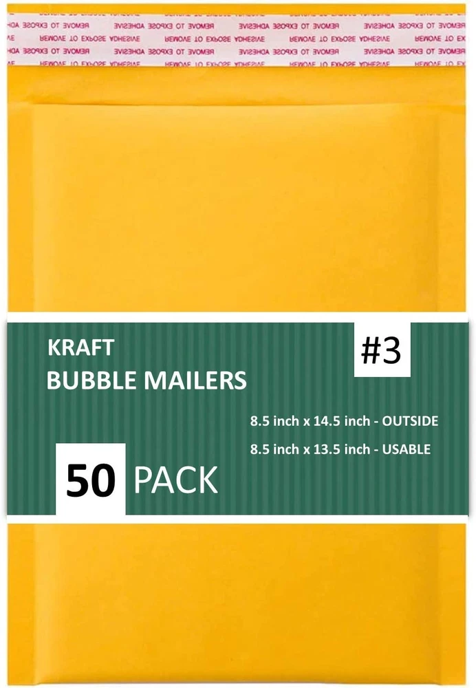 KRAFT BUBBLE MAILERS - This pack contains 50 light weight bubble cushoined mailer envelopes. Outside size: 8.5X14.5 inches, usable size: 8.5X13.5 inch. DURABLE: The surface of this bubble envelopes made from a durable, recycled kraft paper. The interior built with bubble lined wall construction for extra protection during transit, ensure the packages arrive in great condition MATERIAL - These Kraft Bubble Mailers are made out of polypropylene material, 3/16" bubble cushioning wraps to help keep objects safe in shipping. They are 100% light weight and ad no cost to your shipping destination. SELF-ADHEARING - Peel-and-seal strip is quick and easy to use. Remove strip and close. Once the envelope has been sealed, it cannot be opened without visible signs of tampering. Puncture, tamper and water resistant providing extra security for item being shipped. Gold Kraft bubble mailers #3 8.5x14.5 Inches with 3/16” bubble cushioned wraps help ship your products to customers in a safe packaged mailer. Whether you’re shipping crafts to customers or gifts to family and friends, our high quality bubble bags make an excellent package that allows you to send your items with confidence and ease. You can count on these envelopes to not only close securely, but to also protect your valuable shipment from inclement weather and excessive moistures. Lined with thick, yet airy, bubbles, these mailers embrace your items in a safe cushion of air and plastic, ensuring their safe arrival at their definition. Peel-and-seal strip is quick and easy to use. Remove strip and close. Once the envelope has been sealed, it cannot be opened without visible signs of tampering. Puncture, tamper and water resistant providing extra security for item being shipped. Order your supply of these poly bubble mailers today to avail our quick shipping policy.