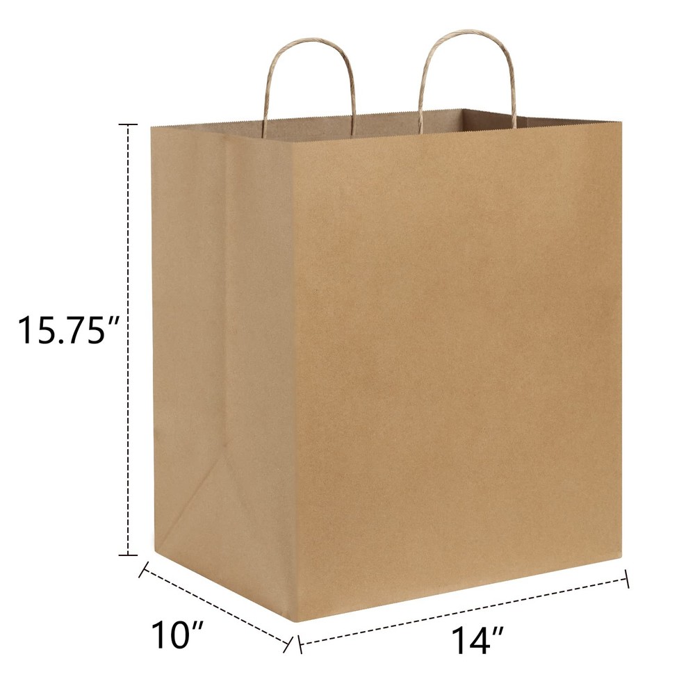 14x10x15.75" Large Wide Kraft Paper Gift Bags with Handles With ISO9001 and FSC certificates, kraft paper bags are RECYCLABLE. Our kraft paper gift bags are simple and elegant. The retail paper bags are perfect size and work beautifully for your small business,tucking in a bunch of little goodies, a dozen or two of cookies, Christmas breads, candles and etc. At this price, they are nice to be able to place product in such a nice little handy bag for your customers. On the other hand, you could print your own labels/logo stamp and put them on each paper bag, made these paper bags with handles on behalf of your store. Besides, they are perfect for decorating. You could dress the paper bags up by using ribbon, markers, glitter and pompoms. It it a funny way to let the children bring out their creative side that letting them sit color and draw on these bags. Different color will perfect for Easter, Christmas, Thanksgiving, baby shower, any patriotic holiday or birthday and etc. It is a really fun experience and created a lot of cute memories! Kraft Paper Bags Specifications: Grocery bags Size: 14"W x 10"D x 15.75"H. Package of brown paper bags: 25pcs/pack. Paper Bags with handles: 130g basis weight. Made of 100% Recyclable Paper with a serrated top edge. Brown paper shopping bags: It is versatile for just about anything, including gift wrapping, hand lettering and rubber stamping. Gift for Children and family! 14x10x15.75" Large Wide Paper Bags: Wider than typical paper grocery bags from grocey stores. Perfect for large pie boxes, to go containers, pans, cake boxes, restaurant take-out. This shopping bag is also roomy for big purchases, large or odd size gifts Premium Kraft Paper Bags with Handles: Made of 130G heavy duty kraft paper, these bags are great with sturdy handles and thick paper construction. Holding up to 20LBS, the grocery paper bags can be reused. Affordable but high quality kraft paper bags Large Paper Bags Application: These 14" paper bags are good for homemade baked goodies to family, for transporting items for donation or food bank, carrying books, lunches with containers, groceries, farm vegetables, etc Multipurpose Paper Bags: You can use these durable grocery store bags for like garage sales, for short term storage options, for party pick up and go as well. These kraft bags are also great for bringing gifts, beat using a plastic bag any day Nice DIY Paper Gift Bags: You could let the kids decorate them with pretty tissue paper, drawing and coloring as gift bags for family and friends. Also, you can add your own logo/design as you wish, the stickers adhere well and ink/marker dry instantly Shopping Worry-free: We never want to make our valued customers disappointed. If there's any quality problem with our large paper gift bags, please contact us for a refund or replacement.