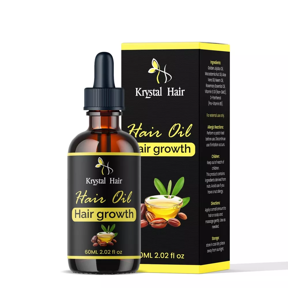 Krystal Hair Growth Oil is a blend of natural plant-based and nut oils, crafted to support healthier-looking hair and scalp care. Packaged in a reusable 60ml glass bottle, this oil provides essential moisture and nutrients, helping to maintain strong, nourished hair over time. Please note: This product contains nut oils (Macadamia Nut Oil), so those with nut allergies should avoid use. Key Ingredients and Benefits: Golden Jojoba Oil: Known for its ability to moisturize without clogging pores, jojoba oil helps balance the scalp’s natural oils and reduces dryness. Macadamia Nut Oil: Lightweight and easily absorbed, macadamia oil helps soften hair, providing moisture and smoothness. Aloe Vera Oil: Naturally soothing, aloe vera oil helps calm scalp irritation, creating a balanced environment that supports overall scalp health. Neem Oil: Rich in antioxidants and fatty acids, neem oil helps protect the scalp and hair from damage while promoting a healthy scalp environment. Rosemary Essential Oil: Rosemary oil is traditionally used to stimulate circulation in the scalp, which may support healthy hair growth. Vitamin E Oil (Non-GMO): A potent antioxidant that helps protect hair from environmental stressors and supports shine and vitality. D-Panthenol (Pro-Vitamin B5): Known for its moisturizing properties, pro-vitamin B5 helps strengthen hair and reduce the appearance of split ends. Why You'll Love It: Moisturizes and Conditions: The combination of oils helps to hydrate both hair and scalp, leaving your hair feeling soft and manageable. Supports Scalp Health: Ingredients like rosemary, neem, and aloe vera create a balanced scalp environment, which can help with long-term hair health. Eco-Friendly Glass Packaging: A reusable, sustainable 60ml glass bottle for eco-conscious buyers. Suitable for Most Hair Types: Designed to be gentle and effective for various hair textures and conditions. Give your hair the nourishment it deserves with Krystal Hair Growth Oil—an all-natural formula that provides essential care to support healthy-looking hair.