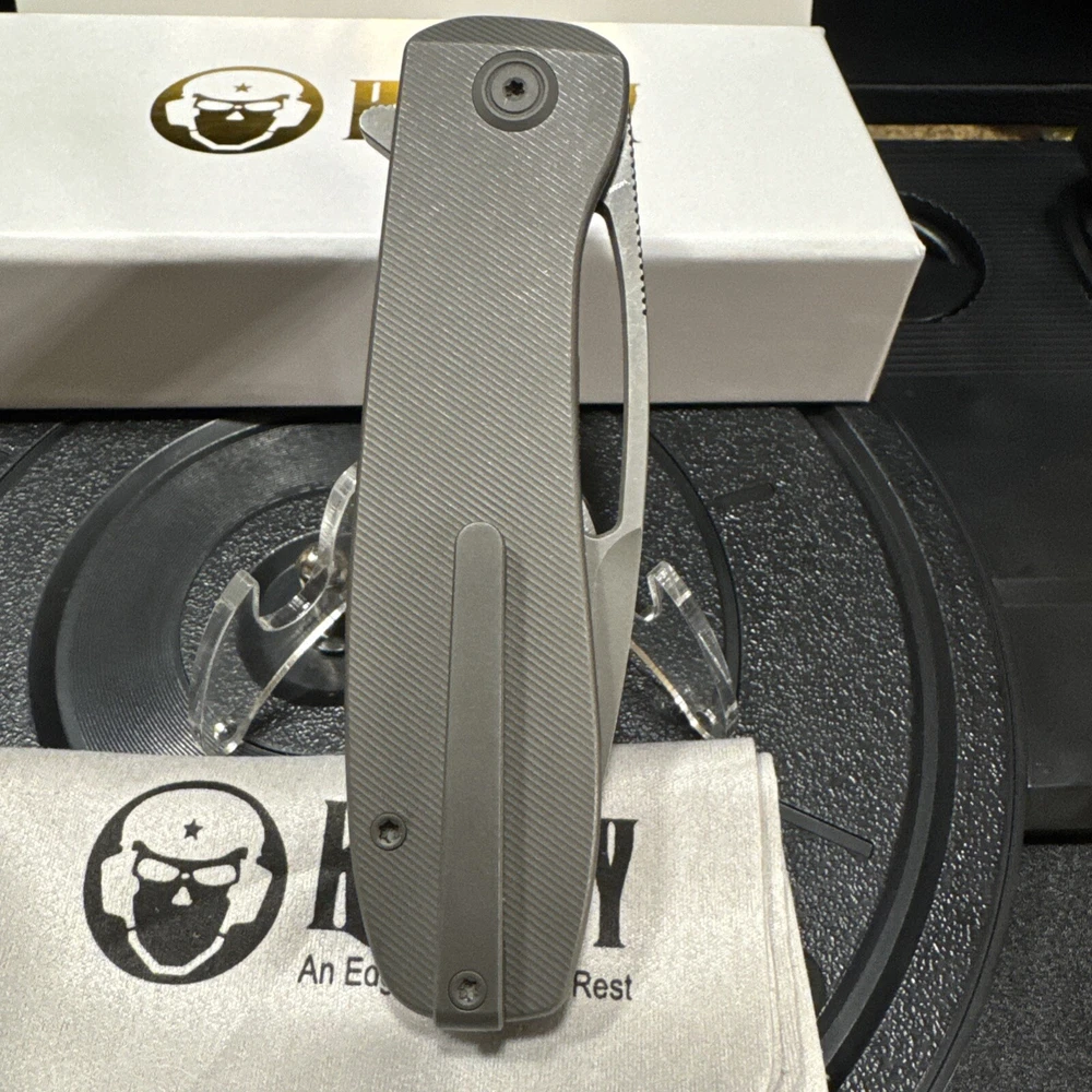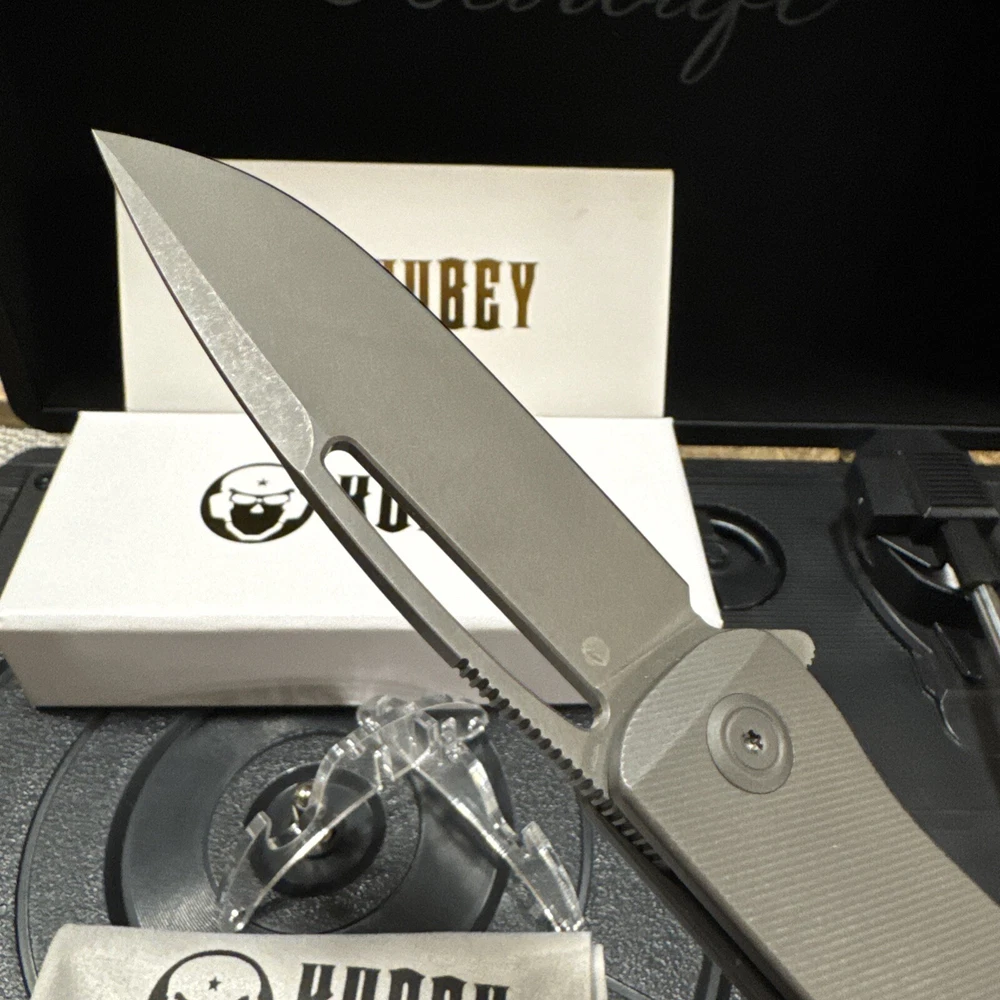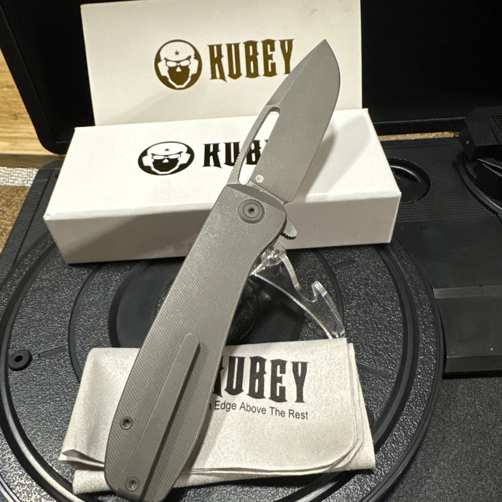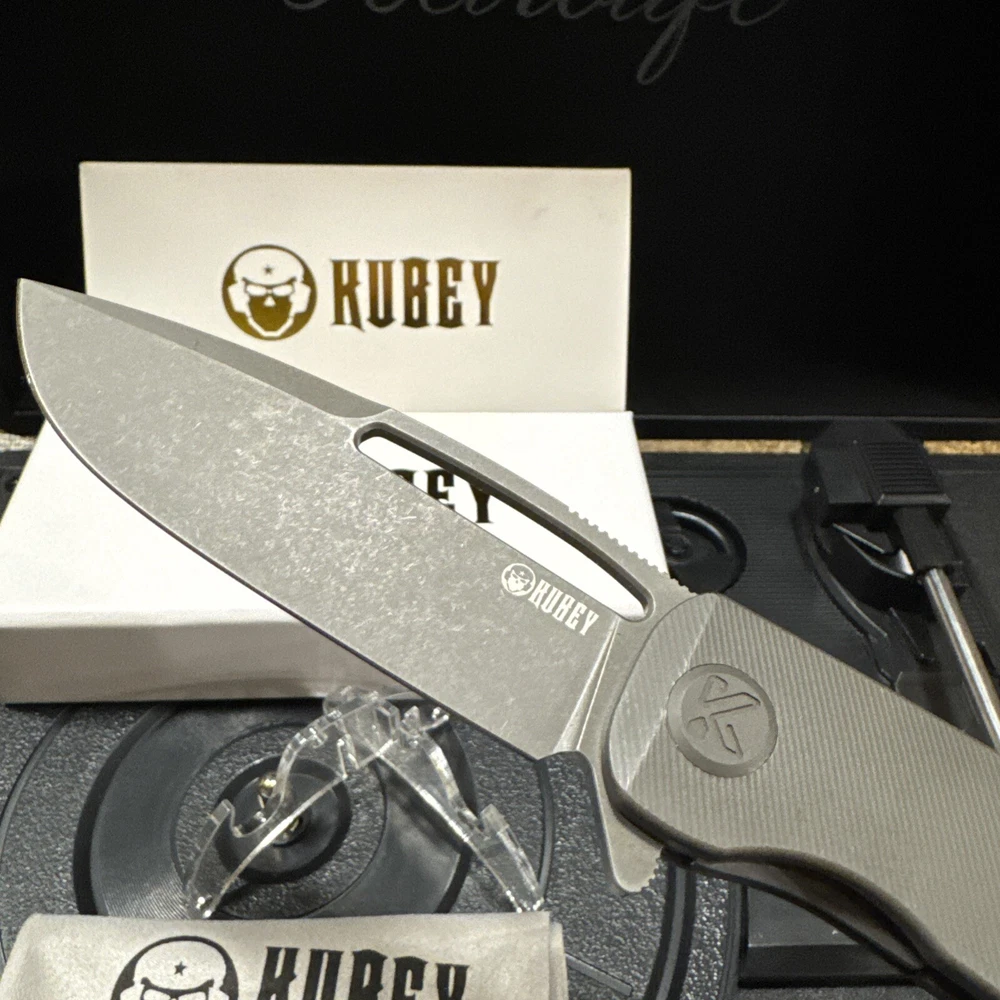 KUBEY WHITE BOX! The smoothest and most grippy EDC you will ever hold. Titanium throughout, this EDC is form and function. This is a Ferrari of the knife world. The quality cannot be understated. Milling on the handle feels firm, yet smooth. Contours only add to its appeal. Definitely a collector’s piece. Might double your body count, who knows? The Kubey Supercell Linerlock is a dark gray pocket knife featuring a 3.46'' drop point blade made of 14C28N steel. It has an ambidextrous manual opening mechanism with a linerlock for security. The handle is constructed of 6AL4V titanium and measures 4.53'' in length. This original Kubey knife is from the 2024 product line.