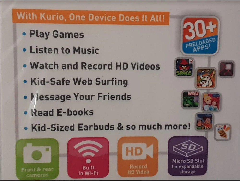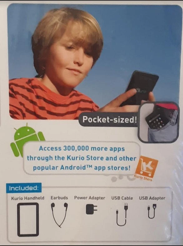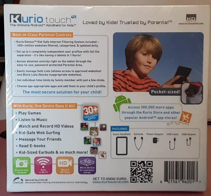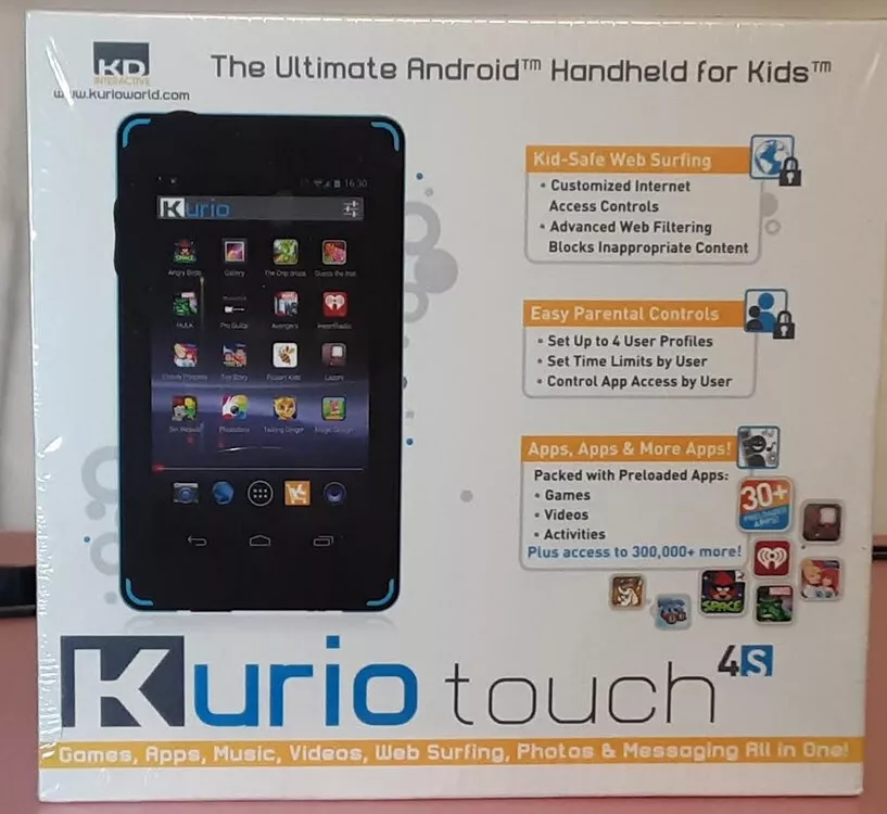 Very Hard to Find BRAND NEW Kurio Touch 4S Sealed in Original Factory Shrink Wrap orig. ToysRus price $99.98 This is the original Kurio S series tablet that is known all over the world as being one of the most well built, durable, and reliable tablets for kids ever made. The Kurio 7S was the most popular kids tablet ever on the market. This 4S which sold tens of thousands around the world is basically the kid brother of the 7S with most of the same operating system and as many of the same games & activities as they could fit. But the main reason kids love the 4S is because it looks just like mom & dad's cell phone and performs many of the same functions such as games, music, take photos & selfies, watch & record videos, kid-safe web browsing, message friends, read E-books, and carry it in your pocket. Sadly over the years Kurio tablets became less reliable. But this S series was built to last for years passing from older to younger sibling and many have done exactly that! Check out this amazing list of impressive features: > 4 inch 800x480 HD Touch Screen > Includes An Original Kurio Accessory Silicone & Plastic Case Stand that retailed for $19.98 > Award Winning Parental Controls including daily time limits and controlling individual app access > Set Up Complete Profiles for 4 Individual Users, it's like 4 kids having their own tablet > Dual Core Cortex A20 Processor > Mali 400 MP2 GPU makes gaming smooth and jitter free with no freezing > 8GB Storage Easily Expanded to 40GB with 32GB micro SD card > Front Selfie Camera and Rear Camera for photos and MP4 HD video recording > Kid-Safe Web Browsing > Micro USB Port Allows Connecting External Peripherals > 1 GB Ram Sufficient to Run All Preloaded Games Smoothly & Efficiently without lagging > 3.5mm Headphone Port Allows Attachment of All Wired Earphones & Headphones > Full Coverage Removable Silicone Bumper Guard Helps Protect Against Drops & Bumps > Built-In Microphone for Voice & Video Recording & Chatting > Many Popular Games Including Angry Birds Space, Fruit Ninja, Disney's Where's My Water & Cut the Rope, Hello Kitty Cafe, Talking Ginger, Pudding Monsters, and many more! > Educational Games include Dictionary, Read & Write Phonics, The Dip Drops, Alpha Grab, Monstr-o-Math, and more. > E-Books include Several Disney E-Book Stories, Aldiko Reader, MeeGenius, Little Red Riding Hood, and more. > Activity Apps include Toon Goggles, Coloring Apps for Boys & Girls, iHeart Radio, Booksy, Fotodanz, and more. > Choose Age Appropriate Apps and Add Them to Your Child's Profile > Take Photos and Decorate with Funny Add-Ons and Doodling on the Photo > What's In the Box: Includes Kurio Touch 4S Tablet, Kid-Size Ear Buds, Power Adapter, USB Cable, and USB Adapter Cable (male micro USB to female USB) for adding external peripherals