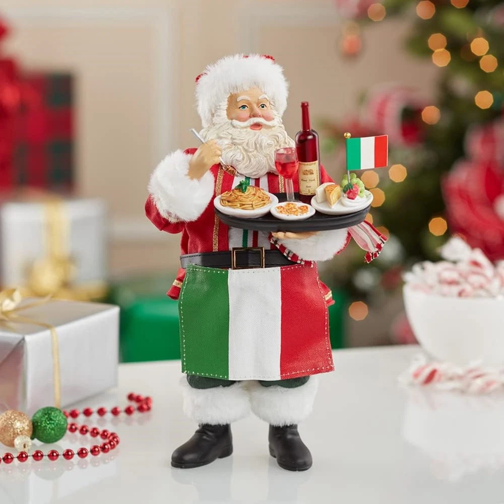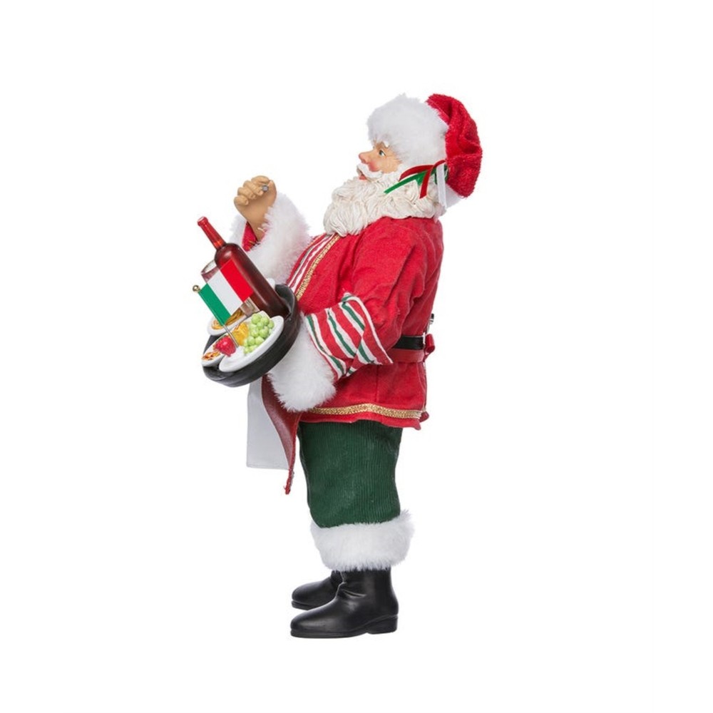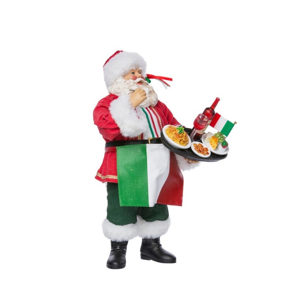 Kurt Adler Fabriché Musical Italian Santa Standing Christmas Figurine, 10.5" PRODUCT DESCRIPTION Celebrate the Italian in you this holiday season with this Musical Santa from Kurt Adler! Key Product Features Great for Collectors — Part of the Kurt Adler Fabriché collection Festive Italian Display — Features Santa Claus in his signature red coat and hat, carrying a platter of Italian foods and wine High-Quality Craftsmanship — Made from fabric mache, cotton, and plastic for durability and fine detail Display-Ready Size — Stands 10.5 inches tall, ideal for mantels, shelves, or centerpieces Musical Decoration — When wound, this piece plays the tune "Jingle Bells" This Fabriché musical Italian "Mania" Santa from Kurt Adler is a delightful addition to any holiday decor. Santa is featured in a suit with a red, white and green apron matching the Italian flag! Santa is holding a plate piled high with classic Italian cuisine including spaghetti, ravioli, a cheese plate, and a bottle of red wine. When wound up, this musical piece plays the tune "Jingle Bells."
