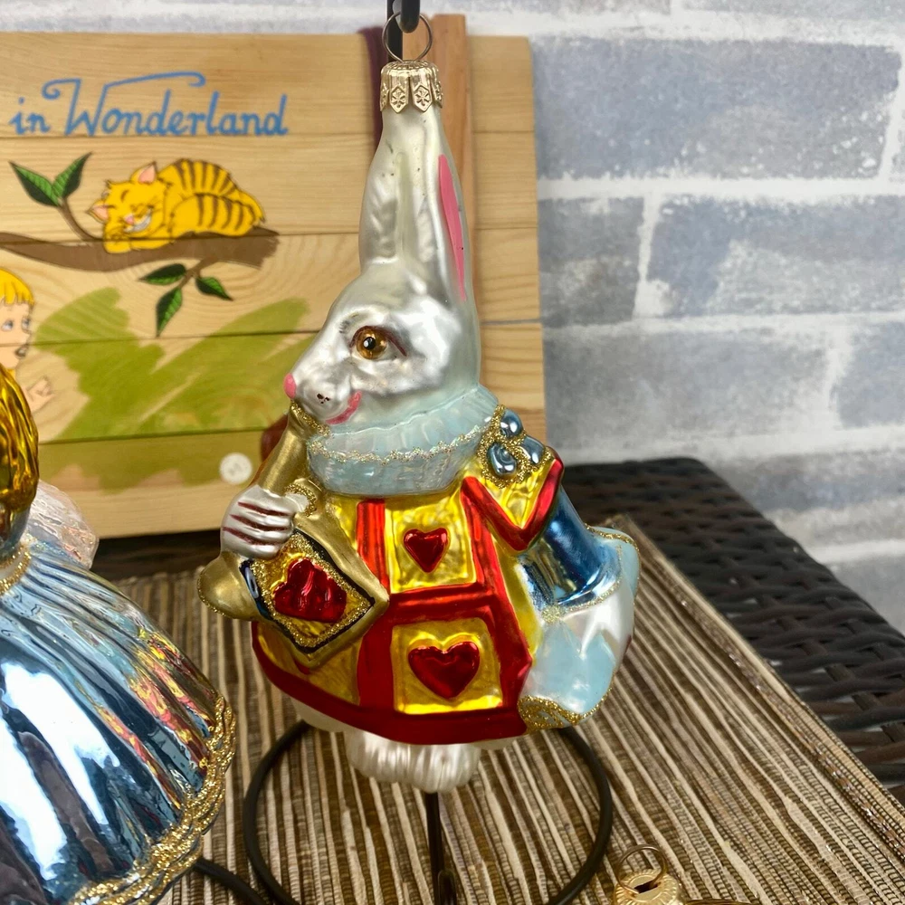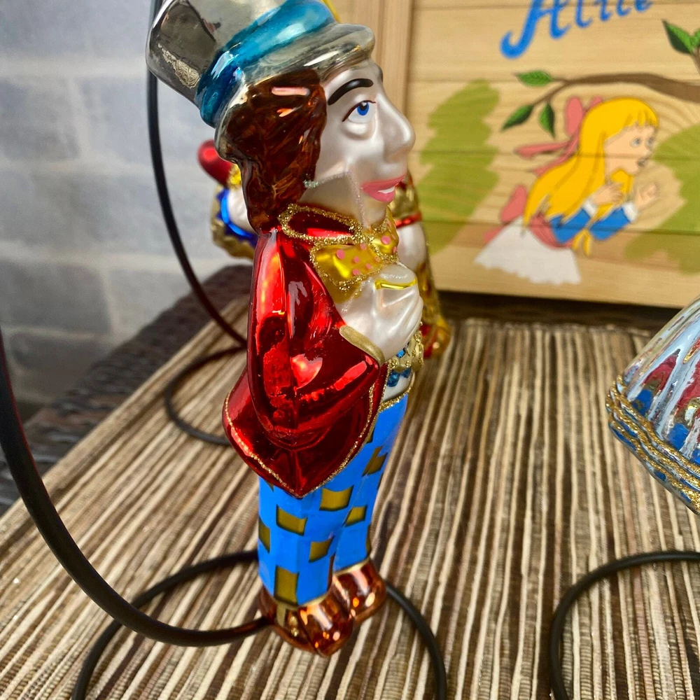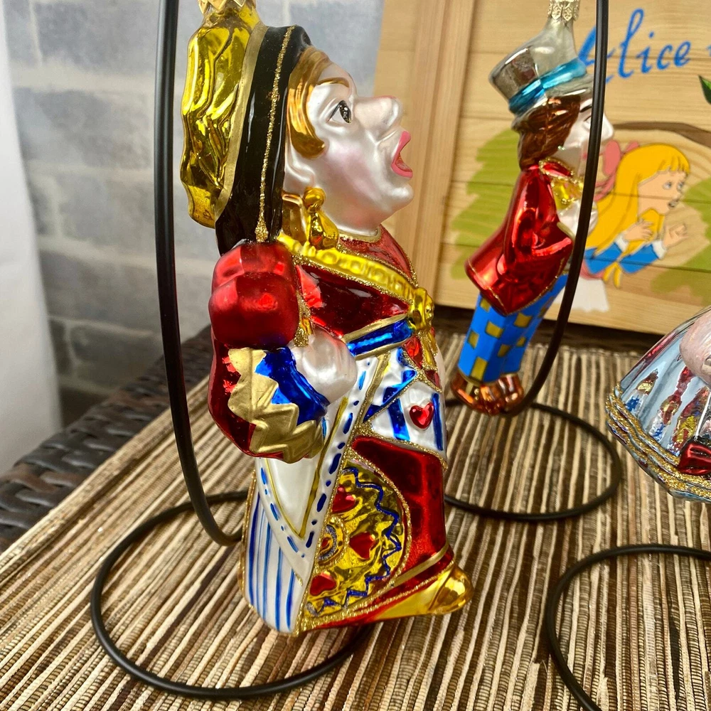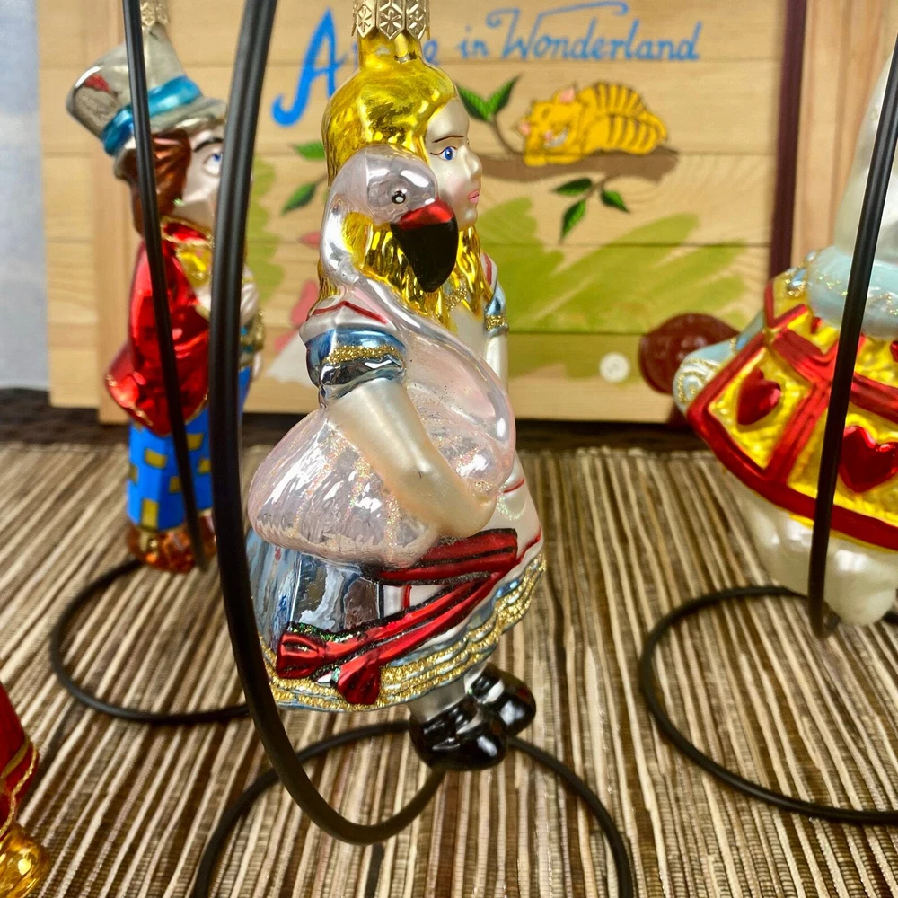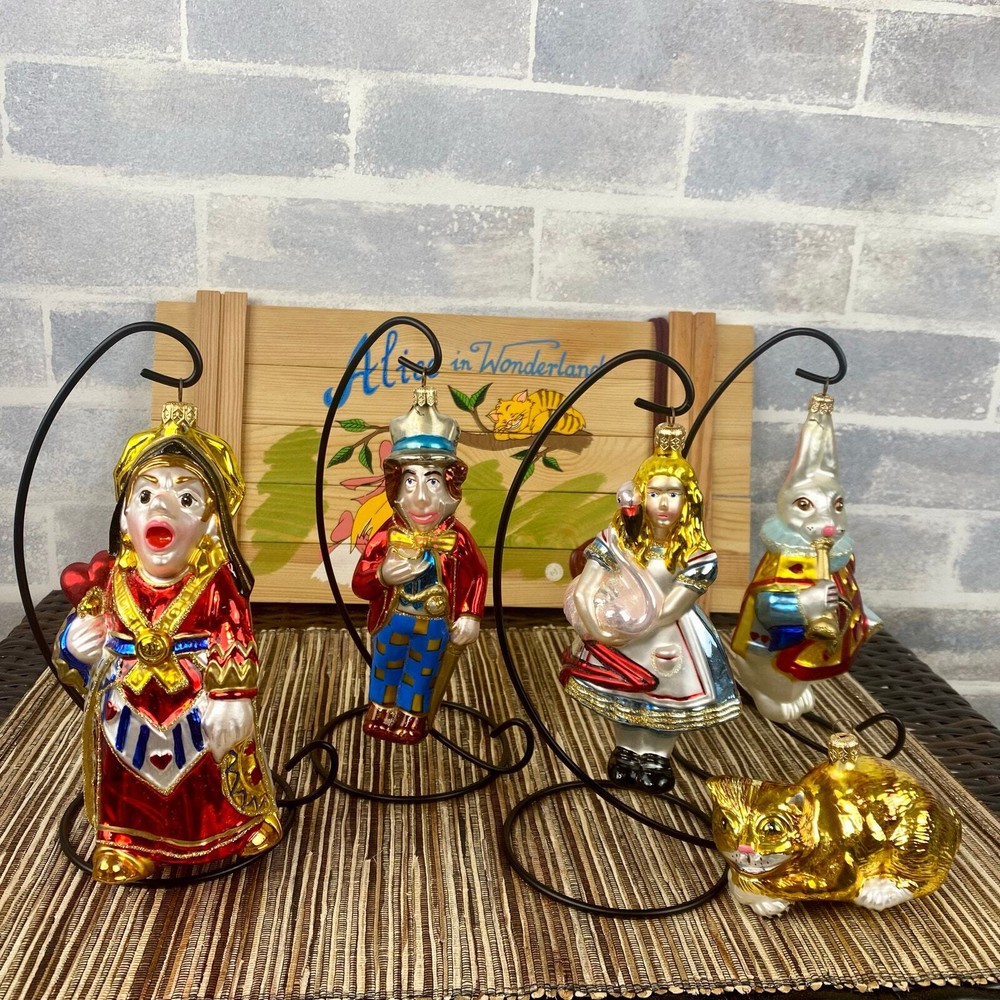 Whimsically Wonderful !! These Kurt Adler Beautiful Polonaise (hand blown glass) Christmas Ornaments by Komozja will surely bring one Joy during the Holiday Season. A must have for the fans of "Alice in Wonderland". This set includes Alice with Flamingo, Queen of Hearts, Mad Hatter, White Rabbit and Cheshire Cat. They all come tucked into protective shredding in a designed wood crate. These ornaments are made of hand blown glass that requires many steps (molten, molds, annealing, silver solution, hand-painting and glittering and temperature reduction) a long process goes into each one. These ornaments are preloved by a collector. Great condition, no chips, breaks or cracks. Zoom in closely to inspect each one. You may find a few scratches from tree branches but these ornaments really are in great used condition. The wood crate measures approximately 17.5" x 8.75" x 4.75" The Ornaments measure approximately 6.5" (Alice) 8" (Queen of Hearts) 7.5" (Mad Hatter) 7.25" (White Rabbit) and Cheshire Cat is 4.5" long (those measurements include the hanger ring on top of ornament). Ornament hangers to display are not included in sale.