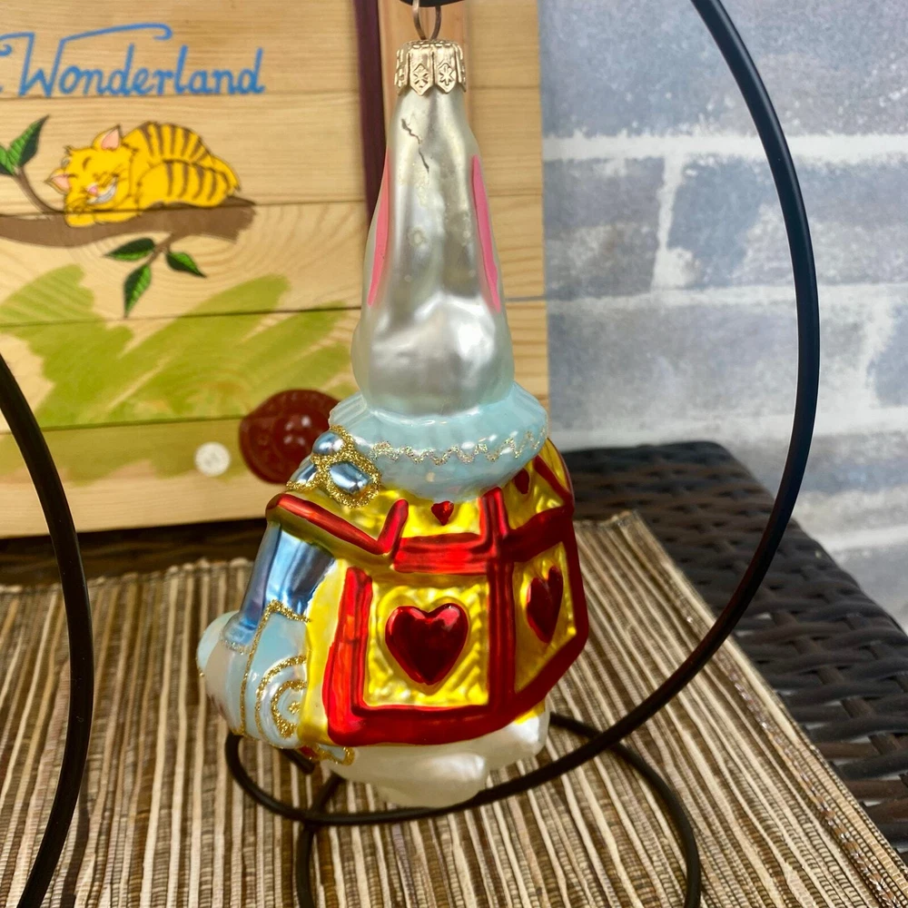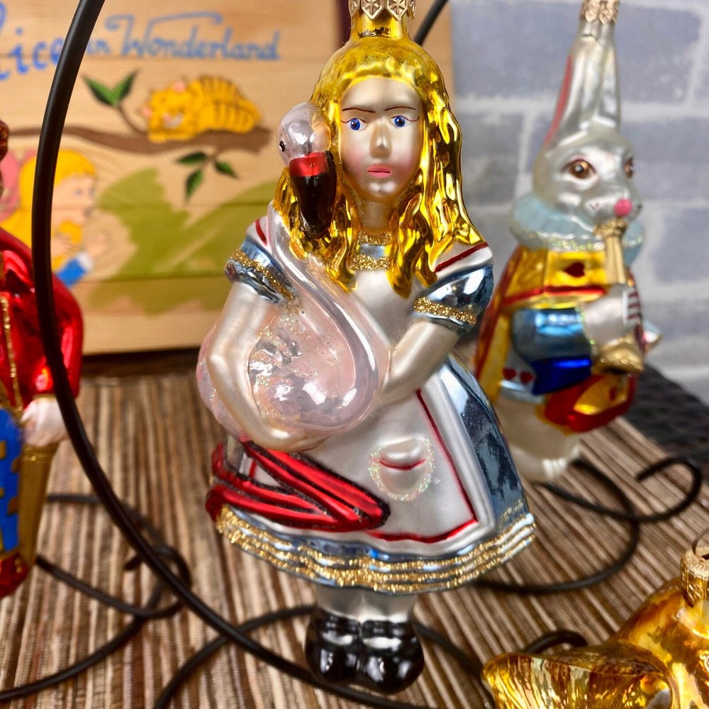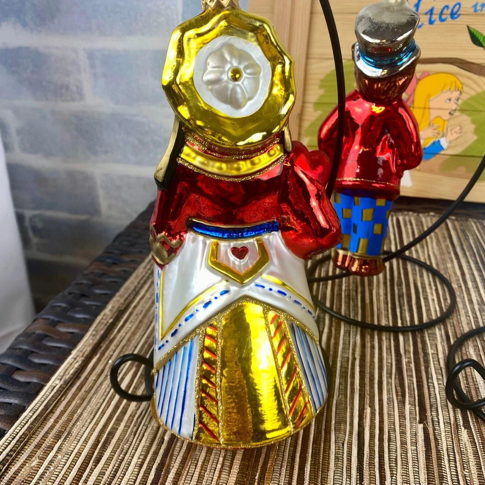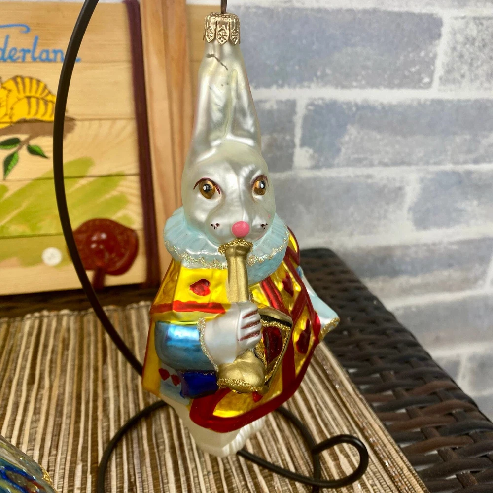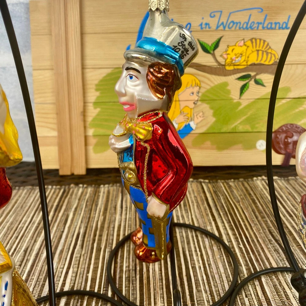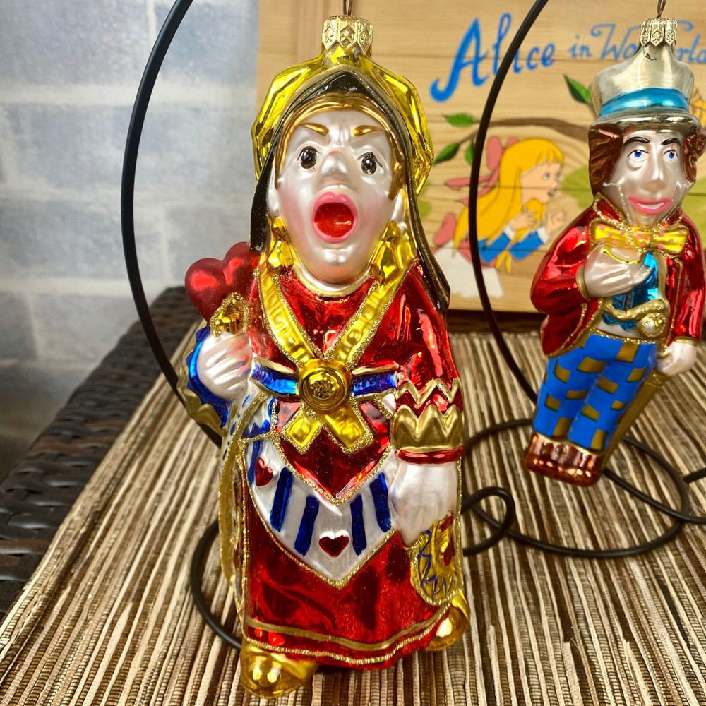 Whimsically Wonderful !! These Kurt Adler Beautiful Polonaise (hand blown glass) Christmas Ornaments by Komozja will surely bring one Joy during the Holiday Season. A must have for the fans of "Alice in Wonderland". This set includes Alice with Flamingo, Queen of Hearts, Mad Hatter, White Rabbit and Cheshire Cat. They all come tucked into protective shredding in a designed wood crate. These ornaments are made of hand blown glass that requires many steps (molten, molds, annealing, silver solution, hand-painting and glittering and temperature reduction) a long process goes into each one. These ornaments are preloved by a collector. Great condition, no chips, breaks or cracks. Zoom in closely to inspect each one. You may find a few scratches from tree branches but these ornaments really are in great used condition. The wood crate measures approximately 17.5" x 8.75" x 4.75" The Ornaments measure approximately 6.5" (Alice) 8" (Queen of Hearts) 7.5" (Mad Hatter) 7.25" (White Rabbit) and Cheshire Cat is 4.5" long (those measurements include the hanger ring on top of ornament). Ornament hangers to display are not included in sale.