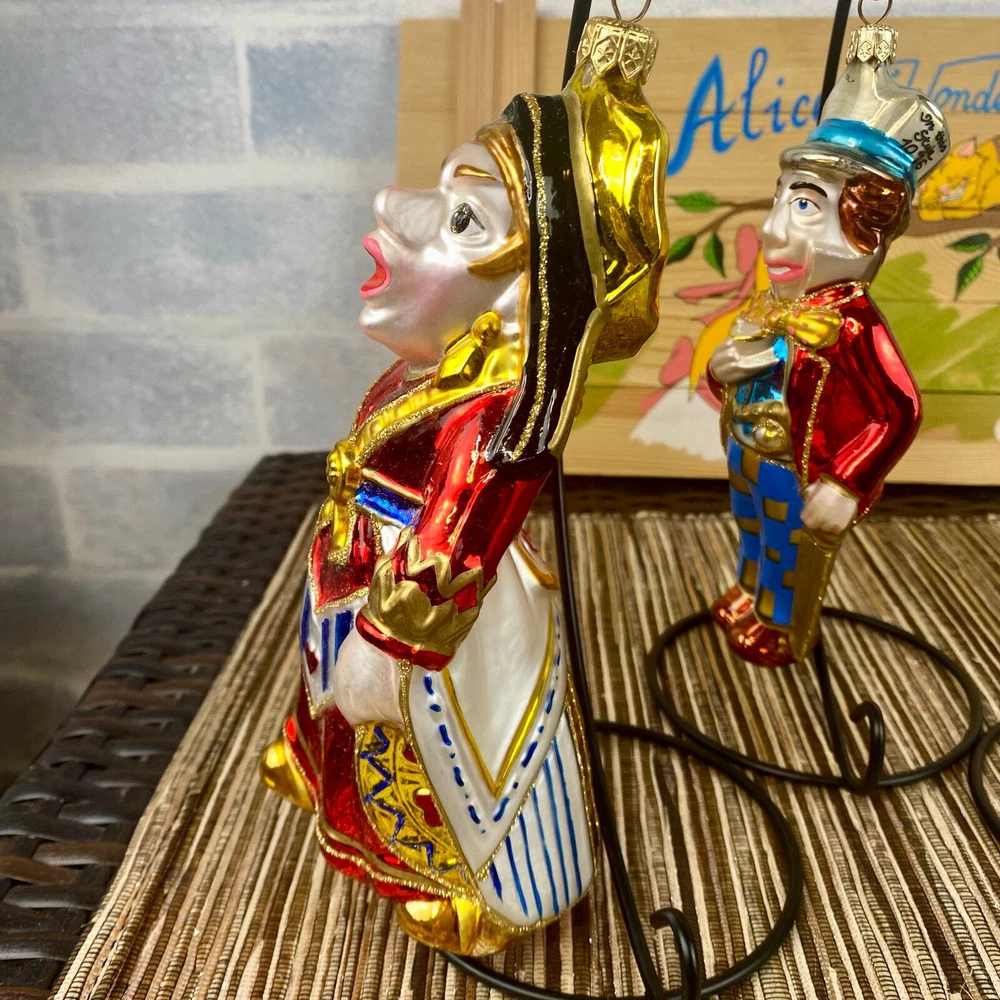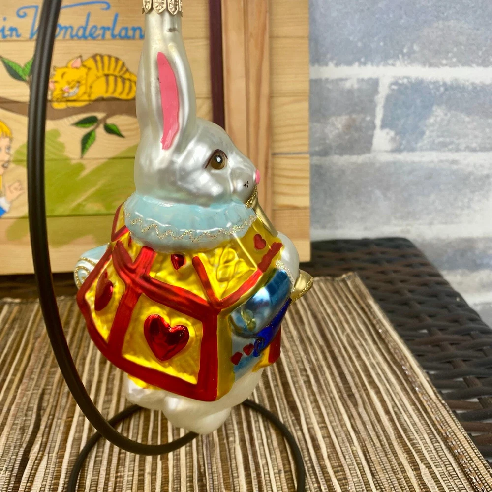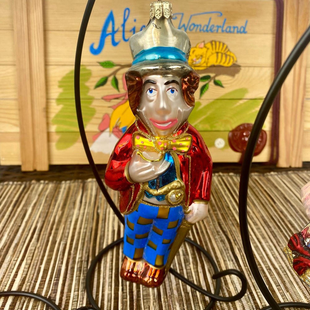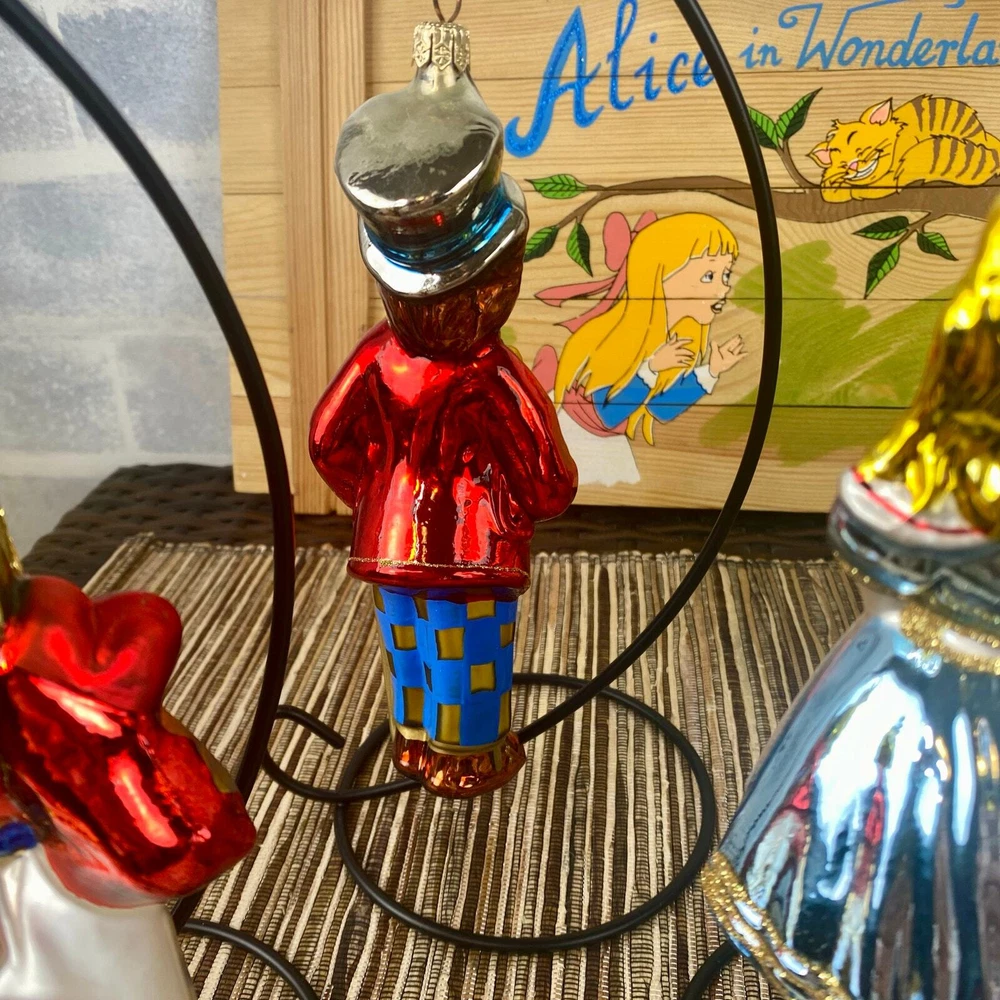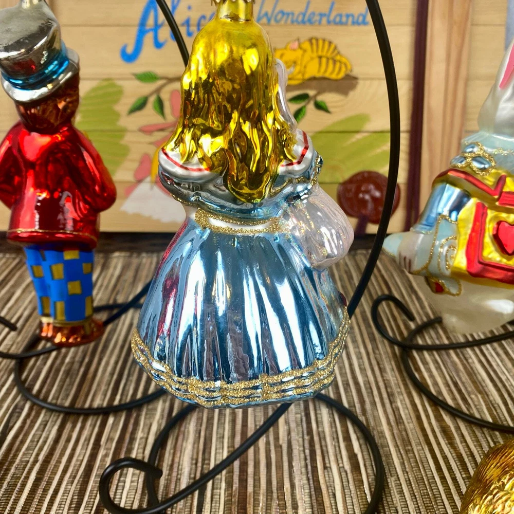 Whimsically Wonderful !! These Kurt Adler Beautiful Polonaise (hand blown glass) Christmas Ornaments by Komozja will surely bring one Joy during the Holiday Season. A must have for the fans of "Alice in Wonderland". This set includes Alice with Flamingo, Queen of Hearts, Mad Hatter, White Rabbit and Cheshire Cat. They all come tucked into protective shredding in a designed wood crate. These ornaments are made of hand blown glass that requires many steps (molten, molds, annealing, silver solution, hand-painting and glittering and temperature reduction) a long process goes into each one. These ornaments are preloved by a collector. Great condition, no chips, breaks or cracks. Zoom in closely to inspect each one. You may find a few scratches from tree branches but these ornaments really are in great used condition. The wood crate measures approximately 17.5" x 8.75" x 4.75" The Ornaments measure approximately 6.5" (Alice) 8" (Queen of Hearts) 7.5" (Mad Hatter) 7.25" (White Rabbit) and Cheshire Cat is 4.5" long (those measurements include the hanger ring on top of ornament). Ornament hangers to display are not included in sale.