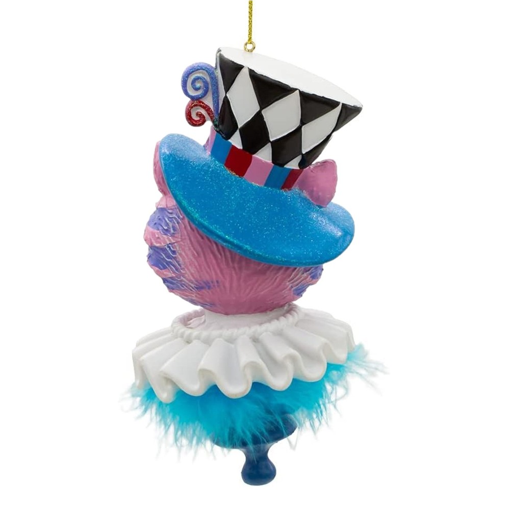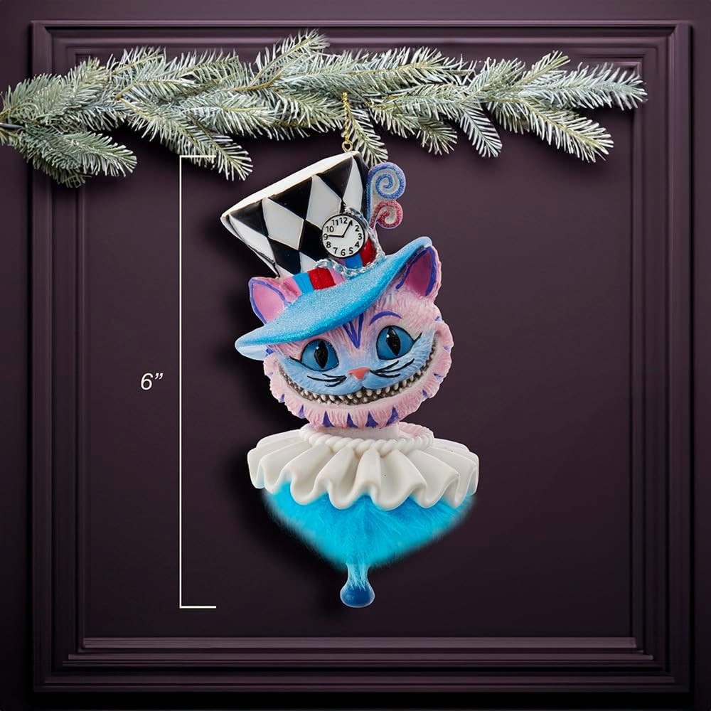 Kurt Adler Wooden Ornament for Christmas Tree, Cheshire Cat Hat PRODUCT DESCRIPTION Bring a touch of elegance to your Christmas tree décor with this beautifully crafted ornament by Kurt Adler! Key Product Features Alice in Wonderland Design: Features The Cheshire Cat is wearing a white collar with a black and white glittered top hat and watch Superior Quality & Craftsmanship: Made from wood composite, this ornament offers lasting durability and a sophisticated finish that enhances any holiday display Exquisite Handcrafted Detailing: Meticulously painted with shimmering mica accents, this ornament will be a beautifully-detailed addition to your Christmas tree A Treasured Keepsake: A beautiful way to adorn your Christmas tree, especially for those who love Alice in Wonderland Ornament Dimensions: Measures approximately 4 x 4 x 6 inches (LxWxH) Kurt Adler ornaments are known for their exceptional craftsmanship, capturing the spirit of the season with timeless charm and festive detail. This 6-inch Hollywood Nutcrackers Cheshire Cat Hat Ornament is inspired by Lewis Carroll's 1865 novel Alice's Adventures in Wonderland. The Cheshire Cat is featured with a white collar and a black and white glittered top hat and watch. Crafted from wood composite, it offers both durability and a refined finish that complements any seasonal décor. This ornament is a meaningful addition to any ornament collection.
