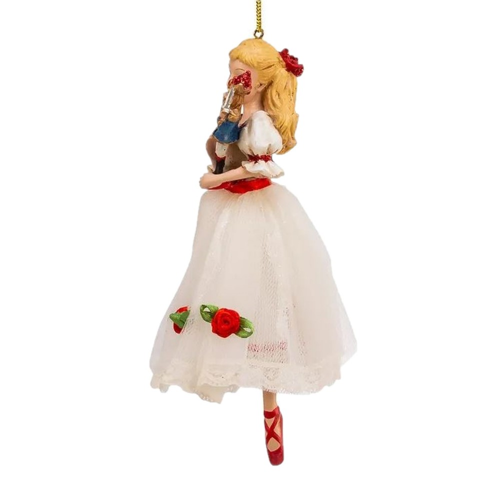 Kurt Adler Resin Ornament for Christmas Tree, Clara PRODUCT DESCRIPTION Bring a touch of elegance to your Christmas tree décor with this beautifully crafted ornament by Kurt Adler! Key Product Features Nutcracker Ornament Design: Features Clara in a beautiful white dress complete with a tulle skirt adorned with red roses and glittering red ballet shoes. In her arms she is cradling her beloved nutcracker Superior Quality & Craftsmanship: Made from resin, this ornament offers lasting durability and a sophisticated finish that enhances any holiday display Exquisite Handcrafted Detailing: Meticulously painted with shimmering mica accents, this ornament will be a beautifully-detailed addition to your Christmas tree A Treasured Keepsake: A beautiful way to adorn your Christmas tree, especially for those who love the Nutcracker Suite Ornament Dimensions: Measures approximately 2.75 x 1.5 x 6 inches (LxWxH) Kurt Adler ornaments are known for their exceptional craftsmanship, capturing the spirit of the season with timeless charm and festive detail. This Kurt Adler Clara ornament is a beautiful addition to any holiday décor or Christmas tree. Inspired by the nutcracker suite, this ornament features Clara in a beautiful white dress complete with a tulle skirt adorned with red roses and glittering red ballet shoes. In her arms she is cradling her beloved nutcracker. Crafted from resin, it offers both durability and a refined finish that complements any seasonal décor. This ornament is a meaningful addition to any ornament collection.