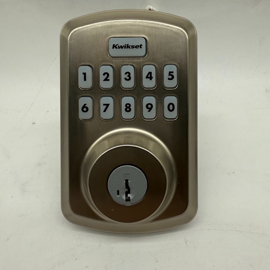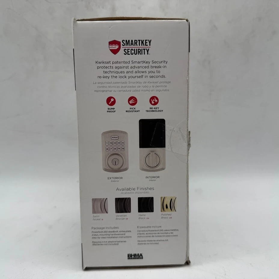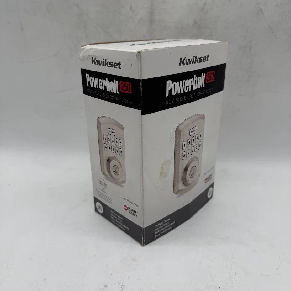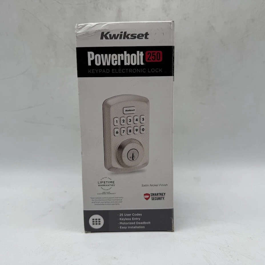 This is a NEW OPEN BOX item. Upgrade your home security with the Kwikset Powerbolt 250 , a sleek, transitional-style electronic deadbolt that offers modern convenience and enhanced security. With its 10-button light-up keypad and customizable features, this keyless entry solution is perfect for any home. Key Features Convenient and Secure Keyless Entry Customizable User Codes : Program up to 25 unique user codes for family members, guests, or service providers. One-Time Codes : Create 5 one-time user codes , ideal for temporary access. Enhanced Security Features Auto Lock Function : Choose from 5 auto-lock settings ( 30 seconds, 1 minute, 3 minutes, 5 minutes, or 10 minutes ) to secure your door automatically after it’s closed. Wrong Code Lockout : Provides added protection by temporarily disabling the keypad after multiple incorrect code attempts. Vacation Mode : Disable the keypad when you're away for extended periods for extra peace of mind. User-Friendly Design 1-Touch Locking : Easily lock the door with the press of a single button. Light-Up Keypad : Illuminated keypad ensures easy access even in low-light conditions. Quick and Easy Installation DIY Installation : Installs with just a screwdriver—no hardwiring required. BILT App Support : Step-by-step interactive instructions available via the BILT app for a seamless setup. Long-Lasting Performance 12-Month Battery Life : Reliable operation with minimal maintenance. We take great care to inspect all items and ensure they are accurately described. Should you have any issues with your purchase, please let us know immediately. We are committed to resolving any concerns promptly and to your satisfaction. Our small business truly appreciates your patronage.