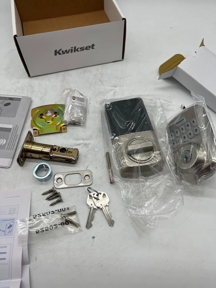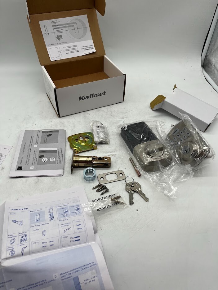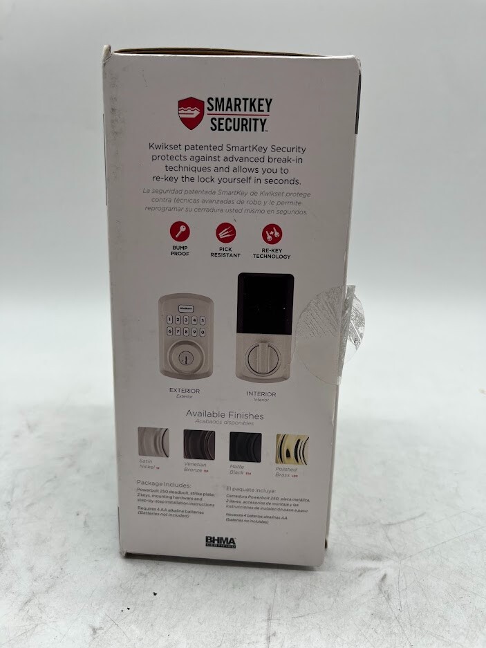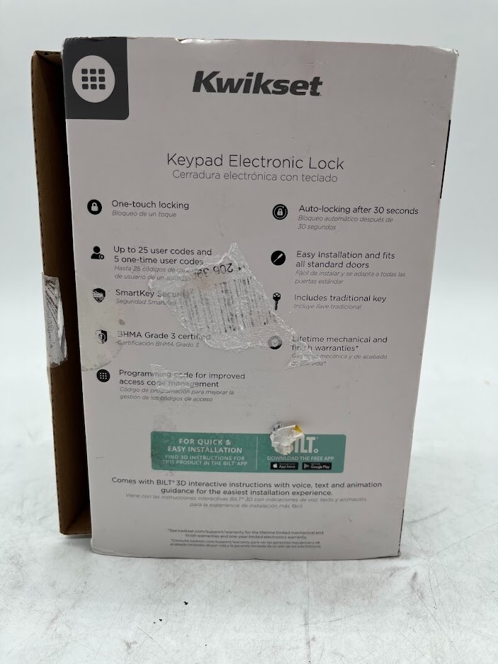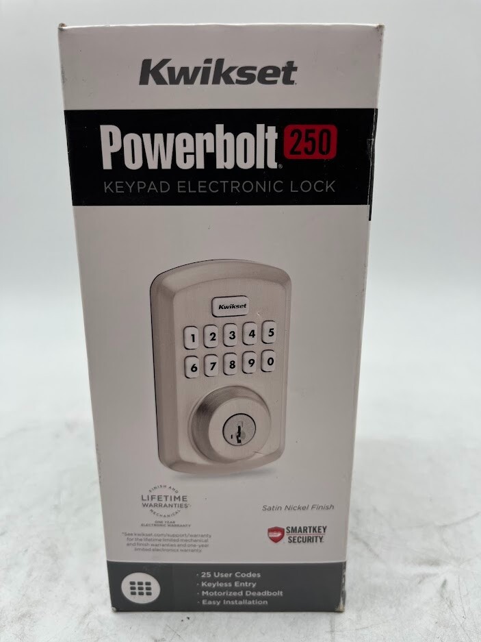 Missing one bolt screw labeled as 52367 on photo. Upgrade your home security with the Kwikset Powerbolt 250 , a sleek, transitional-style electronic deadbolt that offers modern convenience and enhanced security. With its 10-button light-up keypad and customizable features, this keyless entry solution is perfect for any home. Key Features Convenient and Secure Keyless Entry Customizable User Codes : Program up to 25 unique user codes for family members, guests, or service providers. One-Time Codes : Create 5 one-time user codes , ideal for temporary access. Enhanced Security Features Auto Lock Function : Choose from 5 auto-lock settings ( 30 seconds, 1 minute, 3 minutes, 5 minutes, or 10 minutes ) to secure your door automatically after it’s closed. Wrong Code Lockout : Provides added protection by temporarily disabling the keypad after multiple incorrect code attempts. Vacation Mode : Disable the keypad when you're away for extended periods for extra peace of mind. User-Friendly Design 1-Touch Locking : Easily lock the door with the press of a single button. Light-Up Keypad : Illuminated keypad ensures easy access even in low-light conditions. Quick and Easy Installation DIY Installation : Installs with just a screwdriver—no hardwiring required. BILT App Support : Step-by-step interactive instructions available via the BILT app for a seamless setup. Long-Lasting Performance 12-Month Battery Life : Reliable operation with minimal maintenance. We take great care to inspect all items and ensure they are accurately described. Should you have any issues with your purchase, please let us know immediately. We are committed to resolving any concerns promptly and to your satisfaction. Our small business truly appreciates your patronage.
