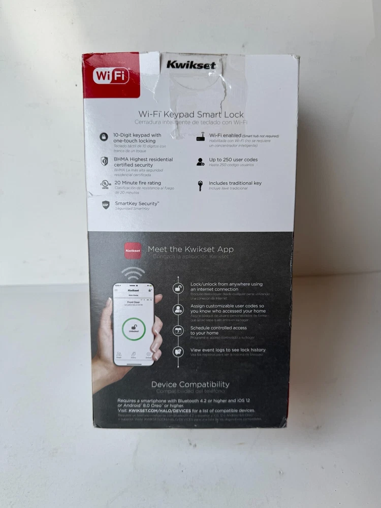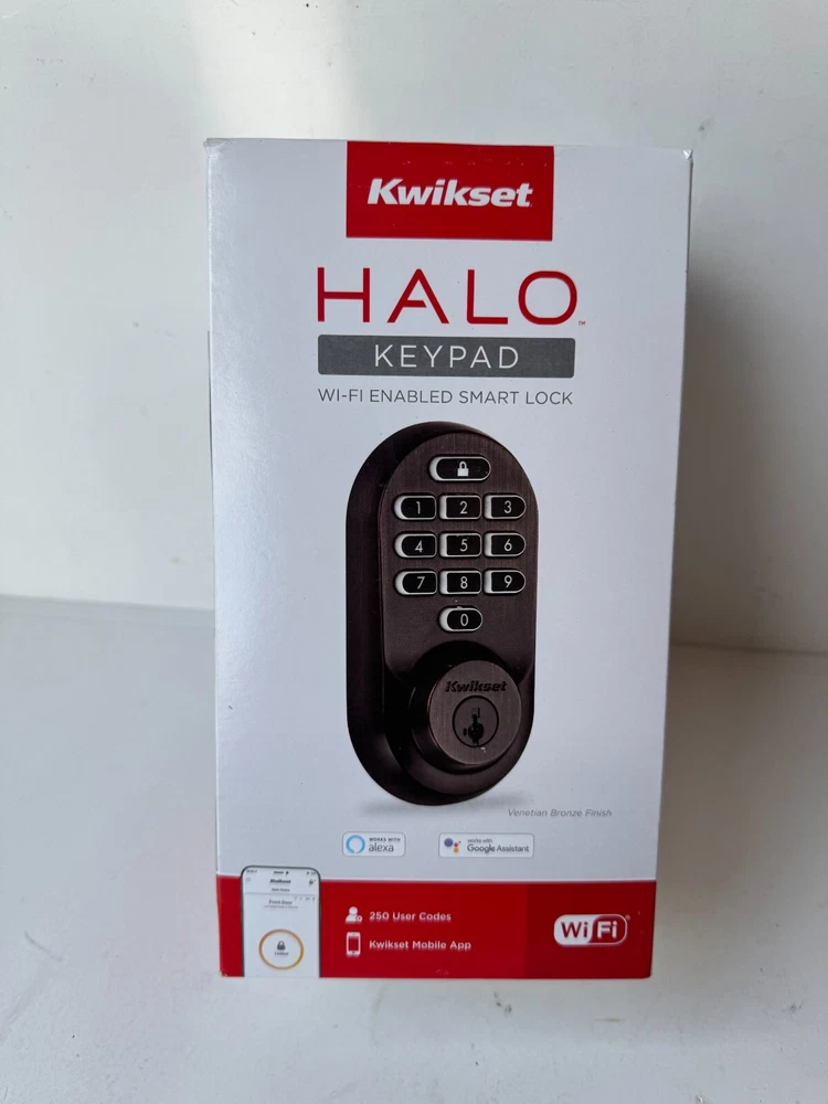 Kwikset Halo Keypad Deadbolt Smart Lock Touch Screen Wi-Fi App Alexa Enabled Description Kwikset Halo Keypad Deadbolt Smart Lock Touch Screen Wi-Fi App Alexa Enabled . Product Detail • Brand : Kwikset • Model : Kwikset Halo • Color: Black • Type : Smart Lock Please message me if you have any questions.