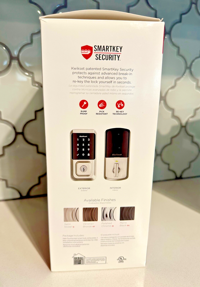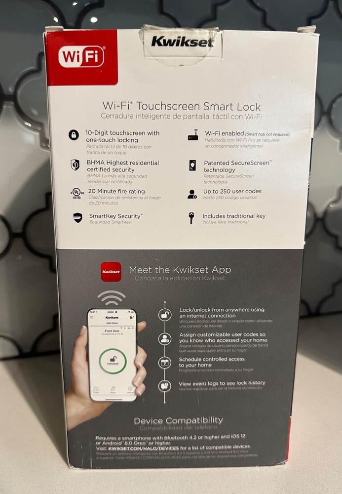 Open Box Kwikset Halo Touchscreen Wi-Fi Enabled Smart Lock - Satin Brushed Nickel MSRP $199.99 Thanks for your interest! All sales final, no refunds. Thank you. Kwikset Halo Wi-Fi Smart Lock, Keyless Entry Front Door Touchscreen Deadbolt, Grade AAA Certified, UL Listed, Easy Install No Hub, App Control, Digital Remote Lock Unlock simplicity, connectivity and smart living with Halo Touchscreen. With the Kwikset app and Halo Touchscreen’s built-in Wi-Fi, you can lock or unlock your home from anywhere. Keyless entry means you can ditch your keys, for good — unlock your door with the Kwikset app or enter a code on the backlit touchscreen. Access codes simplify sharing access with family and trusted guests, and real-time notifications give you peace of mind they’ve locked up after leaving. Experience total control of your front door: Control your lock with your voice, check the event log any time and receive instant notifications for intrusion attempts. It’s easy to get started with Halo Touchscreen; the guided setup and installation only requires a screwdriver. When it comes to security and access control, you can trust Kwikset’s 75 years of experience to deliver effortless protection and peace of mind.