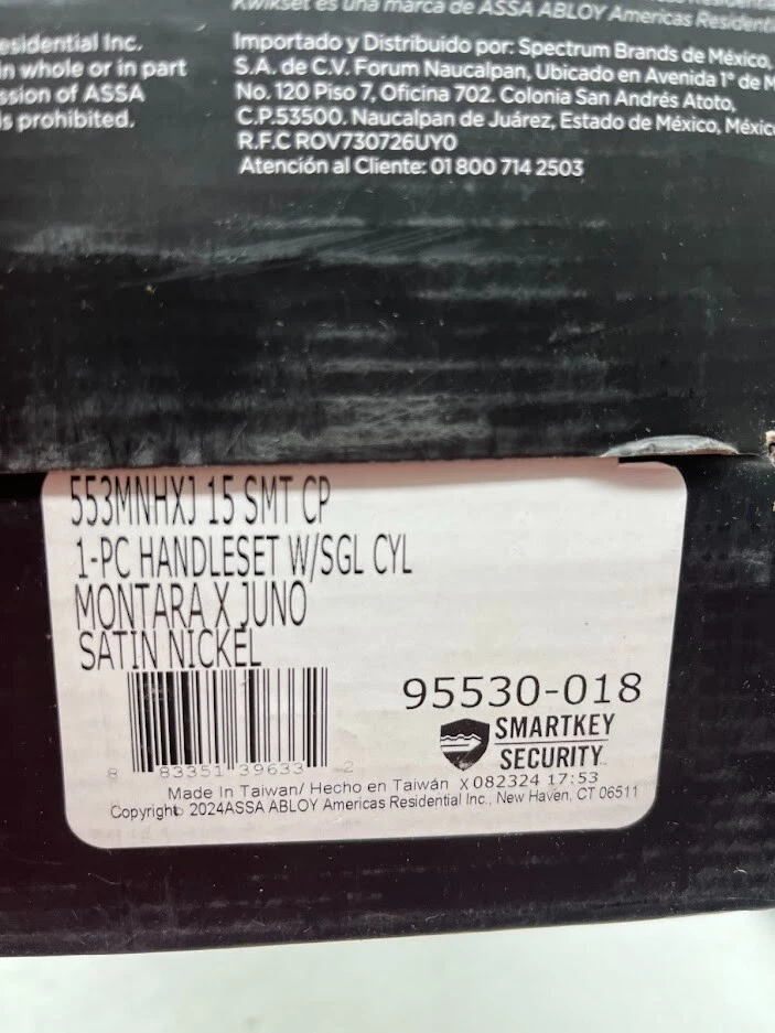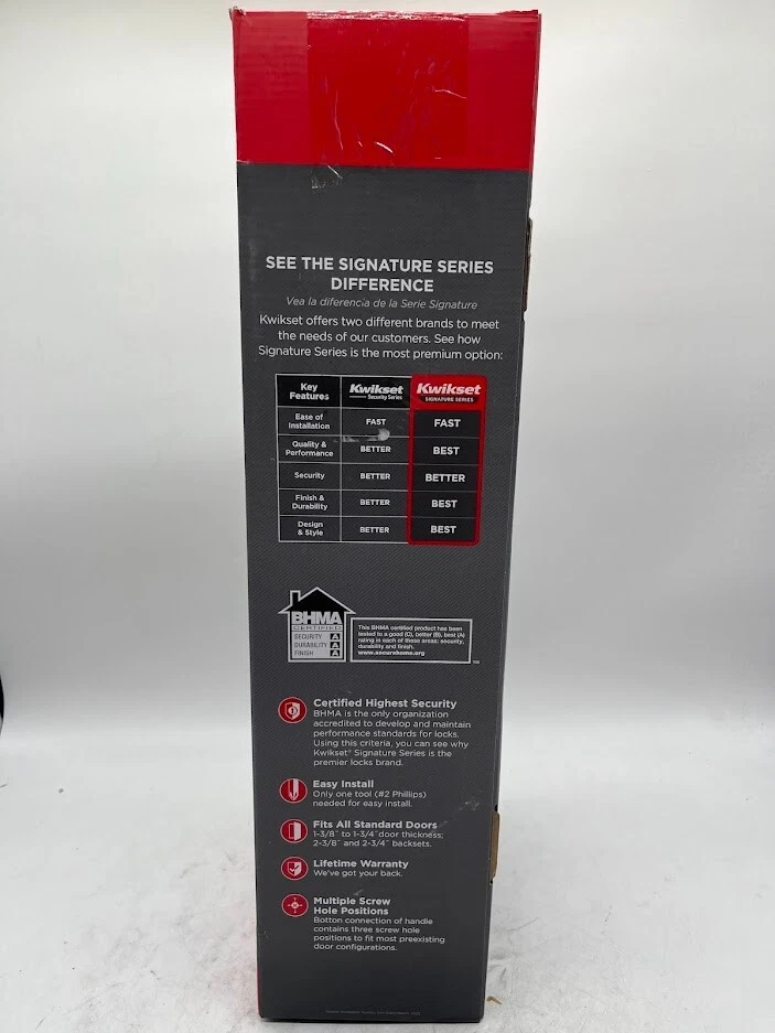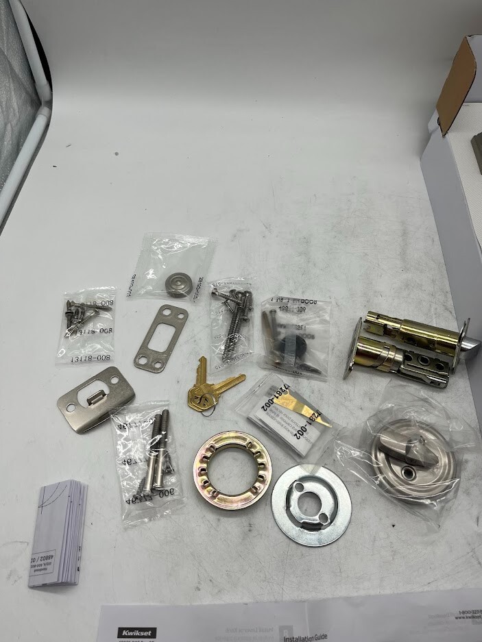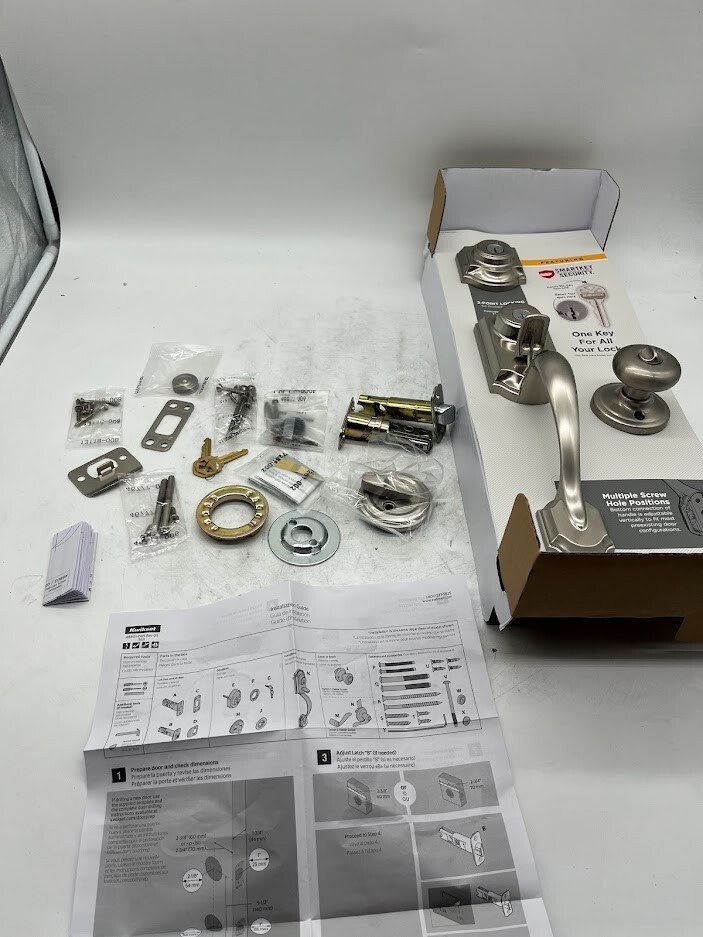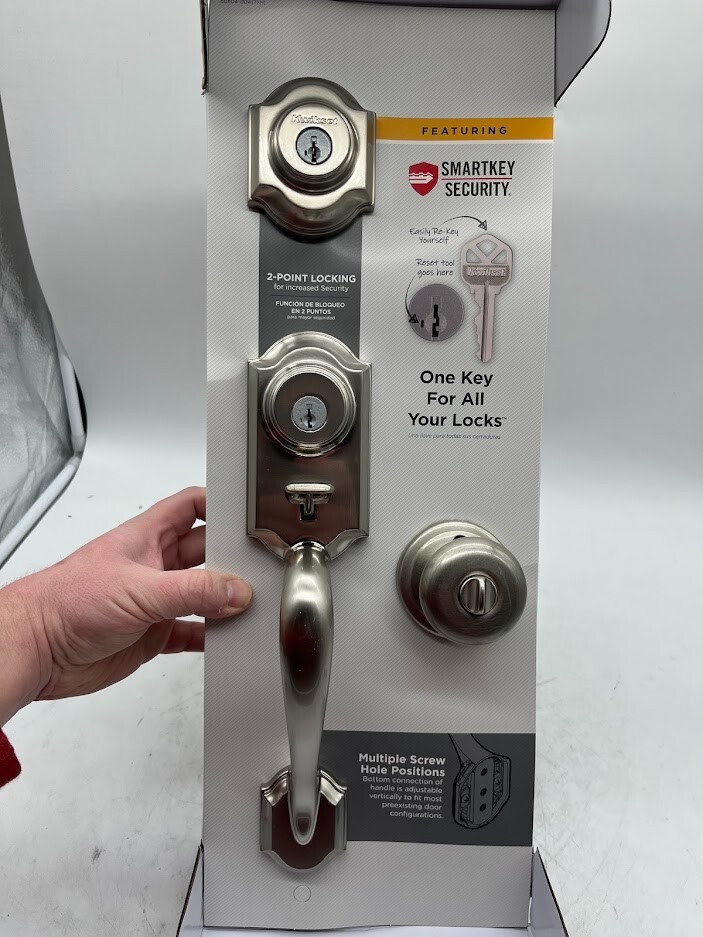 Enhance the style and security of your front door with the Kwikset Montara Handleset from the Signature Series. Designed for both elegance and durability, this handleset features two locking points for superior protection and SmartKey Security technology for quick and easy re-keying. With a Satin Nickel finish and an arched design, it brings a clean, modern look to your home’s exterior. Key Features Enhanced Security : Dual locking points: One on the deadbolt and another on the handleset for extra protection. ANSI/BHMA Grade 2 security rating for high-quality residential safety. SmartKey Re-Key Technology : Easily re-key the lock yourself in just 3 steps. Compatible with Kwikset (KW1) keyway. BumpGuard technology protects against lock bumping for added peace of mind. Ease of Installation : Fully adjustable latch fits all standard door preparations. Adjustable bottom through-bolt ensures a perfect fit on pre-drilled doors. Fits door thicknesses of 1-3/4 inches and installs in minutes with just a screwdriver. Sleek and Stylish Design : Satin Nickel finish offers a crisp, clean, and modern look. Arched design complements a variety of home styles. Specifications Finish : Satin Nickel Lock Type : Single cylinder deadbolt with thumb turn inside and key access outside. Compatibility : Fits doors with a thickness of 1-3/4 inches. Installation : Requires only a screwdriver for simple, hassle-free setup. Security Grade : ANSI/BHMA Grade 2. We take great care to inspect all items and ensure they are accurately described. Should you have any issues with your purchase, please let us know immediately. We are committed to resolving any concerns promptly and to your satisfaction. Our small business truly appreciates your patronage.