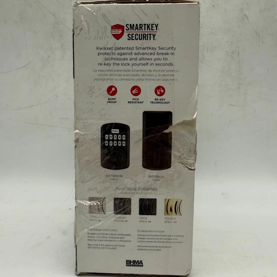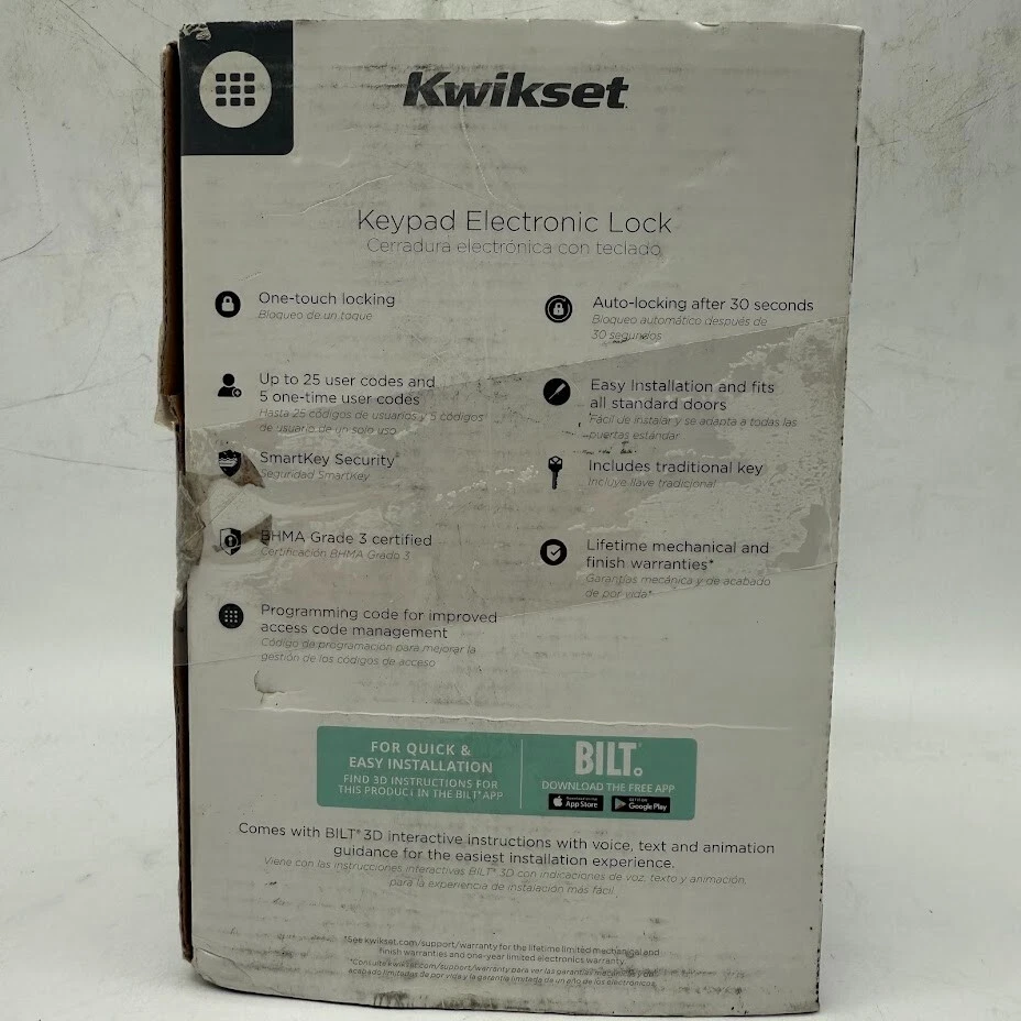 This is a NEW OPEN BOX item. Enhance your home security with the Kwikset Powerbolt 250 10-Button Keypad Electronic Deadbolt. Featuring keyless entry, customizable user codes, and built-in security functions, this lock offers both convenience and peace of mind. Its transitional design blends seamlessly with any décor, and installation requires only a screwdriver. Key Features: Keyless Entry – Securely lock and unlock your door using a personalized code or a key Customizable User Codes – Store up to 25 user codes and 5 one-time codes for added flexibility One-Touch Locking – Simply press a button to lock the door instantly Auto Lock Function – Set the lock to automatically engage after 30 seconds, 1, 3, 5, or 10 minutes Wrong Code Alarm & Lockout – After multiple incorrect attempts, the lock disables the keypad for added security Vacation Mode – Temporarily disables the keypad to prevent unauthorized access while you're away Illuminated Keypad – Light-up buttons ensure easy visibility in low-light conditions Long Battery Life – Operates for up to 12 months on four AA batteries (not included) Easy Installation – Installs in minutes with just a screwdriver; BILT app provides step-by-step 3D guidance With a balance of style, security, and simplicity, the Powerbolt 250 is a smart choice for modern home access control. We take great care to inspect all items and ensure they are accurately described. Should you have any issues with your purchase, please let us know immediately. We are committed to resolving any concerns promptly and to your satisfaction. Our small business truly appreciates your patronage.