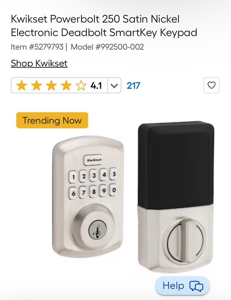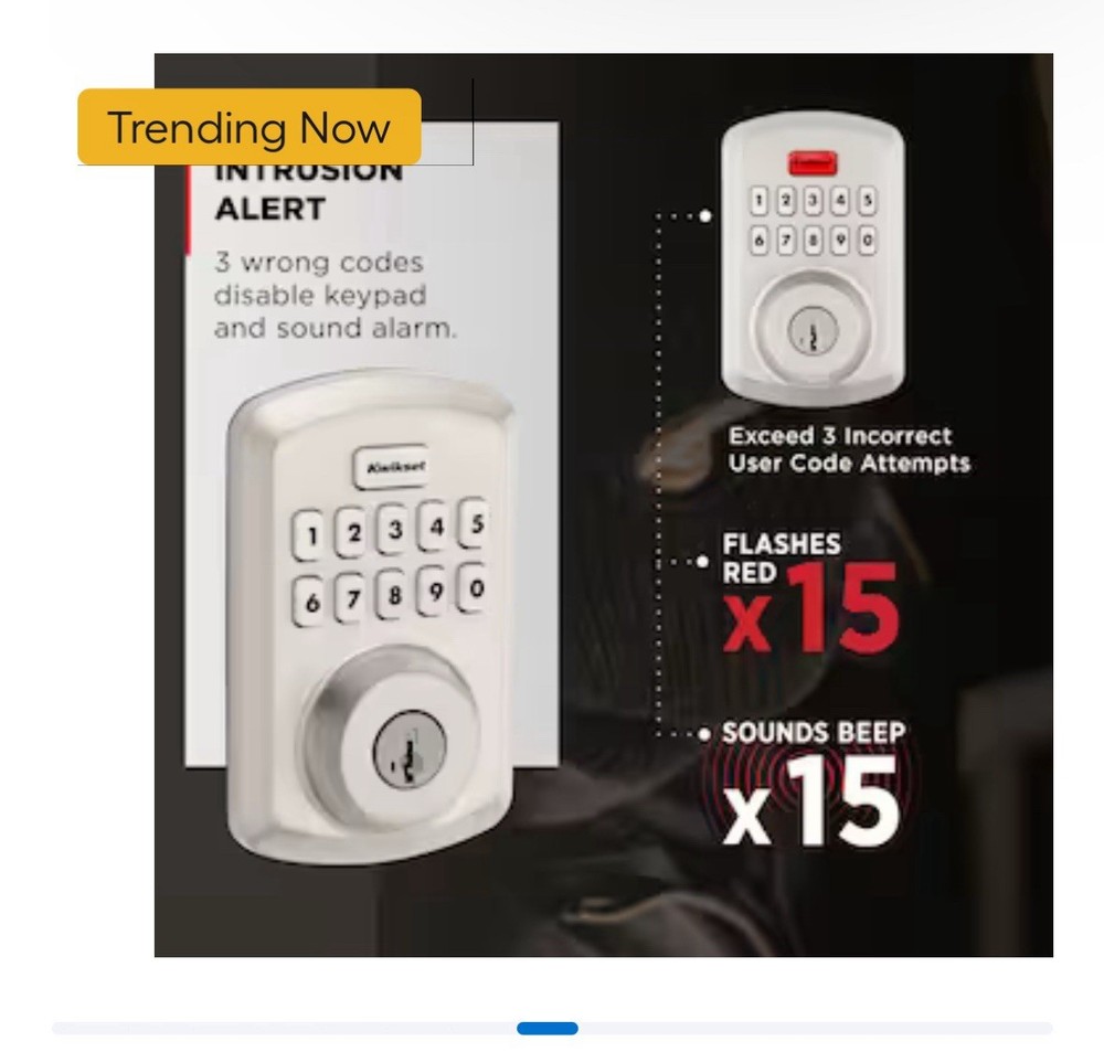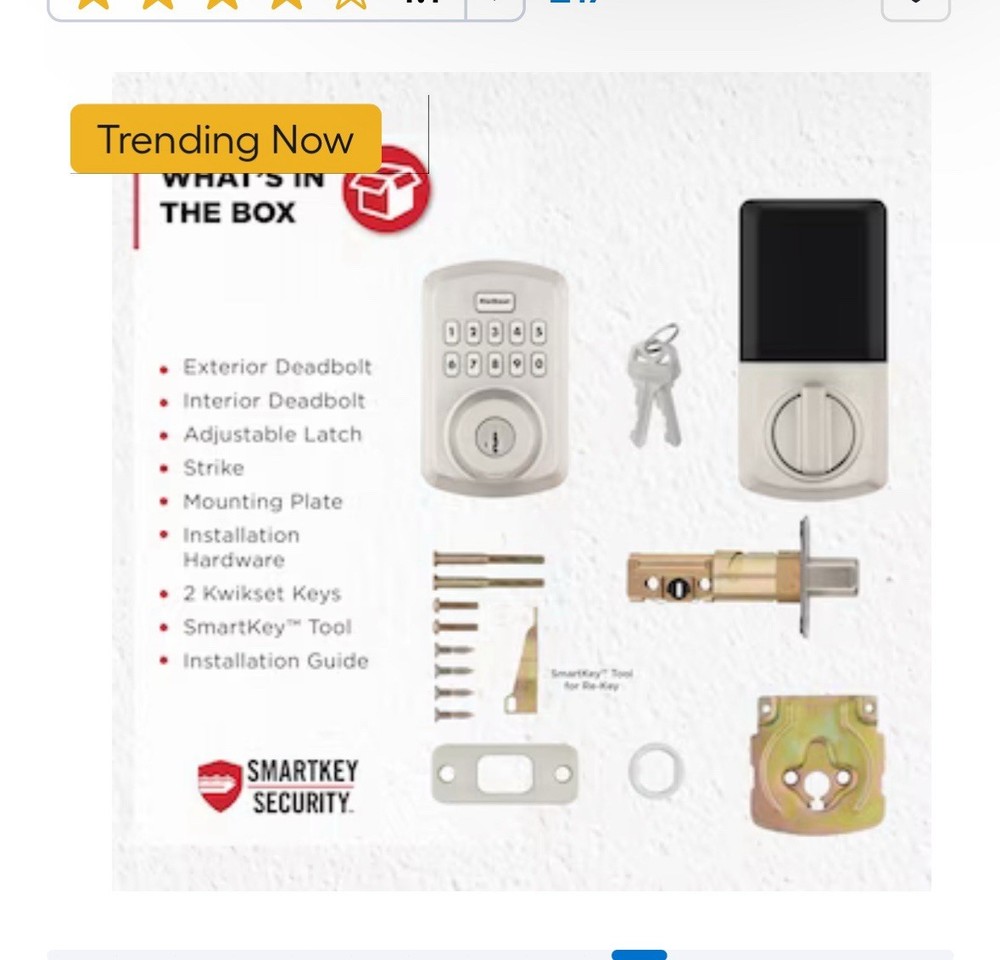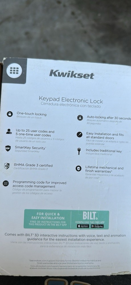 New opened box Kwikset Powerbolt 250 Satin Nickel Electronic Deadbolt SmartKey Keypad KEYLESS ENTRY: Makes coming and going secure and convenient. EASY CODE MANAGEMENT: Customize up to 25 user codes, 5 one-time user codes and 1 programming code that lets you edit or delete user codes whenever you need to. AUTO LOCK: Peace of mind with customizable, automatic locking. INTRUSION ALERT: 3 wrong codes disable keypad and sound alarm. EASY LOW LIGHT CODE ENTRY: Bright LED light up keypad. VACATION MODE: Disable the keypad when you're out of town. FEATURING SMARTKEY SECURITY: Re-key the lock yourself in seconds. 12-MONTH BATTERY LIFE: 4x AA alkaline batteries (not included). EASY INSTALL and BILT App: Easily install with screwdriver.