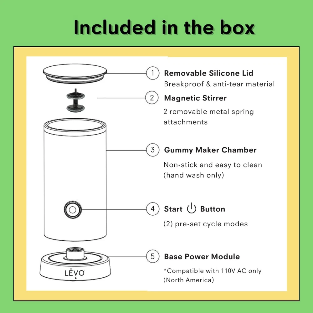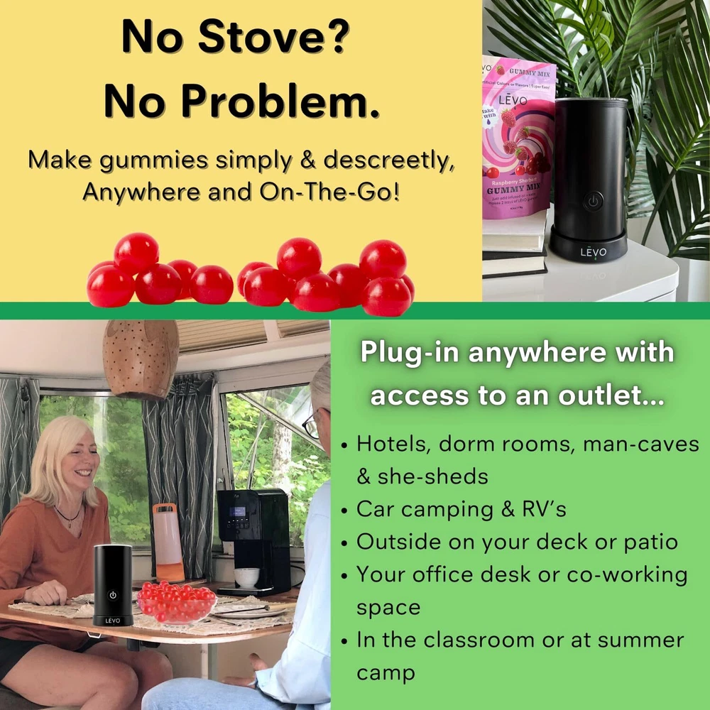 LĒVO Gummy Candy Mixer Say goodbye to gummy fails! The LĒVO Gummy Candy Edibles Mixer makes delicious homemade gummies in just a few simple steps so you can get perfectly potent gummies at home every time! The LĒVO Gummy Candy Mixer makes DIY gummy making as easy as making coffee! No more standing over a hot stove, handheld mixers or burnt gummy mix! The LĒVO Gummy Candy Mixer does all the hard work for you. Constant stirring, precise temperature and time controls, and a non-stick, easy to clean surface means you get the perfect homemade gummy candy every time! Made to work perfectly with any LĒVO Gummy Candy Mix and your infused LĒVO II or LĒVO C oil or butter so you can control the dosage and potency of your edibles at home! Once your gummy mix is done, use your LĒVO droppers to transfer your gummy mixture to the LĒVO silicone Gummy Molds without making a mess or wasting a drop of your delicious infusions! Eliminate the stress and the mess of DIY gummies with the LĒVO Gummy Candy Mixer! Join the infusion revolution. Make sure to look for all of our herbal infusion products available on Amazon. The LĒVO Gummy Candy Mixer is the foolproof solution to making gummies with precise temperature and time and without a saucepan and whisk! This machine takes the hard work out of stirring so no more standing over a hot stove or burnt gummy mix. You can even make it on the go anywhere where there's an outlet! It’s easy to clean and ensures the perfect gummy candy every time, making up to 1 package of LĒVO Gummy Mix per batch. MAKE YOUR OWN INFUSED GUMMIES: Take the fuss out of making DIY gummies and say goodbye standing over a hot stove with burnt gummy mix! With the LĒVO Gummy Candy Mixer, you can use your custom homemade infused MCT or Coconut Oil to craft gummies at home and experiment to find your desired potency! PERFECT DIY GUMMIES EVERY TIME: The LĒVO gummy mixer takes all the hard work out of whisking, stirring and keeping an eye on your gummy candy mix on the stove! Set it and forget it! It’s the foolproof solution to making gummies with precise temperature and time settings so you can get perfect infused gummies at home every time. The mixer has customized firmware that mimics the same process you would follow on the stove- but automatically and hands-free! EASY TO USE: Add your favorite LĒVO Gummy Mix Flavor to the Gummy Candy Mixer, mix in 6 tablespoons of water, then press start. The cycle will heat up for 7 minutes BEFORE beginning to stir, then it will automatically stir for 7 minutes after it has been heated. Then mix in 4 tablespoons of infused oil, hold the button for 3 seconds to begin the second cycle to stir in the infused oil into your candy mix. When the cycle is complete, dispense your mix into candy molds and you’ll have DIY edibles FIND YOUR DESIRED POTENCY: Take control of the potency of your gummies easier than ever before! Add 4 tablespoons of oil for stronger gummies, or 1 tablespoon for less potency so you can eat more gummies at a time! The LĒVO Gummy Candy Mixer features precise temperature and time control so all the guesswork is removed. Whether you’re wanting an extra potent treat or maybe just a bit less, the LĒVO Gummy Candy Mixer makes the perfect edible every time.