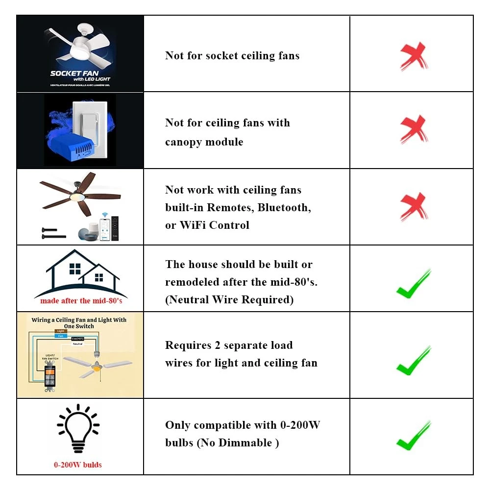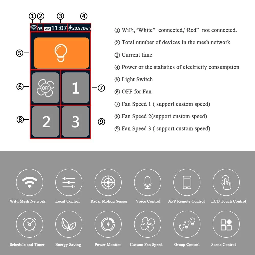 smart light switch đă3 Custom Fan Speed Buttonsă The fan speed wall switch with 3 custom speed buttons sets your exclusive speed and gets rid of the fixed speed zipper. đăWorks w/ All Bulb Typesăthe ceiling fan light switch work with 0-200W all bulb types such as 200W Incandescent/Halogen, 200W LED/CFL/MLV/ELV Bulb. đăEase of Installation & Ste-upăThe wifi fan light switch is standard size. It is the ease of installation & simple set-up. Also, it allows you to customize the light name, icon, button color, and background. Set them to cater to your preferences and your home style. đăSet Timers & SchedulesăSmart fan controller& ceiling light switch with timer repeats to support you in setting daily timer schedules or countdowns to automatically turn on and off while you're home or away. đ±ăControl from AnywhereăThe APP monitors the status of your smart switches and turns it on/off from anywhere, whether at home, in the office, or on vacation. đăVoice ControlăUse simple voice to control the light and fan. đăSmart ActionăA part of the 'Smart Livingâ series Smart Ecosystem, the smart switch works with other 'Smart Livingâ series devices so you can set smart actions and groupings with your other 'Smart Livingâ devices.