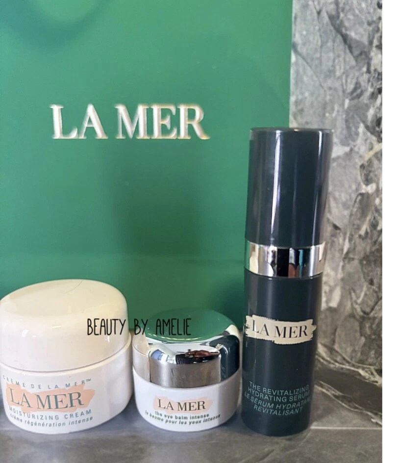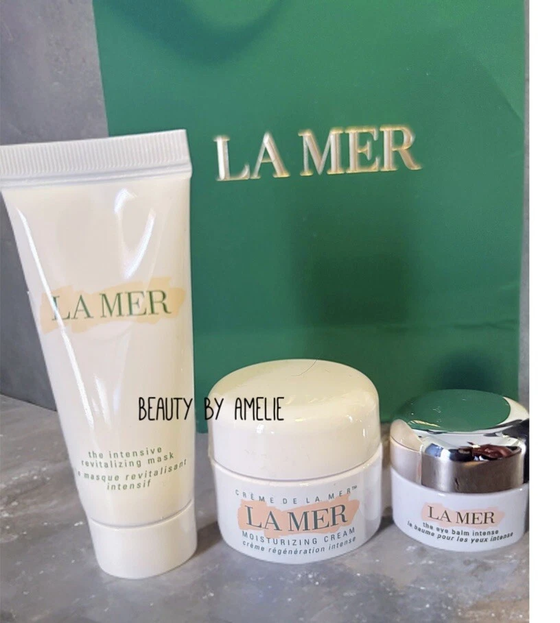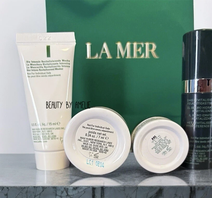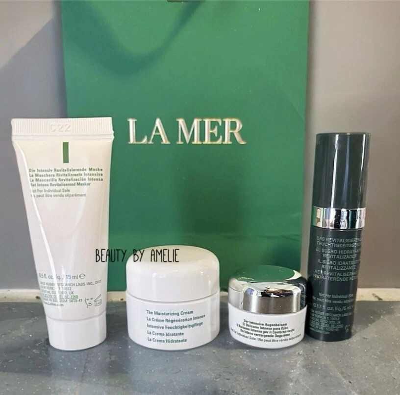 Deluxe samples of: The Eye Balm Intense Cream (3 ml.), Crème de la Mer Moisturizing Cream (7 ml.), The Intensive Revitalizing Mask (15 ml.) The Revitalizing Hydrating Serum (5 ml.) Small gift bag (bag has a few creases from shipping)