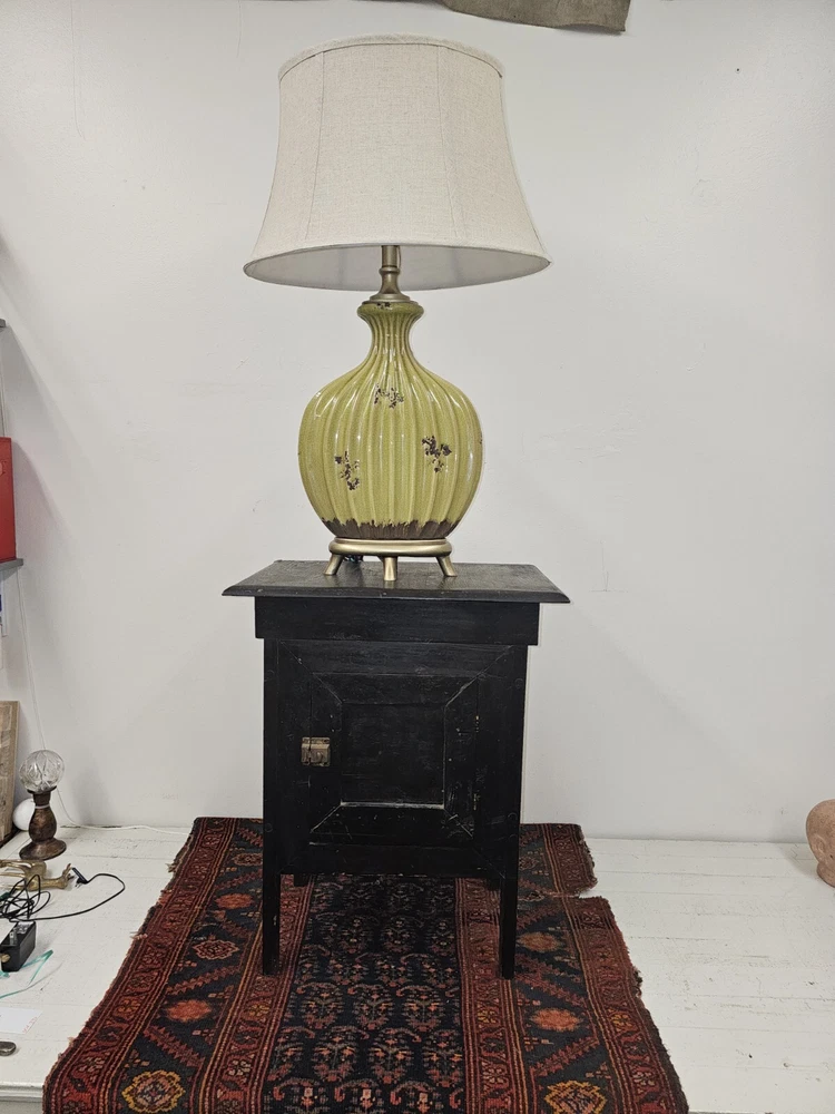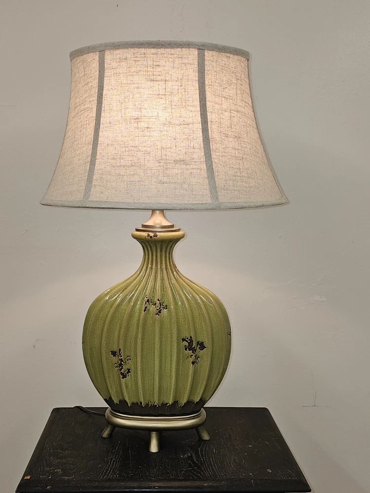 2 Uttermost ceramic lamps with weighted bases. The whimsical style works well with mid-century, bohemian, or maximalist decor. The unique profile of these lamps gives them the visual mass to make a decorative statement, while not filling up an entire side-table with their bulk. Height to the base of the bulb is approximately 24 inches. Each lamp has a three-way switch. These lamps are excellent for mood lighting as well as reading. Lamps are sold as a pair with shades and will ship in two boxes. Lamp are heavy and safe packing means an oversized box. Lamps can be picked up in Halifax, VA. The lamp body is 13 in wide and 4 1/2 to 5 in deep. It is ribbed avocado green glazed ceramic with distressed dark brown accents. The base is weighted it is antique gold colored to match the neck and finial. Oval lined shades are covered in course linen-look material.