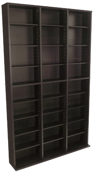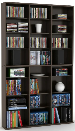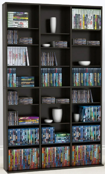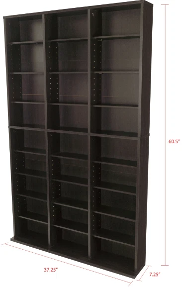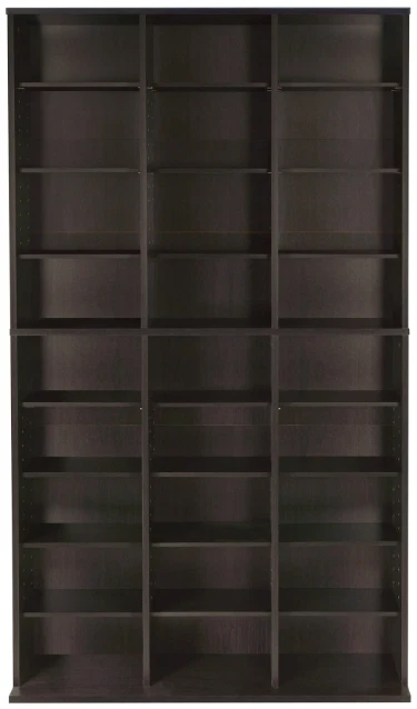 Showcase your extensive collection of CDs, DVDs, Blu-rays, games, and books without sacrificing your living space. This stylish, tall, and wide espresso-colored unit offers plenty of storage and a coastal vibe, perfect for any room. Massive Storage Capacity: 414 Blu-ray discs 360 DVDs 756 CDs 9-tier, 3-column design Adjustable shelves Enhanced Stability: Extended base Wall anchor kit included Durable Construction: Sturdy frame