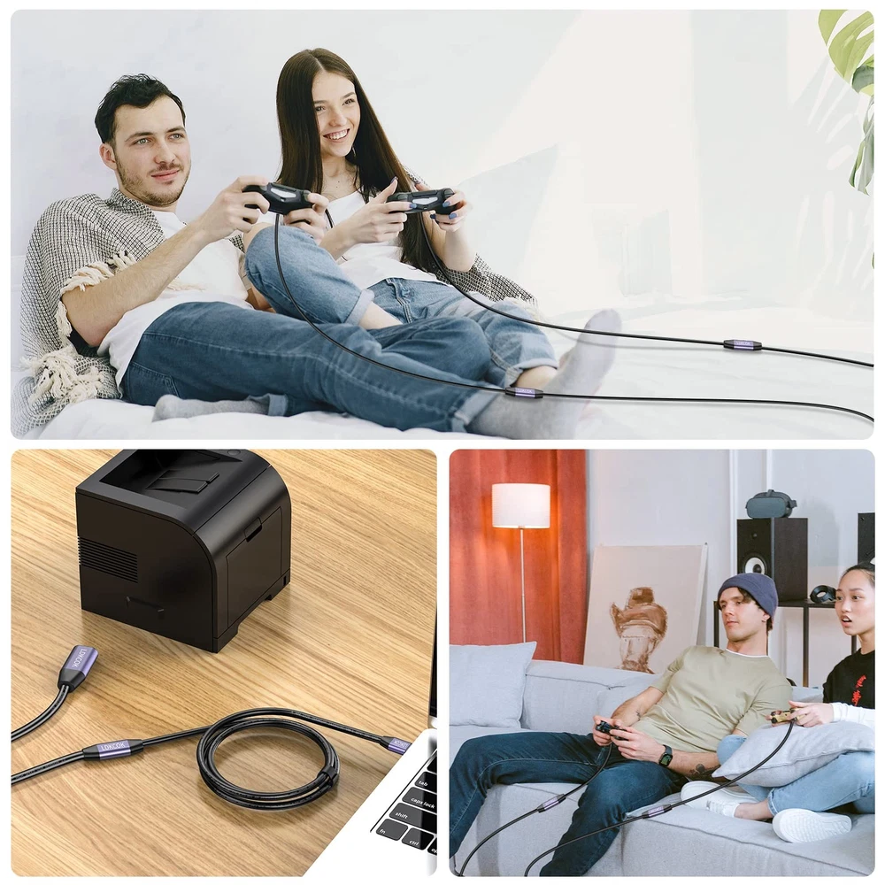 π USB Active Extender: USB 2.0 active extension cable provides the convenient way to extend your USB peripherals to computer, Wireless Network Adapter, 4G/5G Network Adapter, Wifi Receiver, Printer, Scanner, Camera, USB display Adapter, Mouse, Keyboard, USB flash drive, PS controller and other computer peripherals. This product is equipped with USB A auxiliary power supply line, which can be used in more application scenarios. Important Note: It cannot be used for charging devices. π Fast Data Transfer: This USB repeater cable supports high speed USB 2.0 data transfer rate up to 480 Mbps. Built in low-power signal booster chipset, which works peak performance with minimum signal loss and It is not hot to work long hours. π Super Performance: Thick gold-plated AWG#2824 copper core decreases the transfer impedance and ensures the stutter-free signal transfer. The triple-shielded (foil/braid/ground) provides the maximum resistance from EMI/RFI and superior signal quality. π Upgraded Connectors: USB extension cable with anodized aluminum treatment metal shell, provides you a perfect metal texture and a good touch feeling. Ensure the extreme durability and no discoloration in long-term use, the gold plated connectors with a good corrosion-resistant and anti-oxcdation, effectively prolong usb cable service life. π Universal Compatibility: This USB extension cord is widely compatible with USB peripherals, such as connecting to Hubs, Playstation, Xbox, Keyboard, Mouse, Printer, Scanner, Camera, TV, USB flash drive, SSD, HDD, Card reader, Dard drive,Laptap and PC without data delay or data loss.
