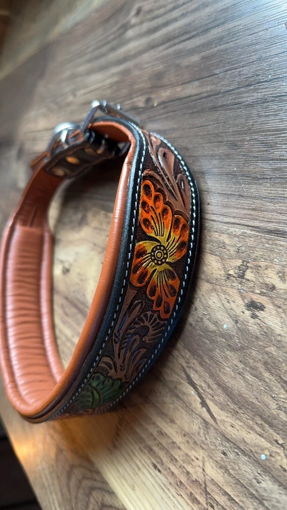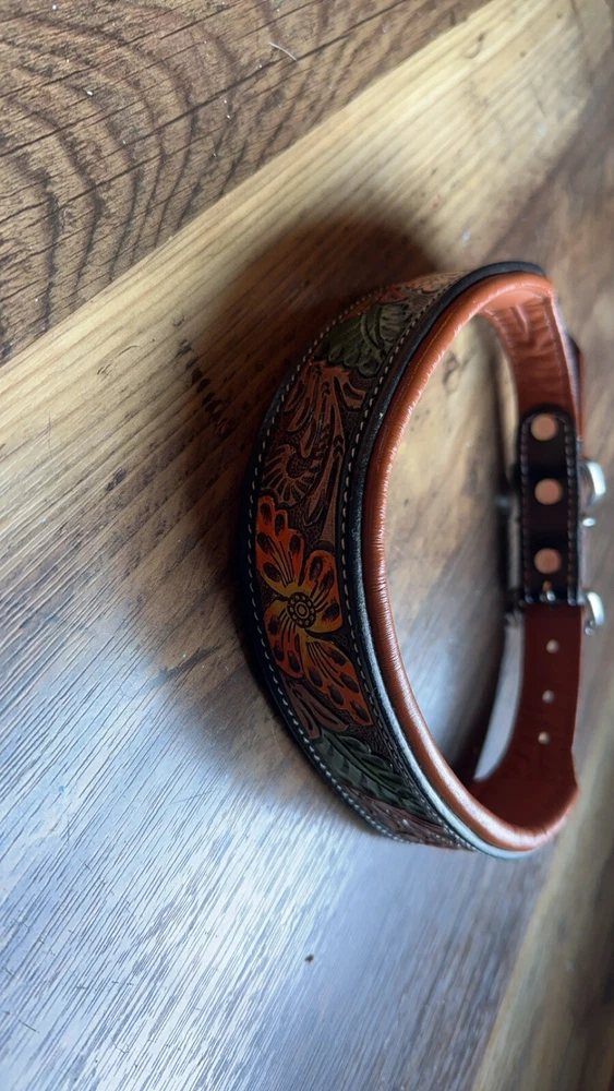 LEATHER DOG COLLAR Hand Tooled Brown Orange/green Flowers (size XL)