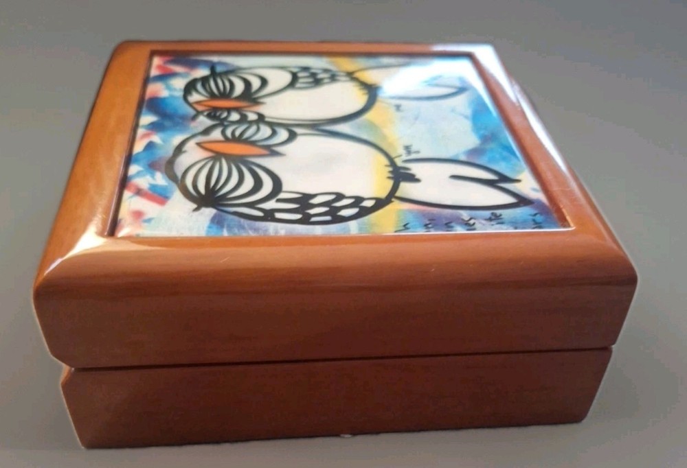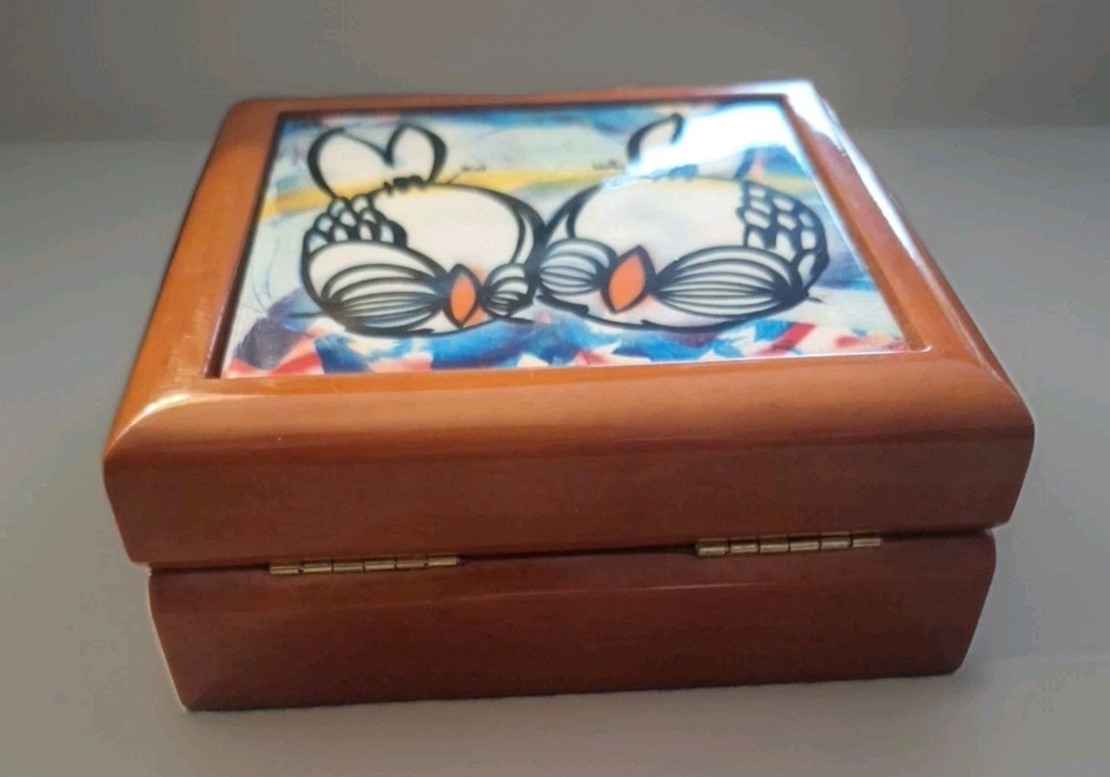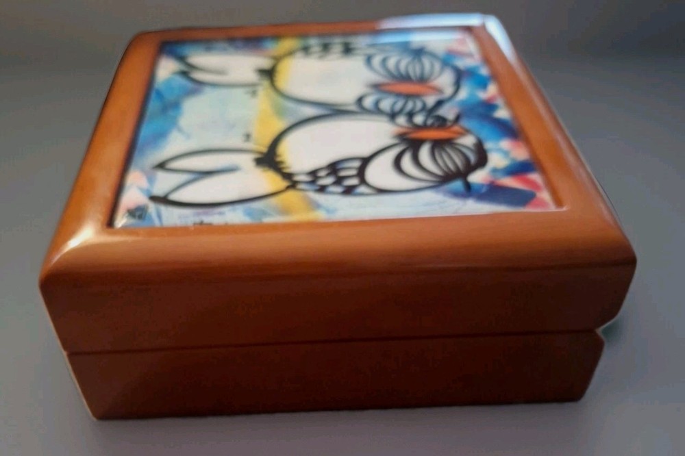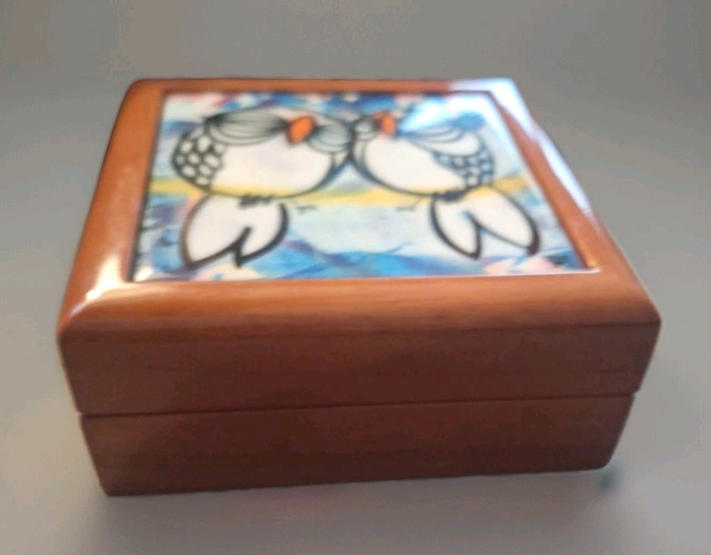 "YOU AND ME TOGETHER FOREVER" Love Birds Ceramic Tile Treasure Box, crafted by the late Floridian artist David Le Batard (LEBO). This fun piece has a playful, novelty style that's sure to bring a touch of charm to any collection or display. The top of the box is made from ceramic and porcelain, wooden bottom base. The artist's signature is on the lower right corner of the piece. The item is is excellent used condition with no chips, nicks, scratches or discoloration. The box measures approx 5 1/2" x 5 1/2" 14cm×14cm. UC3