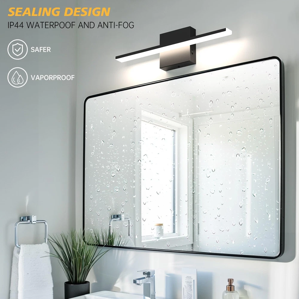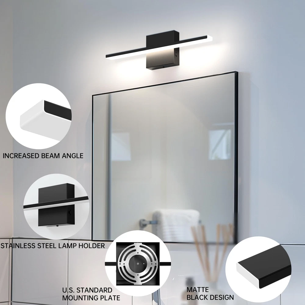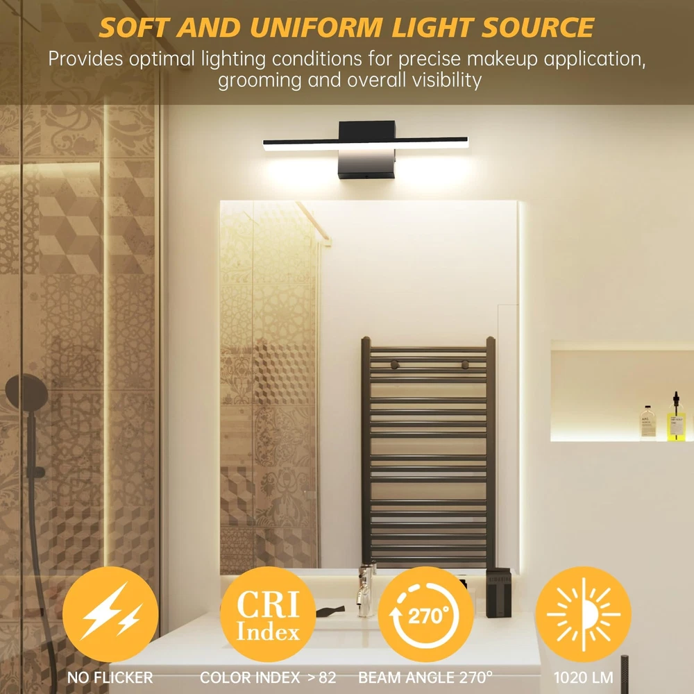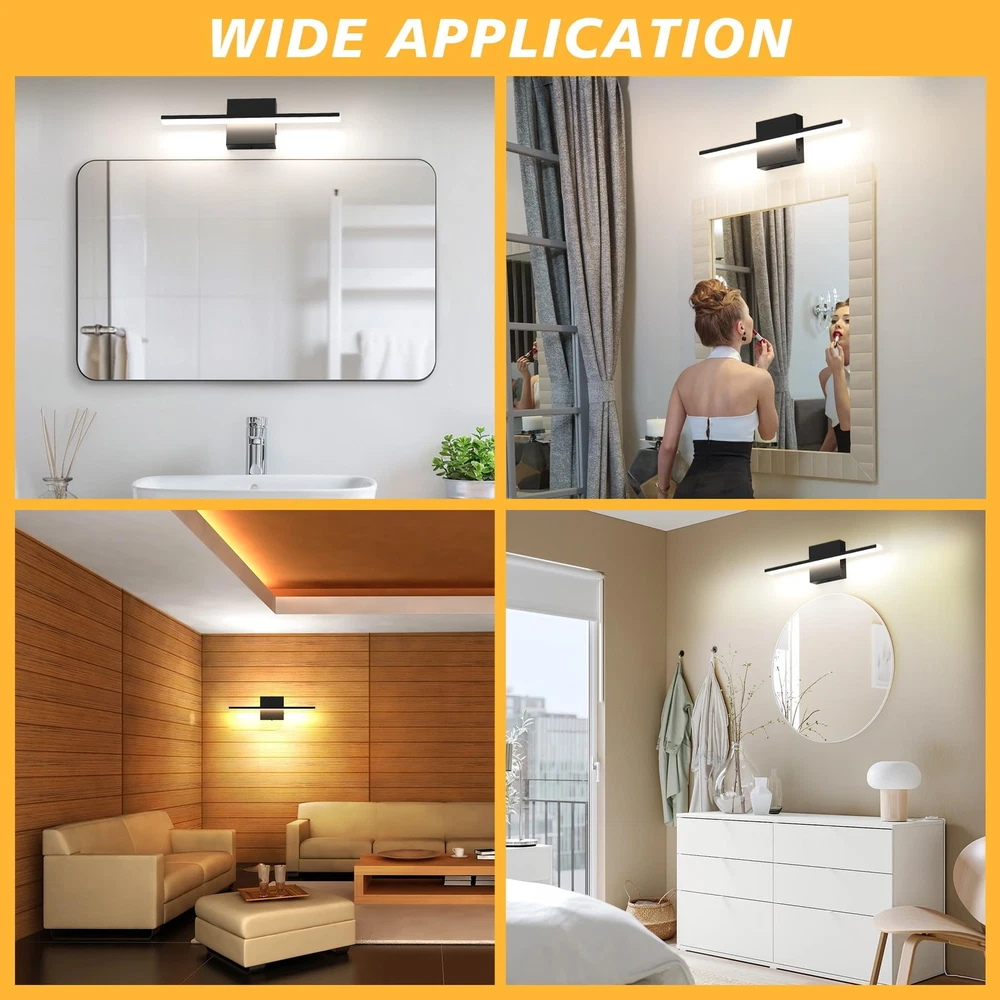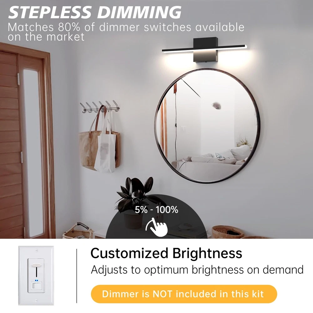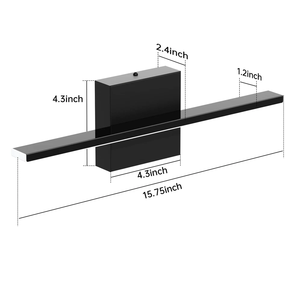 【Bathroom vanity light bar specifications】 Length 15.75 inch * Height 2.48 inch (40cm* 6.3cm).The luminaire has a power of 12w and produces 1020 lumens. Bathroom vanity light can evenly project soft and clear light, reducing eye fatigue and enhancing your grooming experience. 【Adjustable Light Temperature】Adjust the color temperature of the vanity lights for mirror according to the environment and your needs (2700K/3000K/4000K/5000K/6000K). Dimmable mirror light helps mimic natural daylight or warm indoor lighting, providing you with the ideal lighting environment. 【Customized Brightness】The bathroom vanity lights over mirror can be smoothly dimmed from 5% to 100%, and is compatible with most dimmers on the market. Adjusting to the right brightness is also a convenient way to save energy when you don't need full brightness. (Warm tips: dimmer switch is not included in this kit) 【Minimalist design】The bathroom light fixture feature a simple and smooth line design, making them suitable for use in various spaces such as bathrooms, vanity mirrors, dressing rooms, and living rooms. Whenever and wherever you are, vanity lights provide the right lighting to restore your charm. 【Easy Installation】The bathroom vanity lights requires hardwiring and comes with a U.S. standard Installation backplate. Simply connect the reserved wires directly.If you have any inquiries regarding our bathroom light fixtures, please do not hesitate to contact us.