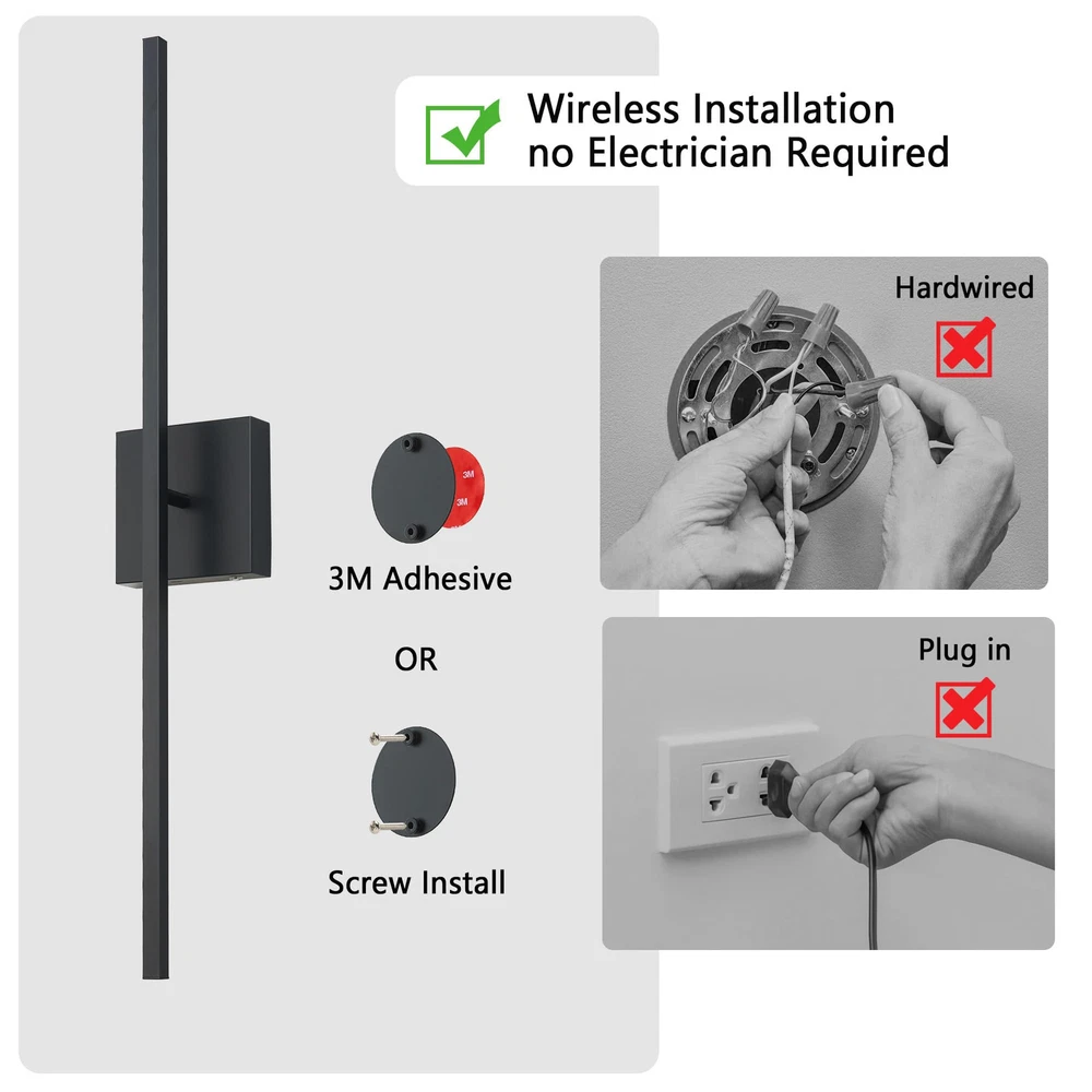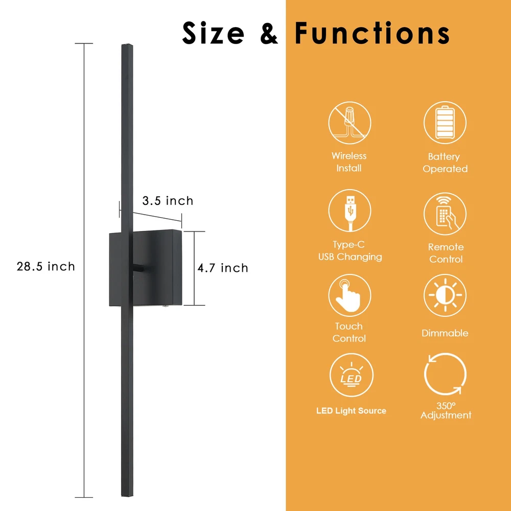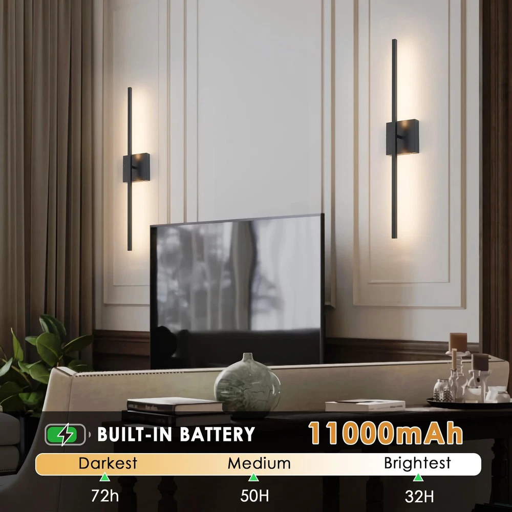 Cordless Moveable Chargeable LED Linear Wall Lights Set of two with Remote Control, non Hardwired, 28.5 Inch (2 Pack) 【Rechargeable Wall Sconce】With the 11000mAh battery, the lighting time can last for 24-72 hours on a full charge, The battery is rechargeable with USB charging cable(Suitable for Type-C port, charging plug excluded) 【Wireless Wall Lights】2 Pack wireless matte black sconces, Require no wiring and no electrician, It can be mounted on any wall you want to illuminate easily. 【Remote control & Touch Control】Battery-operated sconces with a multi-function remote control, providing a variety of modes of choices to meet your different needs for lighting requirements. You can also manually touch the switch button to control the light. 【3000K Dimmable Wall Sconces with Wide Applications】Cordless removable wall sconces with stepless dimming. It can be assembled in any corner of the home to provide fascinating lighting or used as emergency lighting during power outages. Ideal for living room, bedroom, corridors, hallway, stairway, entryway, dining room, office, dressing table, TV wall, and other places. It' s also perfect for being a holiday gift to deliver a convenient and warm lighting experience for your friends. 【3 Years Guarantee】We provide 3-year guarantee period for all of our products. You can contact us through Amzon for any problems that arise during usage.