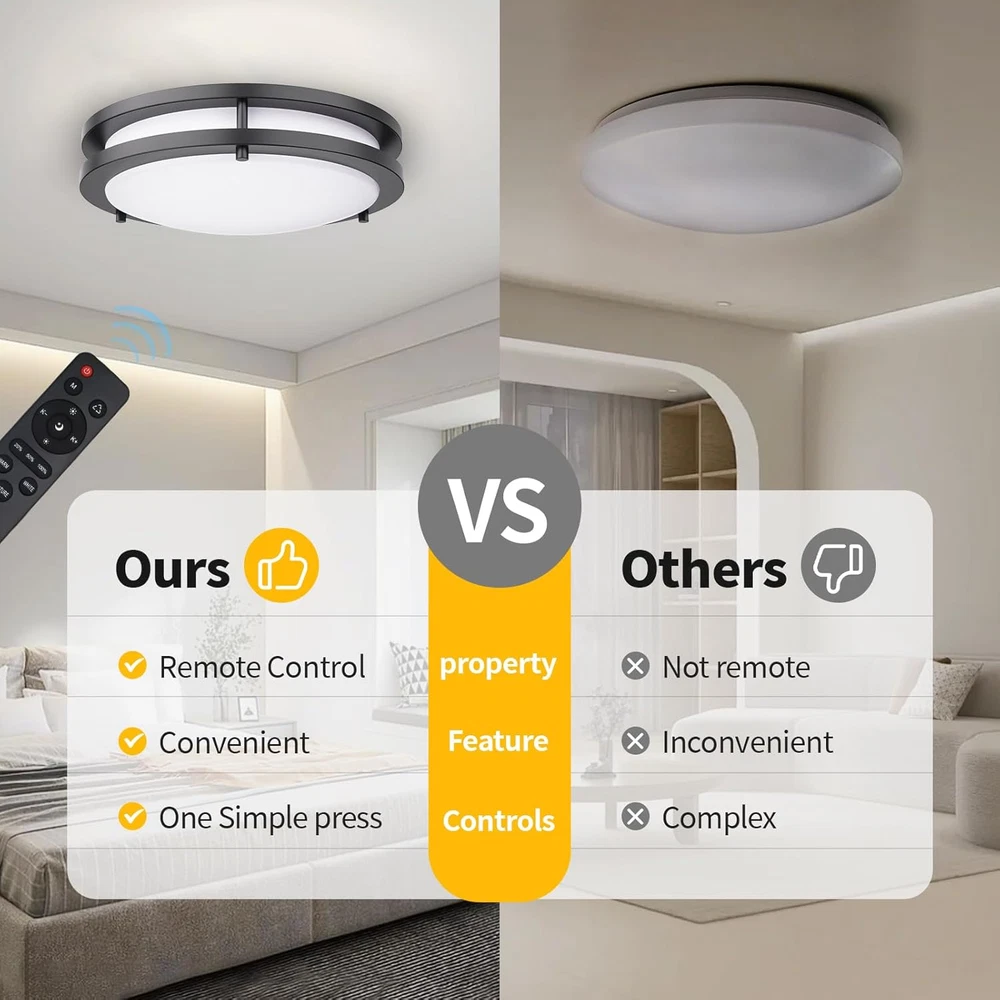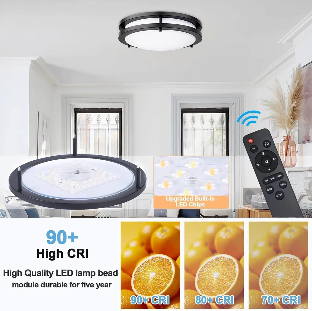 10 Meter Remote Ceiling Light: Ceiling lights with a remote control 10 meters away, making the control of lighting becomes more convenient, without touching the switch can easily adjust the brightness and color temperature of the light, led lights for bedroom and meet the lighting needs of different occasions and times 3CCT Long-lasting Durability: Our LED flush mount ceiling light support dimming function, can be adjusted to 20%, 50%, 100% lighting intensity according to demand, respectively corresponding to cold light, warm white, warm light mode, wide color temperature range, from 2700K to 6500K, lumen enough, The service life is up to 43,000 hours, reducing the frequency of replacement and saving maintenance costs High Quality LED Lamp Beads: This ceiling light fixture use of ETL certified materials to ensure product quality and safety. Equipped with high-quality LED lamp beads, no noise, no flicker, to provide a comfortable lighting environment, adapt to various scenes such as living room, bedroom, kitchen, bathroom, dining room, hall and other places Easy Installation: Our remote control ceiling lights are well designed, and the related installation accessories and instructions are fully equipped, kitchen lighting fixtures ceiling easy to install, without complex tools or cumbersome steps, quickly complete installation, and bring users a convenient experience of living room lights ceiling After-Sales Service Commitment: Kalium Ceiling light provides premium customer service, please contact us anytime anything, we will deal with you within 24 hours Product Description