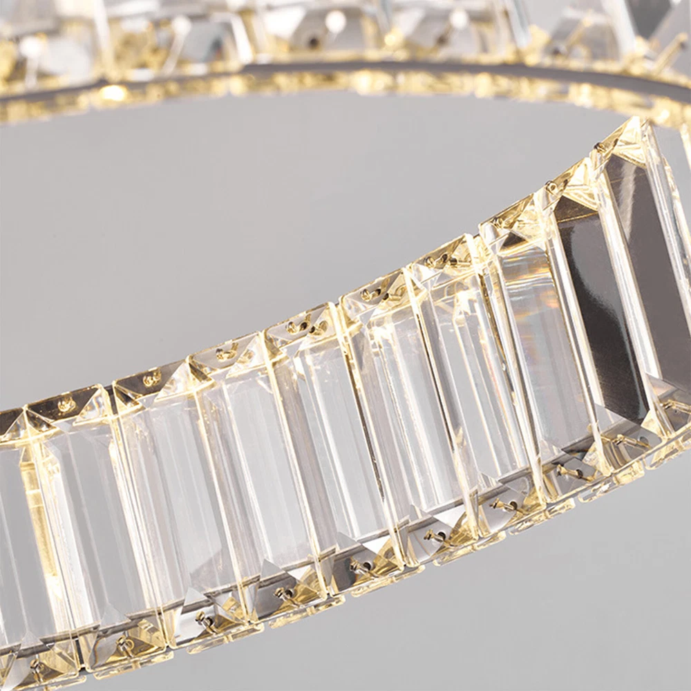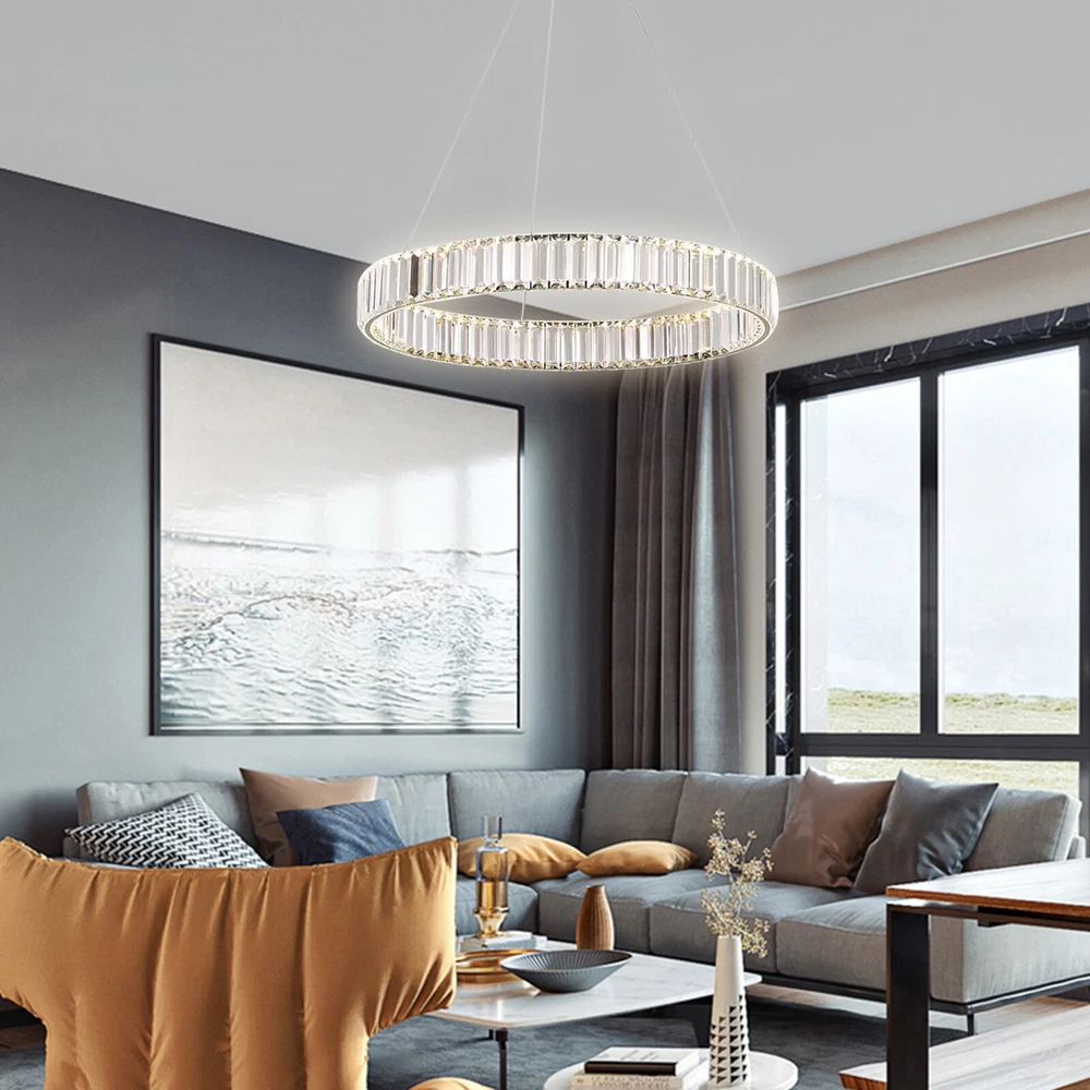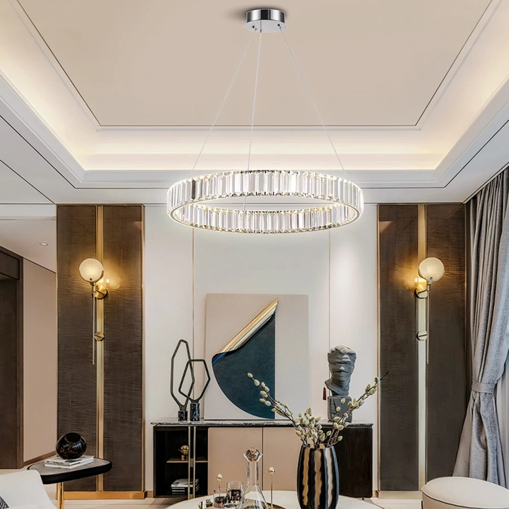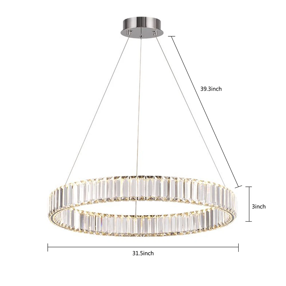 About this item 【HIGH QUALITY MATERIAL】: This creative pendant chandelier features a well-made metal structure combined with hand-picked multi-faceted cutting K9 crystals, durable, anti-corrosion no-fading。sparkling crystals refracting light in multiple angles, which make this chandelier fairy glittering and shinning to your house. 【LUXURY GOLD HANGING LIGHT DIMENSIONS】: Diameter31.5" x Height 3". The overall hanging height is adjustable from 19" to 39.3". This glittering hanging crystal light fixture will add elegance and ambiance lighting to your living room, dining room, kitchen island, bedroom, foyer, etc. 【3-COLORS CHANGEABLE LED CHANDELIER for DINING ROOM】: Built-in high-bright 48W 3-Color LED strips, AC 110V. The color temperature could be changed from 3000K to 4500K and then 60 LED Crystal Chandelier Ring Pendant Lamp Ceiling Light Hanging Light About this item 【HIGH QUALITY MATERIAL】: This creative pendant chandelier features a well-made metal structure combined with hand-picked multi-faceted cutting K9 crystals, durable, anti-corrosion no-fading。sparkling crystals refracting light in multiple angles, which make this chandelier fairy glittering and shinning to your house. 【LUXURY GOLD HANGING LIGHT DIMENSIONS】: Diameter31.5" x Height 3". The overall hanging height is adjustable from 19" to 39.3". This glittering hanging crystal light fixture will add elegance and ambiance lighting to your living room, dining room, kitchen island, bedroom, foyer, etc. 【3-COLORS CHANGEABLE LED CHANDELIER for DINING ROOM】: Built-in high-bright 48W 3-Color LED strips, AC 110V. The color temperature could be changed from 3000K to 4500K and then 6000K. You can change the light color by repeatedly pressing the ON/OFF switch to achieve different ambiances. Working voltage: 110-120V,50/60Hz Lumens:2200 lumens Light color:3000K-4500K-6000K Material: Stainless steel + Crystal Glass Light Body Color: Chrome finish Light Source: SMD2835 led chip, above CRI 80 index Wide applications: Modern and elegant design rustic chandelier, ideal for pendant lights in living room, kitchen island lighting, bedroom mini chandelier, study room hanging light fixtures, foyer small chandelier, etc. Package Content: 1 x Crystal Chandelier 1 x Instruction manual 1 x Hardware bag Installation Instruction: ①For your safety, Please turn off the power before installation ② Please check parts against the packing list to see if the accessories are available. ③We provide install instructions for you. please referred to install manual or have a professional electrician. If need any help, please contact us. Payment Delivery details Terms of sales About us Contact us Payment We accept ebay payment 。 Fees such as import duties, taxes are not included in the item price or shipping costs. These charges are the buyer's responsibility. Delivery details Shipping: 2-9 working days to: USA Terms of sales We maintain high standards of excellence and strive for hundred percent customer satisfaction. Feedback is very important to us. We hope that you contact us immediately before you give neutral or negative feedback, so that we can address your concerns. It is impossible to address issues if we do not know about them! About us Your satis faction is our ultimate goal. We work hard to earn your trust and future business. Our certified technicians have tested each item before shipping. The unit comes with 1 year limited warranty on all manufacturing defects. a) If you receive a defective item, you may return it or ask for a discount. Please contact us within 14 days after you receive the package. b) What you returned must be intact and in its original packaging as re? u. Customer is responsible for shipping costs of the returned item. c) We will cover the cost of shipping back t with the shipping rate indicated in the registration page. We will send you a new unit or refund the full payment you paid. Thank you. Contact us Business Hour Business Hour: Monday To Friday: 8:30 AM to 5:00 PM (Beijing China time) Due to time zones, our reply to your questions may not be immediately. But within above working time, we will reply your email within 24 hours. If it's non-workdays, please kindly be patient and wait till Monday. Please contact us with ebay message. Please feel free to contact us if you have any questions. Monday To Friday: 8:30 AM to 5:00 PM (Beijing China time) Due to time zones, our reply to your questions may not be immediately. But within above working time, we will reply your email within 24 hours. If it's non-workdays, please kindly be patient and wait till Monday. Please contact us with ebay message. Please feel free to contact us if you have any questions. * Feature * Creative Design,Durable Material,Beautiful Appearance Note: Do not send to Brazil Bundle Description: No Feature 1 *Stable characteristic*, *high reliability* shipping notice Can not ship to Puerto Rico,Alaska/Hawaii Item location: CA /NJ /Austell Transportation does not include: canarias shipping notice: Can not ship to Puerto Rico,Alaska/Hawaii Light Direction Downwards Features Height-Adjustable, Energy saving, Long lifespan Installation Area Indoor Shade Shape Round Color Silver Light Color Warm light-Warm White- White Room Bedroom, Dining Room, Garage, Hallway, Home Office/Study, Kitchen, Laundry/Utility Room, Living Room, Bar, Playroom, Porch, Utility/Laundry Room Material Crystal, Stainless Steel Lighting Technology LED Style Contemporary Sensor Type Light Brand Unbranded Power Consumption 25Watt Working voltage 110-120V 50/60Hz Lumens 1500 lumens Light Body Color Chrome finish Light Source SMD2835 led chip, above CRI 80 index Type Ceiling Light Item Diameter 31.5 inches Finish Chrome Theme Art Voltage 110-120V