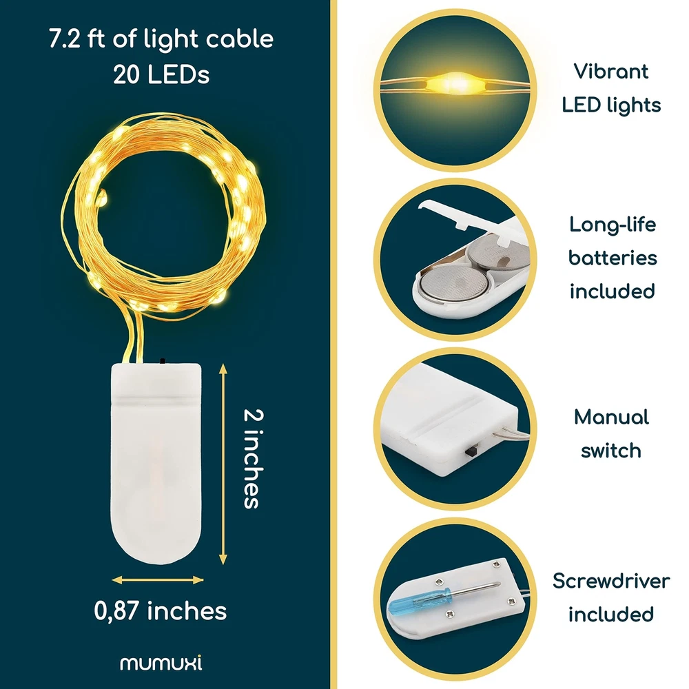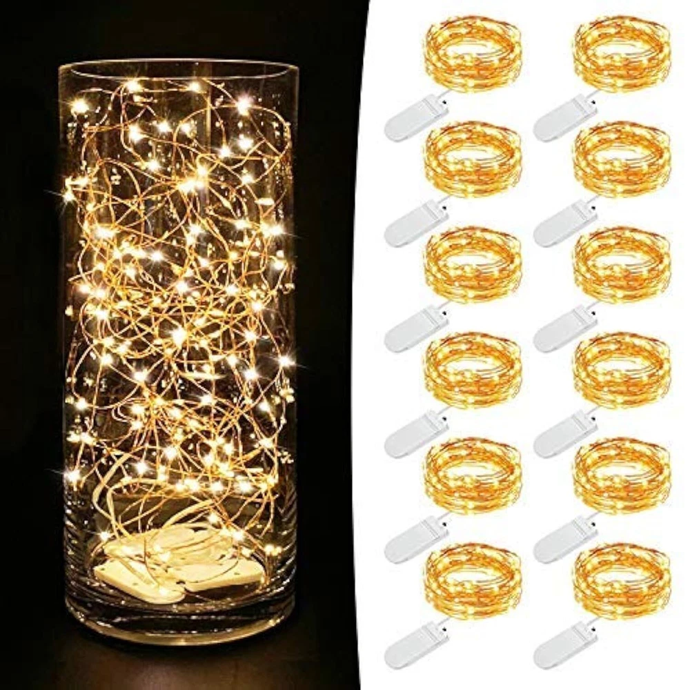 Decorate your life and home with the Fairy String Lights. Widely used with these string lights These lights look like many beautiful fire flies, and the copper wire is extra flexible, You can decorate teenager or girls 's rooms to enjoy ambience of relaxing, decorate your wedding to memorize your important and romantic moment, decorate it in restaurant or shop, create welcome feeling, customers will be attracted by the twinkle String Lights,walk into shop or restaurant, stay longer, enjoy their commodity or food and love your shop or restaurant. You can also decorate your party to feel more joyful, decorate holidays and Christmas to enjoy happy times.With extra flexible copper wire, you can put these led fariy lights in the glass jar,vase, or you can easily bend and shape it around wreaths, trees, flowers, and almost everything else. Not Over Heat: Low current ensures that the copper wire will not overheat. You and your family can fully enjoy the lights without worrying about being hurt. Waterproof Except Battery Box. Only the copper wire parts are waterproof and can be soaked into water; battery case is not waterproof and better be kept away from water., suitable for both indoor and outdoor lighting decorations. NOTE: The battery box is NOT waterproof. Introductions: 1.Total length per string: 2M /7.2 feet 2.Led Qty per light: 20 pieces 3.Power Supply: 2x CR2032 Lithium Cells (included) 4.Light Color: Warm White 5.Space between LEDs : 10cm / 4 inches 6.Voltage:6V Package includes: 12 PACK Led String Lights (battery Included) 1×Screw driver ★After-sales Service: if you meet any problem, please feel free to contact us for free replacement or full refund. Light up your home - The 12-pack battery operated lights of 7.2ft indoor mini fairy lights is a pretty addition to any home, thanksgiving decorations, christmas decorations, bringing cozy and warm vibes. Add a string of 20 warm white fairy lights to a mason jar to create a lantern or a magical centerpiece table decoration for a wedding or any other party. Durable Material & Easy to bend - Our battery lights are made of high-quality strong copper wire and LED bulbs that can last up to 20 years or more! That’s a whole lot of light to brighten up your space! Place these easily indoors and bend them to your liking, and shape them around plants, furniture, and walls. These small string lights come with long-life batteries as well and the fairy bulbs are made with vibrant LED lights. Easy To Use & Safe To Touch - Each of our products is high quality at and this one is no exception. Save time and effort with replaceable batteries and a tiny on/off switch to turn them on for parties and switch 'em off when everyone leaves. Incredibly low voltage makes these battery fairy lights super safe in your home or place of work and carries no risks. Highly Efficient Long-Lasting Batteries & Easy to Use - With the included batteries, you can supply these fairy lights to stay lit for over 72 hours! With an easy way to turn them on or off by pressing the button, these fairy lights are the perfect way to quickly change your environment from cold to cozy. Comes with a small and easy-to-hide battery box. Take them Indoors or Outdoors - Enjoy these beautiful glowing mini lights inside your bedroom or outdoors on your patio, or balcony. A waterproof and portable option so you can take it with you to your next event. Gift these to your family and friends to appeal to anyone who wants to spruce up their surroundings.